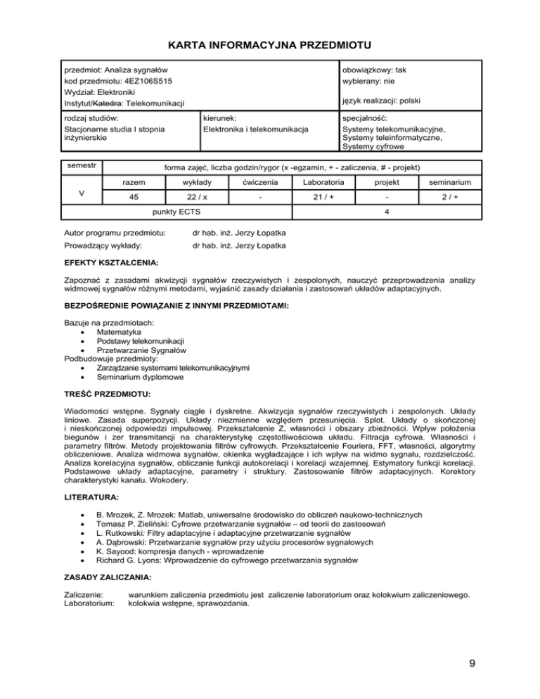 KARTA INFORMACYJNA PRZEDMIOTU przedmiot: Analiza sygnałów kod przedmiotu: 4EZ106S515 Wydział: Elektroniki Instytut/Katedra: Telekomunikacji obowiązkowy: tak wybierany: nie język realizacji: polski rodzaj studiów: Stacjonarne studia I stopnia inżynierskie semestr kierunek: Elektronika i telekomunikacja specjalność: Systemy telekomunikacyjne, Systemy teleinformatyczne, Systemy cyfrowe forma zajęć, liczba godzin/rygor (x -egzamin, + - zaliczenia, # - projekt) V razem wykłady ćwiczenia Laboratoria projekt seminarium 45 22 / x - 21 / + - 2/+ punkty ECTS Autor programu przedmiotu: dr hab. inż. Jerzy Łopatka Prowadzący wykłady: dr hab. inż. Jerzy Łopatka 4 EFEKTY KSZTAŁCENIA: Zapoznać z zasadami akwizycji sygnałów rzeczywistych i zespolonych, nauczyć przeprowadzenia analizy widmowej sygnałów różnymi metodami, wyjaśnić zasady działania i zastosowań układów adaptacyjnych. BEZPOŚREDNIE POWIĄZANIE Z INNYMI PRZEDMIOTAMI: Bazuje na przedmiotach: • Matematyka • Podstawy telekomunikacji • Przetwarzanie Sygnałów Podbudowuje przedmioty: • Zarządzanie systemami telekomunikacyjnymi • Seminarium dyplomowe TREŚĆ PRZEDMIOTU: Wiadomości wstępne. Sygnały ciągłe i dyskretne. Akwizycja sygnałów rzeczywistych i zespolonych. Układy liniowe. Zasada superpozycji. Układy niezmienne względem przesunięcia. Splot. Układy o skończonej i nieskończonej odpowiedzi impulsowej. Przekształcenie Z, własności i obszary zbieżności. Wpływ położenia biegunów i zer transmitancji na charakterystykę częstotliwościowa układu. Filtracja cyfrowa. Własności i parametry filtrów. Metody projektowania filtrów cyfrowych. Przekształcenie Fouriera, FFT, własności, algorytmy obliczeniowe. Analiza widmowa sygnałów, okienka wygładzające i ich wpływ na widmo sygnału, rozdzielczość. Analiza korelacyjna sygnałów, obliczanie funkcji autokorelacji i korelacji wzajemnej. Estymatory funkcji korelacji. Podstawowe układy adaptacyjne, parametry i struktury. Zastosowanie filtrów adaptacyjnych. Korektory charakterystyki kanału. Wokodery. LITERATURA: • • • • • • B. Mrozek, Z. Mrozek: Matlab, uniwersalne środowisko do obliczeń naukowo-technicznych Tomasz P. Zieliński: Cyfrowe przetwarzanie sygnałów – od teorii do zastosowań L. Rutkowski: Filtry adaptacyjne i adaptacyjne przetwarzanie sygnałów A. Dąbrowski: Przetwarzanie sygnałów przy użyciu procesorów sygnałowych K. Sayood: kompresja danych - wprowadzenie Richard G. Lyons: Wprowadzenie do cyfrowego przetwarzania sygnałów ZASADY ZALICZANIA: Zaliczenie: Laboratorium: warunkiem zaliczenia przedmiotu jest zaliczenie laboratorium oraz kolokwium zaliczeniowego. kolokwia wstępne, sprawozdania. 9