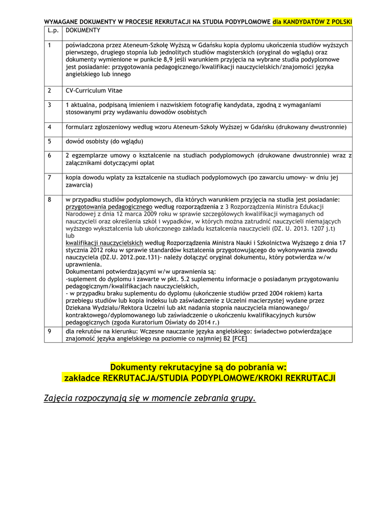 WYMAGANE DOKUMENTY W PROCESIE REKRUTACJI NA STUDIA PODYPLOMOWE dla KANDYDATÓW Z POLSKI L.p. DOKUMENTY 1 poświadczona przez Ateneum-Szkołę Wyższą w Gdańsku kopia dyplomu ukończenia studiów wyższych pierwszego, drugiego stopnia lub jednolitych studiów magisterskich (oryginał do wglądu) oraz dokumenty wymienione w punkcie 8,9 jeśli warunkiem przyjęcia na wybrane studia podyplomowe jest posiadanie: przygotowania pedagogicznego/kwalifikacji nauczycielskich/znajomości języka angielskiego lub innego 2 CV-Curriculum Vitae 3 1 aktualna, podpisaną imieniem i nazwiskiem fotografię kandydata, zgodną z wymaganiami stosowanymi przy wydawaniu dowodów osobistych 4 formularz zgłoszeniowy według wzoru Ateneum-Szkoły Wyższej w Gdańsku (drukowany dwustronnie) 5 dowód osobisty (do wglądu) 6 2 egzemplarze umowy o kształcenie na studiach podyplomowych (drukowane dwustronnie) wraz z załącznikami dotyczącymi opłat 7 kopia dowodu wpłaty za kształcenie na studiach podyplomowych (po zawarciu umowy- w dniu jej zawarcia) 8 w przypadku studiów podyplomowych, dla których warunkiem przyjęcia na studia jest posiadanie: przygotowania pedagogicznego według rozporządzenia z 3 Rozporządzenia Ministra Edukacji Narodowej z dnia 12 marca 2009 roku w sprawie szczegółowych kwalifikacji wymaganych od nauczycieli oraz określenia szkół i wypadków, w których można zatrudnić nauczycieli niemających wyższego wykształcenia lub ukończonego zakładu kształcenia nauczycieli (DZ. U. 2013. 1207 j.t) lub kwalifikacji nauczycielskich według Rozporządzenia Ministra Nauki i Szkolnictwa Wyższego z dnia 17 stycznia 2012 roku w sprawie standardów kształcenia przygotowującego do wykonywania zawodu nauczyciela (DZ.U. 2012.poz.131)- należy dołączyć oryginał dokumentu, który potwierdza w/w uprawnienia. Dokumentami potwierdzającymi w/w uprawnienia są: -suplement do dyplomu i zawarte w pkt. 5.2 suplementu informacje o posiadanym przygotowaniu pedagogicznym/kwalifikacjach nauczycielskich, - w przypadku braku suplementu do dyplomu (ukończenie studiów przed 2004 rokiem) karta przebiegu studiów lub kopia indeksu lub zaświadczenie z Uczelni macierzystej wydane przez Dziekana Wydziału/Rektora Uczelni lub akt nadania stopnia nauczyciela mianowanego/ kontraktowego/dyplomowanego lub zaświadczenie o ukończeniu kwalifikacyjnych kursów pedagogicznych (zgoda Kuratorium Oświaty do 2014 r.) dla rekrutów na kierunku: Wczesne nauczanie języka angielskiego: świadectwo potwierdzające znajomość języka angielskiego na poziomie co najmniej B2 [FCE] 9 Dokumenty rekrutacyjne są do pobrania w: zakładce REKRUTACJA/STUDIA PODYPLOMOWE/KROKI REKRUTACJI Zajęcia rozpoczynają się w momencie zebrania grupy. WYMAGANE DOKUMENTY W PROCESIE REKRUTACJI NA STUDIA PODYPLOMOWE dla CUDZOZIEMCÓW L.p. DOKUMENTY 1 poświadczona przez Ateneum-Szkołę Wyższą w Gdańsku kopia dyplomu ukończenia studiów pierwszego stopnia, studiów drugiego stopnia lub jednolitych studiów magisterskich uzyskany w Polsce albo zalegalizowany lub opatrzony apostille dyplom lub inny dokument ukończenia studiów pierwszego lub drugiego stopnia albo jednolitych studiów za granicą, uznany za równorzędny z odpowiednim polskim dyplomem ukończenia studiów pierwszego lub drugiego stopnia albo jednolitych studiów magisterskich, zgodnie z przepisami w sprawie nostryfikacji dyplomów ukończenia studiów wyższych uzyskanych za granicą, chyba że zostali zwolnieni na podstawie tych przepisów z postępowania nostryfikacyjnego, albo uznany, na podstawie umowy międzynarodowej, za równorzędny z odpowiednim polskim dyplomem ukończenia studiów pierwszego lub drugiego stopnia albo jednolitych studiów magisterskich lub za uprawniający do podjęcia studiów podyplomowych w Rzeczypospolitej Polskiej (oryginał do wglądu) oraz dokumenty wymienione w punkcie 8,9 jeśli warunkiem przyjęcia na wybrane studia podyplomowe jest posiadanie: przygotowania pedagogicznego/kwalifikacji nauczycielskich/znajomości języka angielskiego 2 CV-Curriculum Vitae 3 1 aktualna, podpisaną imieniem i nazwiskiem fotografię kandydata, zgodną z wymaganiami stosowanymi przy wydawaniu dowodów osobistych 4 formularz zgłoszeniowy według wzoru Ateneum-Szkoły Wyższej w Gdańsku (drukowany dwustronnie) 5 poświadczona przez Ateneum-Szkołę Wyższą w Gdańsku kopia dowodu osobistego lub innego dokumentu potwierdzającego tożsamość kandydata na studia 6 2 egzemplarze umowy o kształcenie na studiach podyplomowych (drukowane dwustronnie) wraz z załącznikami dotyczącymi opłat 7 kopia dowodu wpłaty za kształcenie na studiach podyplomowych (po zawarciu umowy- w dniu jej zawarcia) 8 w przypadku studiów podyplomowych, dla których warunkiem przyjęcia na studia jest posiadanie: przygotowania pedagogicznego według rozporządzenia z 3 Rozporządzenia Ministra Edukacji Narodowej z dnia 12 marca 2009 roku w sprawie szczegółowych kwalifikacji wymaganych od nauczycieli oraz określenia szkół i wypadków, w których można zatrudnić nauczycieli niemających wyższego wykształcenia lub ukończonego zakładu kształcenia nauczycieli (DZ. U. 2013. 1207 j.t) lub kwalifikacji nauczycielskich według Rozporządzenia Ministra Nauki i Szkolnictwa Wyższego z dnia 17 stycznia 2012 roku w sprawie standardów kształcenia przygotowującego do wykonywania zawodu nauczyciela (DZ.U. 2012.poz.131)- należy dołączyć oryginał dokumentu, który potwierdza w/w uprawnienia. Dokumentami potwierdzającymi w/w uprawnienia są: -suplement do dyplomu i zawarte w pkt. 5.2 suplementu informacje o posiadanym przygotowaniu pedagogicznym/kwalifikacjach nauczycielskich, - w przypadku braku suplementu do dyplomu (ukończenie studiów przed 2004 rokiem) karta przebiegu studiów lub kopia indeksu lub zaświadczenie z Uczelni macierzystej wydane przez Dziekana Wydziału/Rektora Uczelni lub akt nadania stopnia nauczyciela mianowanego/ kontraktowego/dyplomowanego lub zaświadczenie