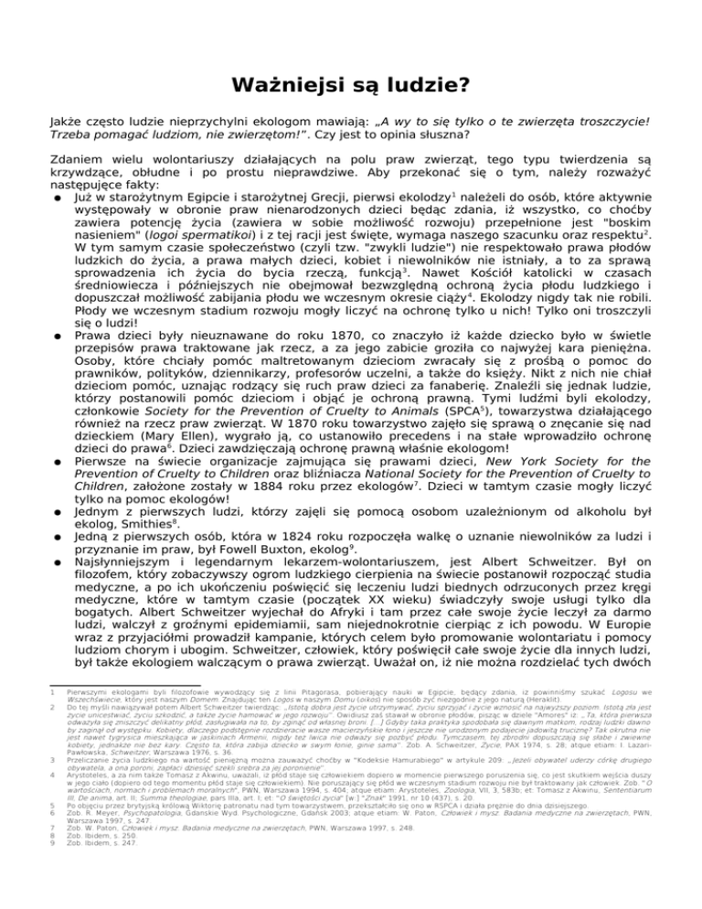 Ważniejsi są ludzie? Jakże często ludzie nieprzychylni ekologom mawiają: „A wy to się tylko o te zwierzęta troszczycie! Trzeba pomagać ludziom, nie zwierzętom!”. Czy jest to opinia słuszna? Zdaniem wielu wolontariuszy działających na polu praw zwierząt, tego typu twierdzenia są krzywdzące, obłudne i po prostu nieprawdziwe. Aby przekonać się o tym, należy rozważyć następujęce fakty: ● Już w starożytnym Egipcie i starożytnej Grecji, pierwsi ekolodzy 1 należeli do osób, które aktywnie występowały w obronie praw nienarodzonych dzieci będąc zdania, iż wszystko, co choćby zawiera potencję życia (zawiera w sobie możliwość rozwoju) przepełnione jest "boskim nasieniem" (logoi spermatikoi) i z tej racji jest święte, wymaga naszego szacunku oraz respektu 2. W tym samym czasie społeczeństwo (czyli tzw. "zwykli ludzie") nie respektowało prawa płodów ludzkich do życia, a prawa małych dzieci, kobiet i niewolników nie istniały, a to za sprawą sprowadzenia ich życia do bycia rzeczą, funkcją 3. Nawet Kościół katolicki w czasach średniowiecza i późniejszych nie obejmował bezwzględną ochroną życia płodu ludzkiego i dopuszczał możliwość zabijania płodu we wczesnym okresie ciąży 4. Ekolodzy nigdy tak nie robili. Płody we wczesnym stadium rozwoju mogły liczyć na ochronę tylko u nich! Tylko oni troszczyli się o ludzi! ● Prawa dzieci były nieuznawane do roku 1870, co znaczyło iż każde dziecko było w świetle przepisów prawa traktowane jak rzecz, a za jego zabicie groziła co najwyżej kara pieniężna. Osoby, które chciały pomóc maltretowanym dzieciom zwracały się z prośbą o pomoc do prawników, polityków, dziennikarzy, profesorów uczelni, a także do księży. Nikt z nich nie chiał dzieciom pomóc, uznając rodzący się ruch praw dzieci za fanaberię. Znaleźli się jednak ludzie, którzy postanowili pomóc dzieciom i objąć je ochroną prawną. Tymi ludźmi byli ekolodzy, członkowie Society for the Prevention of Cruelty to Animals (SPCA5), towarzystwa działającego również na rzecz praw zwierząt. W 1870 roku towarzystwo zajęło się sprawą o znęcanie się nad dzieckiem (Mary Ellen), wygrało ją, co ustanowiło precedens i na stałe wprowadziło ochronę dzieci do prawa6. Dzieci zawdzięczają ochronę prawną właśnie ekologom! ● Pierwsze na świecie organizacje zajmująca się prawami dzieci, New York Society for the Prevention of Cruelty to Children oraz bliźniacza National Society for the Prevention of Cruelty to Children, założone zostały w 1884 roku przez ekologów7. Dzieci w tamtym czasie mogły liczyć tylko na pomoc ekologów! ● Jednym z pierwszych ludzi, którzy zajęli się pomocą osobom uzależnionym od alkoholu był ekolog, Smithies8. ● Jedną z pierwszych osób, która w 1824 roku rozpoczęła walkę o uznanie niewolników za ludzi i przyznanie im praw, był Fowell Buxton, ekolog 9. ● Najsłynniejszym i legendarnym lekarzem-wolontariuszem, jest Albert Schweitzer. Był on filozofem, który zobaczywszy ogrom ludzkiego cierpienia na świecie postanowił rozpocząć studia medyczne, a po ich ukończeniu poświęcić się leczeniu ludzi biednych odrzuconych przez kręgi medyczne, które w tamtym czasie (początek XX wieku) świadczyły swoje usługi tylko dla bogatych. Albert Schweitzer wyjechał do Afryki i tam przez całe swoje życie leczył za darmo ludzi, walczył z groźnymi epidemiamii, sam niejednokrotnie cierpiąc z ich powodu. W Europie wraz z przyjaciółmi prowadził kampanie, których celem było promowanie wolontariatu i pomocy ludziom chorym i ubogim. Schweitzer, człowiek, który poświęcił całe swoje życie dla innych ludzi, był także ekologiem walczącym o prawa zwierząt. Uważał on, iż nie można rozdzielać tych dwóch 1 2 3 4 5 6 7 8 9 Pierwszymi ekologami byli filozofowie wywodzący się z linii Pitagorasa, pobierający nauki w Egipcie, będący zdania, iż powinniśmy szukać Logosu we Wszechświecie, który jest naszym Domem. Znajdując ten Logos w naszym Domu (oikos) nie sposób żyć niezgodnie z jego naturą (Heraklit). Do tej myśli nawiązywał potem Albert Schweitzer twierdząc: „ Istotą dobra jest życie utrzymywać, życiu sprzyjać i życie wznosić na najwyższy poziom. Istotą zła jest życie unicestwiać, życiu szkodzić, a także życie hamować w jego rozwoju ”. Owidiusz zaś stawał w obronie płodów, pisząc w dziele "Amores" iż: „ Ta, która pierwsza odważyła się zniszczyć delikatny płód, zasługiwała na to, by zginąć od własnej broni. [...] Gdyby taka praktyka spodobała się dawnym matkom, rodzaj ludzki dawno by zaginął od występku. Kobiety, dlaczego podstępnie rozdzieracie wasze macierzyńskie łono i jeszcze nie urodzonym podajecie jadowitą truciznę? Tak okrutna nie jest nawet tygrysica mieszkająca w jaskiniach Armenii, nigdy też lwica nie odważy się pozbyć płodu. Tymczasem, tej zbrodni dopuszczają się słabe i zwiewne kobiety, jednakże nie bez kary. Często ta, która zabija dziecko w swym łonie, ginie sama ”. Zob. A. Schweitzer, Życie, PAX 1974, s. 28; atque etiam: I. LazariPawłowska, Schweitzer, Warszawa 1976, s. 36. Przeliczanie życia ludzkiego na wartość pieniężną można zauważyć choćby w "Kodeksie Hamurabiego" w artykule 209: „ Jeżeli obywatel uderzy córkę drugiego obywatela, a ona poroni, zapłaci dziesięć szekli srebra za jej poronienie ”. Arystoteles, a za nim także Tomasz z Akwinu, uważali, iż płód staje się człowiekiem dopiero w momencie pierwszego poruszenia się, co jest skutkiem wejścia duszy w jego ciało (dopiero od tego momentu płód staje się człowiekiem). Nie poruszający się płód we wczesnym stadium rozwoju nie był traktowany jak człowiek. Zob. " O wartościach, normach i problemach moralnych", PWN, Warszawa 1994, s. 404; atque etiam: Arystoteles, Zoologia, VII, 3, 583b; et: Tomasz z Akwinu, Sententiarum III, De anima, art. II; Su