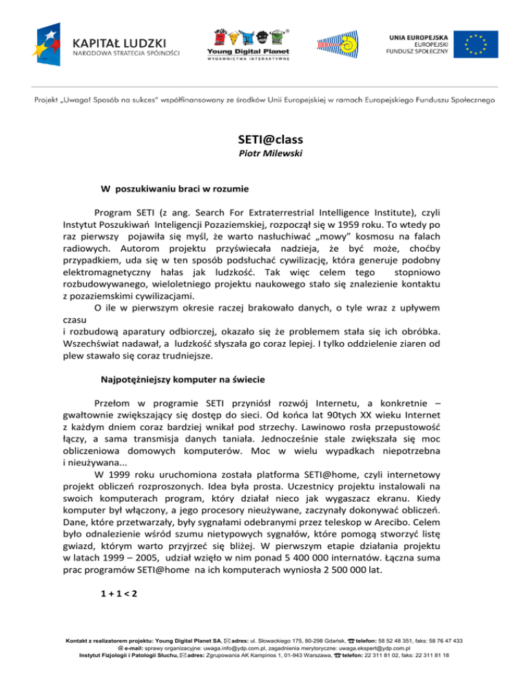 SETI@class Piotr Milewski W poszukiwaniu braci w rozumie Program SETI (z ang. Search For Extraterrestrial Intelligence Institute), czyli Instytut Poszukiwań Inteligencji Pozaziemskiej, rozpoczął się w 1959 roku. To wtedy po raz pierwszy pojawiła się myśl, że warto nasłuchiwać „mowy” kosmosu na falach radiowych. Autorom projektu przyświecała nadzieja, że być może, choćby przypadkiem, uda się w ten sposób podsłuchać cywilizację, która generuje podobny elektromagnetyczny hałas jak ludzkość. Tak więc celem tego stopniowo rozbudowywanego, wieloletniego projektu naukowego stało się znalezienie kontaktu z pozaziemskimi cywilizacjami. O ile w pierwszym okresie raczej brakowało danych, o tyle wraz z upływem czasu i rozbudową aparatury odbiorczej, okazało się że problemem stała się ich obróbka. Wszechświat nadawał, a ludzkość słyszała go coraz lepiej. I tylko oddzielenie ziaren od plew stawało się coraz trudniejsze. Najpotężniejszy komputer na świecie Przełom w programie SETI przyniósł rozwój Internetu, a konkretnie – gwałtownie zwiększający się dostęp do sieci. Od końca lat 90tych XX wieku Internet z każdym dniem coraz bardziej wnikał pod strzechy. Lawinowo rosła przepustowość łączy, a sama transmisja danych taniała. Jednocześnie stale zwiększała się moc obliczeniowa domowych komputerów. Moc w wielu wypadkach niepotrzebna i nieużywana... W 1999 roku uruchomiona została platforma SETI@home, czyli internetowy projekt obliczeń rozproszonych. Idea była prosta. Uczestnicy projektu instalowali na swoich komputerach program, który działał nieco jak wygaszacz ekranu. Kiedy komputer był włączony, a jego procesory nieużywane, zaczynały dokonywać obliczeń. Dane, które przetwarzały, były sygnałami odebranymi przez teleskop w Arecibo. Celem było odnalezienie wśród szumu nietypowych sygnałów, które pomogą stworzyć listę gwiazd, którym warto przyjrzeć się bliżej. W pierwszym etapie działania projektu w latach 1999 – 2005, udział wzięło w nim ponad 5 400 000 internatów. Łączna suma prac programów SETI@home na ich komputerach wyniosła 2 500 000 lat. 1+1<2 Kontakt z realizatorem projektu: Young Digital Planet SA, adres: ul. Słowackiego 175, 80-298 Gdańsk, telefon: 58 52 48 351, faks: 58 76 47 433 e-mail: sprawy organizacyjne: [email protected], zagadnienia merytoryczne: [email protected] Instytut Fizjologii i Patologii Słuchu, adres: Zgrupowania AK Kampinos 1, 01-943 Warszawa, telefon: 22 311 81 02, faks: 22 311 81 18 Projetk SETI@home jest jednym z najjaskrawszych przykładów na to, jak wiele można osiągnąć pracując zespołowo. Każdy z uczestników programu stal się trybikiem niewyobrażalnie sprawnej i skutecznej maszyny. Co prawda na odsłuch audycji nadawanej spod innego Słońca jeszcze ciągle musimy zaczekać, ale nie ulega wątpliwości, że warto spróbować zastosować taki system działania gdzie indziej. Nauka, badania, eksperymenty, edukacja – to naturalne sfery życia, gdzie warto przenieść doświadczenia naukowców z Berkley, którzy program SETI@home wymyślili i wprowadzili w życie. Rodzi się więc pytanie: czy zmienić klasę złożoną z X uczniów w podobny mechanizm? SETI@class Kluczem do sukcesu omawianego projektu było to, że żmudne i pracochłonne obliczenia, podzielone zostały na mikropakiety. Bez trudu i w czasie niejako „wolnym od zajęć” zajmowały się nimi procesory domowych komputerów. Skumulowany wysiłek milionów komputerów przyniósł imponujący efekt. Czy podobny system działania można zaproponować dzieciom i nastolatkom? Oczywiście, że tak. Nie od dziś bowiem wiadomo, że najbardziej lubianymi zajęciami w szkole są zajęcia aktywne, a nie tylko bierne. Od eksperymentów na zajęciach przyrodniczych, po przygotowywanie kanapek na zajęciach typu „ZPT” - to właśnie są ulubione lekcje. Niestety, nie wszystkie lekcje można prowadzić w ten sposób. Samodzielne eksperymenty niesłychanie rzadko stają się też elementem pracy domowej. Na szczęście, nie musi tak być. Stosując metodologię znaną z omawianego projektu, można pokusić się o poważny, naukowy eksperyment, który weźmie na swoje barki cała klasa – przy relatywnie niskim „obciążeniu czasowym na jednego ucznia”. Hodowla roślin. Obserwacje chmur. Regularny pomiar temperatury powietrza. Hodowla prostych kryształów. Badanie materiałów. Poszukiwanie minerałów w terenie... Możliwości wydają się nieograniczone. Eksperyment może trwać kilka tygodni, albo przez cały semestr. Wystarczy dobrze zaprojektować zakres badań, a nietrudno wyobrazić sytuację, w której wyniki eksperymentu przekroczą oczekiwania jego autora. W każdym z dzieci, głębiej lub płycej, siedzi mały odkrywca. Trzeba pozwolić mu działać. Trzeba zachęcić go, pokazując jak wiele może osiągnąć nawet przy minimalnym, lecz systematycznym wysiłku. Jeśli uda się zaprząc całą grupę do wspólnego działania, nabyte poczucie wspólnoty i duma z pokonania niemożliwego może jak nic innego napędzić do dalszych działań. Kontakt z realizatorem projektu: Young Digital Planet SA, adres: ul. Słowackiego 175, 80-298 Gdańsk, telefon: 58 52 48 351, faks: 58 76 47 433 e-mail: sprawy organizacyjne: [email protected], zagadnienia merytoryczne: [email protected] Instytut Fizjologii i Patologii Słuchu, adres: Zgrupowania AK Kampinos 1, 01-943 Warszawa, telefon: 22 311 81 02, faks: 22 311 81 18 P.S. SETI@home http://setiathome.berkeley.edu/ aktualna strona projektu http://boinc.berkeley.edu/ nowa edycja poszukiwań http://www.galaxyzoo.org/ strona, dzięki której każdy może sfotografowanych przez teleskop pomóc w klasyfikacji galaktyk https://www.zooniverse.org/projects kilkadziesiąt projektów przyrodniczych, w których badania prowadzone są przez indywidualnych użytkowników internetu w każdym wieku http://www.zooteach.org/zoo/galaxy_zoo propozycje lekcji 