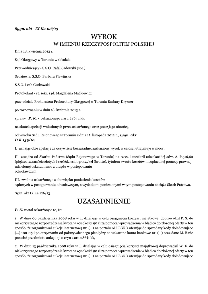 Sygn. akt - IX Ka 126/13 WYROK W IMIENIU RZECZYPOSPOLITEJ POLSKIEJ Dnia 18. kwietnia 2013 r. Sąd Okręgowy w Toruniu w składzie: Przewodniczący - S.S.O. Rafał Sadowski (spr.) Sędziowie: S.S.O. Barbara Plewińska S.S.O. Lech Gutkowski Protokolant - st. sekr. sąd. Magdalena Maćkiewicz przy udziale Prokuratora Prokuratury Okręgowej w Toruniu Barbary Dryzner po rozpoznaniu w dniu 18. kwietnia 2013 r. sprawy P. K. - oskarżonego z art. 286§ 1 kk, na skutek apelacji wniesionych przez oskarżonego oraz przez jego obrońcę, od wyroku Sądu Rejonowego w Toruniu z dnia 15. listopada 2012 r., sygn. akt II K 139/10, I. uznając obie apelacje za oczywiście bezzasadne, zaskarżony wyrok w całości utrzymuje w mocy; II. zasądza od Skarbu Państwa (Sądu Rejonowego w Toruniu) na rzecz kancelarii adwokackiej adw. A. P.516,60 (pięćset szesnaście złotych i sześćdziesiąt groszy) zł (brutto), tytułem zwrotu kosztów nieopłaconej pomocy prawnej udzielonej oskarżonemu z urzędu w postępowaniu odwoławczym; III. zwalnia oskarżonego z obowiązku poniesienia kosztów sądowych w postępowaniu odwoławczym, a wydatkami poniesionymi w tym postępowaniu obciąża Skarb Państwa. Sygn. akt IX Ka 126/13 UZASADNIENIE P. K. został oskarżony o to, że: 1. W dniu 06 października 2008 roku w T. działając w celu osiągnięcia korzyści majątkowej doprowadził P. S. do niekorzystnego rozporządzenia kwotą w wysokości 90 zł za pomocą wprowadzenia w błąd co do złożonej oferty w ten sposób, że zorganizował aukcję internetową nr (...) na portalu ALLEGRO oferując do sprzedaży kody doładowujące (...) 100+15 i po otrzymaniu od pokrzywdzonego pieniędzy na wskazane konto bankowe nr (...) oraz dane M. B.nie przesłał przedmiotu aukcji, tj. o czyn z art. 286§1 kk, 2. W dniu 13 października 2008 roku w T. działając w celu osiągnięcia korzyści majątkowej doprowadził W. K. do niekorzystnego rozporządzenia kwotą w wysokości 90 zł za pomocą wprowadzenia w błąd co do złożonej oferty w ten sposób, że zorganizował aukcje internetową nr (...) na portalu ALLEGRO oferując do sprzedaży kody doładowujące (...) 100+15 i po otrzymaniu od pokrzywdzonego pieniędzy na wskazane konto bankowe nr (...) oraz dane M. B. nie przesłał przedmiotu aukcji, tj. o czyn z art. 286§1 kk, 3. W dniu 03 października 2008 roku w T. działając w celu osiągnięcia korzyści majątkowej doprowadził P. J. do niekorzystnego rozporządzenia kwotą w wysokości 89 zł za pomocą wprowadzenia w błąd co do złożonej oferty w ten sposób, że zorganizował aukcje internetową nr (...) na portalu ALLEGRO oferując do sprzedaży kody doładowujące (...) 100+15 i po otrzymaniu od pokrzywdzonego pieniędzy na wskazane konto bankowe nr (...) oraz dane M. B. nie przesłał przedmiotu aukcji, tj. o czyn z art. 286§1 kk, 4. W dniu 09 października 2008 roku w T. działając w celu osiągnięcia korzyści majątkowej doprowadził K. N. do niekorzystnego rozporządzenia kwotą w wysokości 180 zł za pomocą w prowadzenia w błąd co do złożonej oferty w ten sposób, że zorganizował aukcję internetową nr (...) na portalu ALLEGRO oferując do sprzedaży kody doładowujące (...) 100+15 i po otrzymaniu od pokrzywdzonego pieniędzy na wskazane konto bankowe (...) oraz dane M. B. nie przesłał przedmiotu aukcji, tj. o czyn z art. 286§ 1 kk, 5. W dniu 02 października 2008 roku w T. działając w celu osiągnięcia korzyści majątkowej doprowadził J. B. do niekorzystnego rozporządzenia kwotą w wysokości 89 zł za pomocą wprowadzenia w błąd co do złożonej oferty w ten sposób, że zorganizował aukcję internetową nr (...) na portalu ALLEGRO oferując do sprzedaży kody doładowujące (...) 100+15 i po otrzymaniu od pokrzywdzonego pieniędzy na wskazane konto bankowe nr (...) oraz dane M. B. nie przestał przedmiotu aukcji, tj. o czyn z art. 286§1 kk, 6. W dniu 08 października 2008 roku w T. działając w celu osiągnięcia korzyści majątkowej doprowadził M. P. do niekorzystnego rozporządzenia kwotą w wysokości 93 zł za pomocą wprowadzenia w błąd co do złożonej oferty w ten sposób, że zorganizował aukcję internetową nr (...) na portalu ALLEGRO oferując do sprzedaży karty doładowujące do telefonu komórkowego w sieci (...) 100+50 zł i po otrzymaniu od pokrzywdzonego pieniędzy na wskazane konto bankowe nr (...) oraz dane M. B. nie przesłał przedmiotu aukcji, tj. o czyn z art. 286§1 kk, 7. W dniu 03 października 2008 roku w T. działając w celu osiągnięcia korzyści majątkowej doprowadził R. B. do niekorzystnego rozporządzenia kwotą w wysokości 89 zł za pomocą wprowadzenia w błąd co do złożonej oferty w ten sposób, że zorganizował aukcję internetową nr (...) na portalu ALLEGRO oferując do sprzedaży kody doładowujące (...) 100+15 i po otrzymaniu od pokrzywdzonego pieniędzy na wskazane konto bankowe nr (...) oraz dane M. B. nie przesłał przedmiotu aukcji, tj. o czyn z art. 286§1 kk, 8. W dniu 13 maja 2008 roku w T. działając w celu osiągnięcia korzyści majątkowej doprowadził A. G. do niekorzystnego rozporządzenia kwotą w wysokości 384 zł za pomocą uprowadzenia w błąd co do złożonej oferty w ten sposób, że zorganizował aukcję internetową nr (...) na portalu ALLEGRO oferując do sprzedaży zestawy (...) 9 zawierające po 10 kart startowych każdy i po otrzymaniu od pokrzywdzonego pieniędzy za 12 zestawów na wskazane konto bankowe nr (...) oraz dane L. N. nie przesłał przedmiotu aukcji, tj. o czyn z art. 286§1 kk, 9. W dniu 20 września 2008 roku w T. działając w celu osiągnięcia korzyści majątkowej doprowadził P. K. do niekorzystnego rozporządzenia kwotą w wysokości 45,80 zł za pomocą wprowadzenia w błąd co do złożonej oferty w ten sposób, że zorganizował aukcję internetową nr (...) na portalu ALLEGRO oferując do sprzedaży kody doładowujące (...) 50 i po otrzymaniu od pokrzywdzonego pienięd