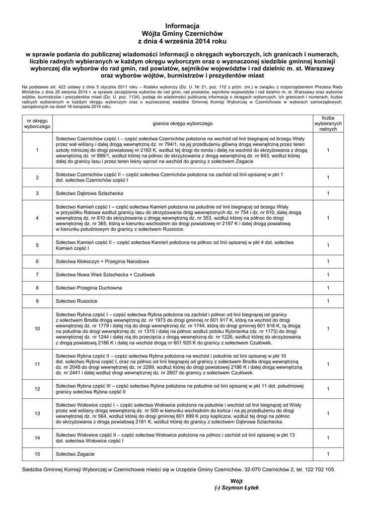 Informacja Wójta Gminy Czernichów z dnia 4 września 2014 roku w sprawie podania do publicznej wiadomości informacji o okręgach wyborczych, ich granicach i numerach, liczbie radnych wybieranych w każdym okręgu wyborczym oraz o wyznaczonej siedzibie gminnej komisji wyborczej dla wyborów do rad gmin, rad powiatów, sejmików województw i rad dzielnic m. st. Warszawy oraz wyborów wójtów, burmistrzów i prezydentów miast Na podstawie art. 422 ustawy z dnia 5 stycznia 2011 roku – Kodeks wyborczy (Dz. U. Nr 21, poz. 112 z późn. zm.) w związku z rozporządzeniem Prezesa Rady Ministrów z dnia 20 sierpnia 2014 r. w sprawie zarządzenia wyborów do rad gmin, rad powiatów, sejmików województw i rad dzielnic m. st. W arszawy oraz wyborów wójtów, burmistrzów i prezydentów miast (Dz. U. poz. 1134), podaję do wiadomości publicznej informację o okręgach wyborczych, ich granicach i numerach, liczbie radnych wybieranych w każdym okręgu wyborczym oraz o wyznaczonej siedzibie Gminnej Komisji Wyborczej w Czernichowie w wyborach samorządowych, zarządzonych na dzień 16 listopada 2014 roku. nr okręgu wyborczego granice okręgu wyborczego liczba wybieranych radnych 1 Sołectwo Czernichów część I – część sołectwa Czernichów położona na wschód od linii biegnącej od brzegu Wisły przez wał wiślany i dalej drogą wewnętrzną dz. nr 794/1, na jej przedłużeniu główną drogą wewnętrzną przez teren szkoły rolniczej do drogi powiatowej nr 2183 K, wzdłuż tej drogi do ronda i dalej na wschód do skrzyżowania z drogą wewnętrzną dz. nr 898/1, wzdłuż której na północ do skrzyżowania z drogą wewnętrzną dz. nr 843, wzdłuż której dalej do granicy lasu i przez teren leśny wprost na wschód do granicy z sołectwem Zagacie 1 2 Sołectwo Czernichów część II – część sołectwa Czernichów położona na zachód od linii opisanej w pkt 1 dot. sołectwa Czernichów część I 1 3 Sołectwo Dąbrowa Szlachecka 1 4 Sołectwo Kamień część I – część sołectwa Kamień położona na południe od linii biegnącej od brzegu Wisły w przysiółku Ratowa wzdłuż granicy lasu do skrzyżowania dróg wewnętrznych dz. nr 754 i dz. nr 810, dalej drogą wewnętrzną dz. nr 810 do skrzyżowania z drogą wewnętrzną dz. nr 353, wzdłuż której na północ do drogi wewnętrznej dz. nr 365, którą w kierunku wschodnim do drogi powiatowej nr 2187 K i dalej drogą powiatową w kierunku południowym do granicy z sołectwem Rusocice. 1 5 Sołectwo Kamień część II – część sołectwa Kamień położona na północ od linii opisanej w pkt 4 dot. sołectwa Kamień część I 1 6 Sołectwa Kłokoczyn + Przeginia Narodowa 1 7 Sołectwa Nowa Wieś Szlachecka + Czułówek 1 8 Sołectwo Przeginia Duchowna 1 9 Sołectwo Rusocice 1 10 Sołectwo Rybna część I – część sołectwa Rybna położona na zachód i północ od linii biegnącej od granicy z sołectwem Brodła drogą wewnętrzną dz. nr 1973 do drogi gminnej nr 601 917 K, którą na wschód do drogi wewnętrznej dz. nr 1779 i dalej nią do drogi wewnętrznej dz. nr 1744, którą do drogi gminnej 601 918 K, tą drogą na południe do drogi wewnętrznej dz. nr 1315 i dalej na północ wzdłuż potoku Rybnianka (dz. nr 1173) do drogi wewnętrznej dz. nr 1244 i dalej nią do przecięcia z drogą wewnętrzną dz. nr 1226, wzdłuż której do skrzyżowania z drogą powiatową 2186 K i dalej na wschód drogą nr 601 920 K do granicy z sołectwem Czułówek. 1 11 Sołectwo Rybna część II – część sołectwa Rybna położona na wschód i południe od linii opisanej w pkt 10 dot. sołectwo Rybna część I, oraz na północ od linii biegnącej od granicy z sołectwem Brodła drogą wewnętrzną dz. nr 2048 do drogi wewnętrznej dz. nr 2289, wzdłuż której do drogi powiatowej 2186 K i dalej drogą wewnętrzną dz. nr 2441 i dalej wzdłuż drogi wewnętrznej dz. nr 2607 do granicy z sołectwem Czułówek. 1 12 Sołectwo Rybna część III – część sołectwa Rybna położona na południe od linii opisanej w pkt 11 dot. południowej granicy sołectwa Rybna część II 1 13 Sołectwo Wołowice część I – część sołectwa Wołowice położona na południe i wschód od linii biegnącej od Wisły przez wał wiślany drogą wewnętrzną dz. nr 500 w kierunku wschodnim do końca i na jej przedłużeniu do drogi wewnętrznej dz. nr 564, wzdłuż której do drogi gminnej 601 899 K przy kapliczce, wzdłuż tej drogi na północ do skrzyżowania z drogą powiatową 2181 K, wzdłuż której do granicy z sołectwem Dąbrowa Szlachecka. 1 14 Sołectwo Wołowice część II – część sołectwa Wołowice położona na północ i zachód od linii opisanej w pkt 13 dot. sołectwa Wołowice część I 1 15 Sołectwo Zagacie 1 Siedziba Gminnej Komisji Wyborczej w Czernichowie mieści się w Urzędzie Gminy Czernichów, 32-070 Czernichów 2, tel. 122 702 105. Wójt (-) Szymon Łytek