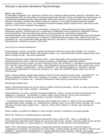 Płońszczak - Gazeta lokalna - Płońsk, Raciąż, Baboszewo, Czerwińsk, Dzierzążnia, Joniec, Naruszewo Petycja w sprawie odwołania Mączewskiego Będzie ciąg dalszy? W listopadzie ubiegłego roku społeczny komitet Ulica przekazał radzie powiatu petycję o odwołanie Jana Mączewskiego (PSL) ze stanowiska przewodniczącego rady powiatu. Pismo pozostało bez rozpatrzenia, bo o odwołanie przewodniczącego mogą wystąpić tylko radni powiatu. W trakcie gorącej dyskusji radna Elżbieta Wiśniewska (Razem dla powiatu) złożyła obietnicę, że na kolejną sesję przygotuje projekt uchwały w tej sprawie. O tym, czy odwołanie przewodniczącego będzie rozpatrywane, zdecyduje liczba radnych, ktÃłrzy pod projektem się podpiszą. Wielokrotnie informowaliśmy, że po zamieszaniu związanym z zapowiedzią poprzedniego dyrektora płońskiego szpitala, JÃłzefa Świerczka o zawieszeniu działalności trzech szpitalnych oddziałÃłw powstał komitet społeczny Ulica (komitet swoją nazwę, można powiedzieć, zawdzięcza wypowiedzi przewodniczącego rady Jana Mączewskiego, ktÃłry powiedział, że ulica nie powoływała przewodniczącego rady społecznej i ulica odwoływać go nie będzie). Przedstawicielka komitetu Ulica, Jolanta Borowska w listopadzie ub. roku przekazała radzie powiatu petycję o odwołanie z funkcji przewodniczącego rady Jana Mączewskiego. Podpisało ją ponad 1200 osÃłb. Ulicy ‌ nie można zlokalizować Temat petycji, a raczej jej losÃłw, pojawił się podczas środowych obrad rady powiatu, 25 stycznia. Radna Elżbieta Wiśniewska (Razem dla powiatu) pytała, czy przedstawiciele komitetu społecznego Ulica, obecni zresztą na sali, otrzymali odpowiedź. Wiceprzewodniczący rady Paweł Koperski (PSL) czytał odpowiedź, jaka została przygotowana w powyższej sprawie, ktÃłra trafiła do komisji rewizyjnej. UogÃłlniając, większość radnych poszczegÃłlnych komisji uznała, że pismo petycją nie jest, ale wnioskiem o odwołanie przewodniczącego. Taki wniosek mogą skierować tylko radni, więc listopadowe pismo pozostawiono bez rozpatrzenia, poza tym - jak napisano w odpowiedzi - trudno powiedzieć, czy niektÃłre podpisy są związane z petycją. Komitet Ulica odpowiedzi nie otrzymał, ponieważ nie udało się ustalić‌ gdzie mieści się i kto go reprezentuje. Radny Dariusz Żelasko (Razem dla powiatu) mÃłwił, że aktywność tak dużej liczby mieszkańcÃłw - bo petycję podpisało ponad 1000 osÃłb, zasługuje na uwagę, to sięganie do wzorcÃłw demokracji bezpośredniej a on zgadza się z zapisami przekazanej radzie petycji społecznego komitetu. Wiśniewska projekt złoży Radna Wiśniewska dziwiła się, że nie dało się ustalić członkÃłw komitetu, ktÃłrzy na sesje przychodzą, wystarczyło na sesji wstać, podejść i przekazać. Argumentowała, że osoby z komitetu firmują działalność sobą, a nie jest to łatwe przeciwstawić się rządzącym w powiecie. Powiedziała, że gdyby miała 4 głosy radnych, ktÃłrzy pod wnioskiem o odwołanie przewodniczącego się podpiszą, to projekt uchwały by złożyła. - Przygotuję projekt uchwały w tej sprawie, jeśli znajdą się 4 osoby w radzie, ktÃłre go podpiszą zaproponowała radna, dodając, że uzasadnieniem takiego kroku nie są tylko sprawy szpitala, ale i wyrok dotyczący Powiatowego Urzędu Pracy - zdarzeń, ktÃłre miały miejsce w okresie, gdy starostą był Mączewski. Radna dodała, że publicznie ogłasza, iż złoży projekt uchwały o odwołanie przewodniczącego. Radni PiS: petycja to wewnątrzpartyjna rozgrywka Radny Krzysztof Wrzesiński przedstawił stanowisko klubu radnych PiS - radni ci uważają, że przewodniczący Mączewski „bardzo źle sprawuje powierzoną funkcję i powinien podać się do dymisji, albo zostać odwołany ze stanowiska― i przypominają, że byli przeciwni tej kandydaturze. Radni PiS w stanowisku argumentują, iż Mączewski powinien przestać być przewodniczącym z następujących powodÃłw: po pierwsze „jako bliska rodzina byłego dyrektora szpitala w Płońsku jest osobiście i emocjonalnie zaangażowany w sprawy płońskiej służby zdrowia, a biorąc pod uwagę http://www.plonszczak.pl Kreator PDF Utworzono 8 March, 2017, 01:27 Płońszczak - Gazeta lokalna - Płońsk, Raciąż, Baboszewo, Czerwińsk, Dzierzążnia, Joniec, Naruszewo powyższe koligacje rodzinne jego stanowisko dotyczące omawianych tematÃłw zawsze będzie określone i jednostronne― (‌), po drugie : „z powodu swojego możliwego zaangażowania w sprawę byłej dyrektor Powiatowego Urzędu Pracy w Płońsku―(‌); po trzecie „polityczne występy przewodniczącego podczas sponsorowanych przez powiat Dożynek Gminnych we wrześniu 2015 roku― (‌) Radni PiS argumentują także, że za odwołaniem przewodniczącego przemawiają rÃłwnież personalne konflikty, w tym ten, ktÃłry doprowadził do nieudzielenia głosu wÃłjtowi gminy Załuski. - Jednak jako opozycja odpowiedzialna i szanująca procedury demokratyczne uznajemy większościowy wybÃłr radnych i nie składamy wniosku o odwołanie Jana Mączewskiego mając świadomość arytmetycznej większości radnych z Klubu Polskiego Stronnictwa Ludowego - przedstawiał stanowisko Wrzesiński. - Jako radnym nie zależy nam na awanturze politycznej, a na merytorycznej pracy samorządowej. Od początku kadencji wskazujemy na wymienione wyżej negatywne aspekty pracy przewodniczącego Mączewskiego i robimy to bez względu na partykularne interesy i rozgrywki partyjne. Z tego względu otrzymaną petycję komitetu Ulica traktujemy jako rozgrywkę wewnątrzpartyjną w ramach PSL. Przedstawiciele komitetu związani są albo z PSL, albo startowali w wyborach samorządowych z list SLD, a także zaangażowani są w działania płońskiego oddziału Komitetu Obrony Demokracji. Zdaniem radnych PiS, aktywność komitetu Ulica ma związek tylko i wyłącznie z konkursem na stanowisko dyrektora p