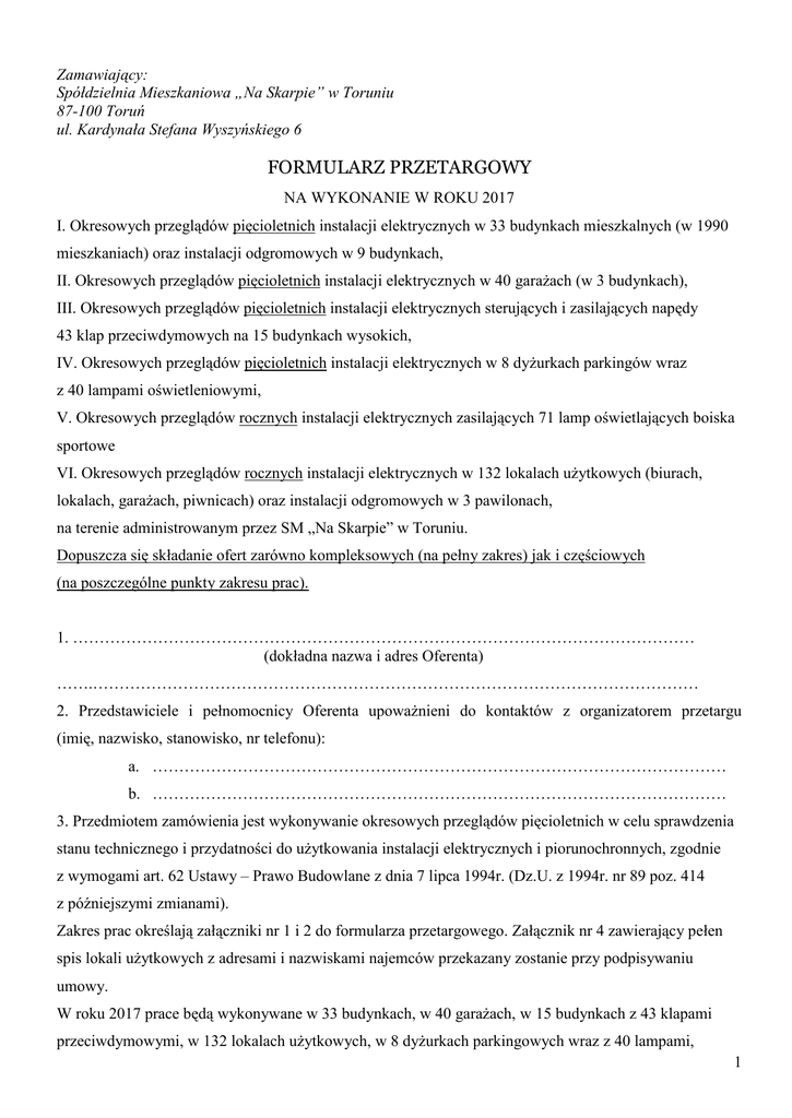 Zamawiający: Spółdzielnia Mieszkaniowa „Na Skarpie” w Toruniu 87-100 Toruń ul. Kardynała Stefana Wyszyńskiego 6 FORMULARZ PRZETARGOWY NA WYKONANIE W ROKU 2017 I. Okresowych przeglądów pięcioletnich instalacji elektrycznych w 33 budynkach mieszkalnych (w 1990 mieszkaniach) oraz instalacji odgromowych w 9 budynkach, II. Okresowych przeglądów pięcioletnich instalacji elektrycznych w 40 garażach (w 3 budynkach), III. Okresowych przeglądów pięcioletnich instalacji elektrycznych sterujących i zasilających napędy 43 klap przeciwdymowych na 15 budynkach wysokich, IV. Okresowych przeglądów pięcioletnich instalacji elektrycznych w 8 dyżurkach parkingów wraz z 40 lampami oświetleniowymi, V. Okresowych przeglądów rocznych instalacji elektrycznych zasilających 71 lamp oświetlających boiska sportowe VI. Okresowych przeglądów rocznych instalacji elektrycznych w 132 lokalach użytkowych (biurach, lokalach, garażach, piwnicach) oraz instalacji odgromowych w 3 pawilonach, na terenie administrowanym przez SM „Na Skarpie” w Toruniu. Dopuszcza się składanie ofert zarówno kompleksowych (na pełny zakres) jak i częściowych (na poszczególne punkty zakresu prac). 1. ……………………………………………………………………………………………………… (dokładna nazwa i adres Oferenta) …….…………………………………………………………………………………………………… 2. Przedstawiciele i pełnomocnicy Oferenta upoważnieni do kontaktów z organizatorem przetargu (imię, nazwisko, stanowisko, nr telefonu): a. ……………………………………………………………………………………………… b. ……………………………………………………………………………………………… 3. Przedmiotem zamówienia jest wykonywanie okresowych przeglądów pięcioletnich w celu sprawdzenia stanu technicznego i przydatności do użytkowania instalacji elektrycznych i piorunochronnych, zgodnie z wymogami art. 62 Ustawy – Prawo Budowlane z dnia 7 lipca 1994r. (Dz.U. z 1994r. nr 89 poz. 414 z późniejszymi zmianami). Zakres prac określają załączniki nr 1 i 2 do formularza przetargowego. Załącznik nr 4 zawierający pełen spis lokali użytkowych z adresami i nazwiskami najemców przekazany zostanie przy podpisywaniu umowy. W roku 2017 prace będą wykonywane w 33 budynkach, w 40 garażach, w 15 budynkach z 43 klapami przeciwdymowymi, w 132 lokalach użytkowych, w 8 dyżurkach parkingowych wraz z 40 lampami, 1 w 71 lampach oświetlających boiska sportowe - zgodnie z harmonogramem stanowiącym załącznik do formularza przetargowego (załącznik nr 3 – harmonogram wraz z wyceną prac), bez wystawiania odrębnych zleceń. Wszystkie protokoły pomiarowe dotyczące danego obiektu zostaną dostarczone Zamawiającemu w formie „Książki okresowej kontroli instalacji elektrycznych” w terminie do 7 dnia miesiąca następującego po miesiącu, w którym pomiary zostały wykonane. Zestawienie przekazywanych książek pomiarów Wykonawca przedłoży w Punkcie Informacyjnym. Potwierdzeniem wykonania pomiaru ma być dołączony wykaz imienny wraz z podpisami właścicieli i najemców. Do książki będą załączone aktualne certyfikaty kalibracji użytych przyrządów pomiarowych. O terminie wykonywania pomiarów Wykonawca będzie powiadamiał mieszkańców poprzez wywieszanie ogłoszeń na drzwiach wejściowych i tablicach ogłoszeń w budynku, w uzgodnieniu z Administracją Osiedla, z co najmniej 7-dniowym wyprzedzeniem. W obiektach, w których nie dokonano kompleksowych pomiarów z uwagi na brak właścicieli i najemców, Wykonawca ustali termin dodatkowy dla tych mieszkań. 4. Dokumenty, które należy dołączyć do formularza przetargowego: 4.1. Wyciąg z Krajowego Rejestru Sądowego* / zaświadczenie o wpisie do ewidencji działalności gospodarczej * (dokumenty wystawione lub z potwierdzoną aktualnością nie wcześniej niż 3 miesiące przed terminem złożenia oferty). * niepotrzebne skreślić 4.2.1. W przypadku Oferenta prowadzącego księgi rachunkowe – bilans oraz rachunek zysków i strat za rok 2015 4.2.2. W przypadku Oferenta nie prowadzącego ksiąg rachunkowych – zeznanie podatkowe za rok 2015 oraz zestawienie z podatkowej księgi przychodów i rozchodów narastająco miesiącami za rok 2016. 4.3. Referencje inwestorów z poprzednich 2 lat, określające rodzaj i miejsce wykonywanych robót oraz stwierdzające, że roboty zostały wykonane w ustalonym terminie i jakościowo dobrze. Protokoły odbioru nie uznaje się jako referencje. 4.4. Zaświadczenie z ZUS o nie zaleganiu w płaceniu składek na ubezpieczenia społeczne oraz z Urzędu Skarbowego o nie zaleganiu w płaceniu podatków, wystawione nie wcześniej niż 3 miesiące przed terminem złożenia oferty. 4.5. Dowód wpłaty wadium: kwota w wysokości 1 000,00 zł wpłacona przelewem na rachunek bankowy Zamawiającego Nr 22 1140 2088 0000 5970 8100 1001 w mBanku S.A. lub w kasie Zamawiającego – pawilon przy ul. Konstytucji 3 Maja 24. 4.6. Wykaz pracowników posiadających uprawnienia do wykonywania dozoru lub eksploatacji instalacji i urządzeń elektroenergetycznych do 1 kV, wraz z posiadanymi uprawnieniami kwalifikacyjnymi (załączyć kserokopie). 2 4.7. Charakterystyka techniczna wyposażenia będącego w dyspozycji, niezbędnego do wykonania robót. 4.8. Wypełniony i podpisany załącznik nr 3, tj. „Harmonogram z wyceną pomiarów instalacji elektrycznych …..”. Kserokopie dokumentów należy poświadczyć własnoręcznym podpisem – za zgodność z oryginałem. Pozostałe dokumenty należy przekazać podpisane przez Oferenta lub odpowiednią instytucję. 5. Wadium: 5.1. Wadium podlega utracie w razie cofnięcia oferty po upływie terminu składania ofert lub w razie uchylenia się Oferenta, który wygrał przetarg od realizacji zamówienia na warunkach określonych w fo