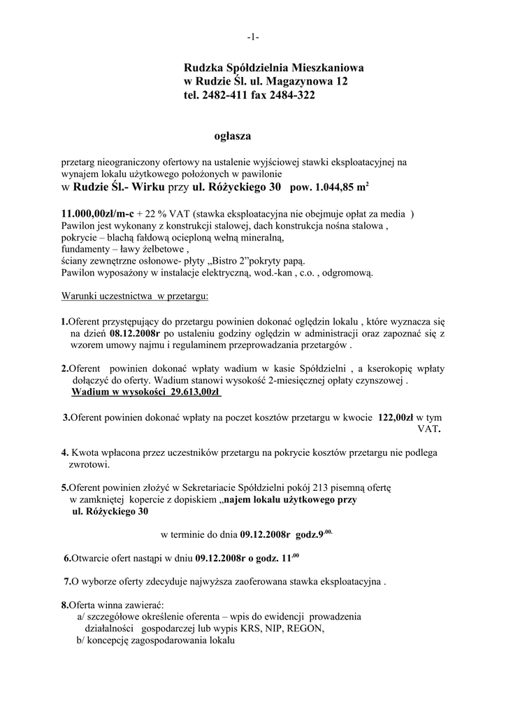 -1- Rudzka Spółdzielnia Mieszkaniowa w Rudzie Śl. ul. Magazynowa 12 tel. 2482-411 fax 2484-322 ogłasza przetarg nieograniczony ofertowy na ustalenie wyjściowej stawki eksploatacyjnej na wynajem lokalu użytkowego położonych w pawilonie w Rudzie Śl.- Wirku przy ul. Różyckiego 30 pow. 1.044,85 m2 11.000,00zł/m-c + 22 % VAT (stawka eksploatacyjna nie obejmuje opłat za media ) Pawilon jest wykonany z konstrukcji stalowej, dach konstrukcja nośna stalowa , pokrycie – blachą fałdową ocieploną wełną mineralną, fundamenty – ławy żelbetowe , ściany zewnętrzne osłonowe- płyty „Bistro 2”pokryty papą. Pawilon wyposażony w instalacje elektryczną, wod.-kan , c.o. , odgromową. Warunki uczestnictwa w przetargu: 1.Oferent przystępujący do przetargu powinien dokonać oględzin lokalu , które wyznacza się na dzień 08.12.2008r po ustaleniu godziny oględzin w administracji oraz zapoznać się z wzorem umowy najmu i regulaminem przeprowadzania przetargów . 2.Oferent powinien dokonać wpłaty wadium w kasie Spółdzielni , a kserokopię wpłaty dołączyć do oferty. Wadium stanowi wysokość 2-miesięcznej opłaty czynszowej . Wadium w wysokości 29.613,00zł 3.Oferent powinien dokonać wpłaty na poczet kosztów przetargu w kwocie 122,00zł w tym VAT. 4. Kwota wpłacona przez uczestników przetargu na pokrycie kosztów przetargu nie podlega zwrotowi. 5.Oferent powinien złożyć w Sekretariacie Spółdzielni pokój 213 pisemną ofertę w zamkniętej kopercie z dopiskiem „najem lokalu użytkowego przy ul. Różyckiego 30 w terminie do dnia 09.12.2008r godz.9.00. 6.Otwarcie ofert nastąpi w dniu 09.12.2008r o godz. 11,00 7.O wyborze oferty zdecyduje najwyższa zaoferowana stawka eksploatacyjna . 8.Oferta winna zawierać: a/ szczegółowe określenie oferenta – wpis do ewidencji prowadzenia działalności gospodarczej lub wypis KRS, NIP, REGON, b/ koncepcję zagospodarowania lokalu -2c/ propozycję stawki eksploatacyjnej. 9. Wadium oferentów, których oferty nie zostaną wybrane zostanie zwrócone do 7 dni od rozstrzygnięcia przetargu. 10. Wadium oferenta, którego oferta zostanie przyjęta będzie zaliczone na poczet należności czynszowych za w/w lokal. 11. Przed przejęciem lokalu Najemca zobowiązany jest do wpłacenia kaucji w wysokości trzymiesięcznego czynszu. 12.Wadium przepada na rzecz RSM jeżeli oferent, którego oferta zostanie przyjęta, uchyli się od zawarcia umowy w terminie 14 dni od dnia przetargu. 13.O wyniku przetargu oferenci zostaną poinformowani pisemnie. 14. Spółdzielnia zastrzega sobie prawo unieważnienia przetargu bez podania przyczyn . 15. RSM informuje, że w przypadku wynajmu całego lokalu Najemca będzie miał prawo jego pierwokupu za cenę nie mniejszą niż z operatu szacunkowego w dniu zbycia. Szczegółowych informacji udziela Dział członkowsko-lokalowy pokój 118 telefon 032 2482-411 wew. 311 .
