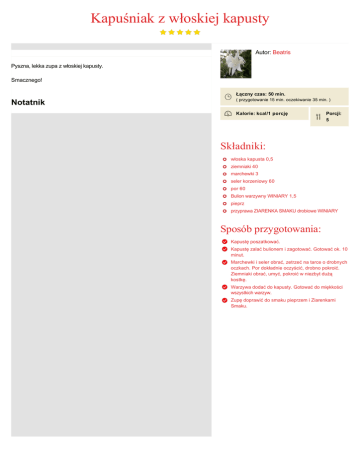 Kapuśniak z włoskiej kapusty Autor: Beatris Pyszna, lekka zupa z włoskiej kapusty. Smacznego! Łączny czas: 50 min. Notatnik ( przygotowanie 15 min. oczekiwanie 35 min. ) Kalorie: kcal/1 porcję Porcji: 5 Składniki: włoska kapusta 0,5 ziemniaki 40 marchewki 3 seler korzeniowy 60 por 60 Bulion warzywny WINIARY 1,5 pieprz przyprawa ZIARENKA SMAKU drobiowe WINIARY Sposób przygotowania: Kapustę poszatkować. Kapustę zalać bulionem i zagotować. Gotować ok. 10 minut. Marchewki i seler obrać, zetrzeć na tarce o drobnych oczkach. Por dokładnie oczyścić, drobno pokroić. Ziemniaki obrać, umyć, pokroić w niezbyt dużą kostkę. Warzywa dodać do kapusty. Gotować do miękkości wszystkich warzyw. Zupę doprawić do smaku pieprzem i Ziarenkami Smaku.