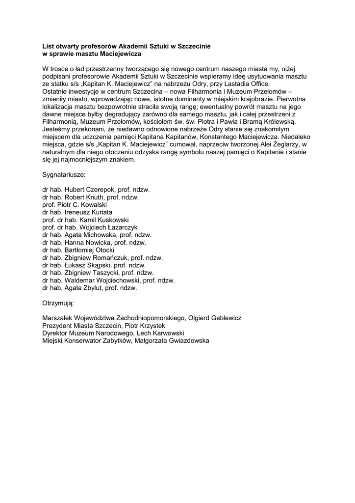 List otwarty profesorów Akademii Sztuki w Szczecinie w sprawie masztu Maciejewicza W trosce o ład przestrzenny tworzącego się nowego centrum naszego miasta my, niżej podpisani profesorowie Akademii Sztuki w Szczecinie wspieramy ideę usytuowania masztu ze statku s/s „Kapitan K. Maciejewicz” na nabrzeżu Odry, przy Lastadia Office. Ostatnie inwestycje w centrum Szczecina – nowa Filharmonia i Muzeum Przełomów – zmieniły miasto, wprowadzając nowe, istotne dominanty w miejskim krajobrazie. Pierwotna lokalizacja masztu bezpowrotnie straciła swoją rangę; ewentualny powrót masztu na jego dawne miejsce byłby degradujący zarówno dla samego masztu, jak i całej przestrzeni z Filharmonią, Muzeum Przełomów, kościołem św. św. Piotra i Pawła i Bramą Królewską. Jesteśmy przekonani, że niedawno odnowione nabrzeże Odry stanie się znakomitym miejscem dla uczczenia pamięci Kapitana Kapitanów, Konstantego Maciejewicza. Niedaleko miejsca, gdzie s/s „Kapitan K. Maciejewicz” cumował, naprzeciw tworzonej Alei Żeglarzy, w naturalnym dla niego otoczeniu odzyska rangę symbolu naszej pamięci o Kapitanie i stanie się jej najmocniejszym znakiem. Sygnatariusze: dr hab. Hubert Czerepok, prof. ndzw. dr hab. Robert Knuth, prof. ndzw. prof. Piotr C. Kowalski dr hab. Ireneusz Kuriata prof. dr hab. Kamil Kuskowski prof. dr hab. Wojciech Łazarczyk dr hab. Agata Michowska, prof. ndzw. dr hab. Hanna Nowicka, prof. ndzw. dr hab. Bartłomiej Otocki dr hab. Zbigniew Romańczuk, prof. ndzw. dr hab. Łukasz Skąpski, prof. ndzw. dr hab. Zbigniew Taszycki, prof. ndzw. dr hab. Waldemar Wojciechowski, prof. ndzw. dr hab. Agata Zbylut, prof. ndzw. Otrzymują: Marszałek Województwa Zachodniopomorskiego, Olgierd Geblewicz Prezydent Miasta Szczecin, Piotr Krzystek Dyrektor Muzeum Narodowego, Lech Karwowski Miejski Konserwator Zabytków, Małgorzata Gwiazdowska