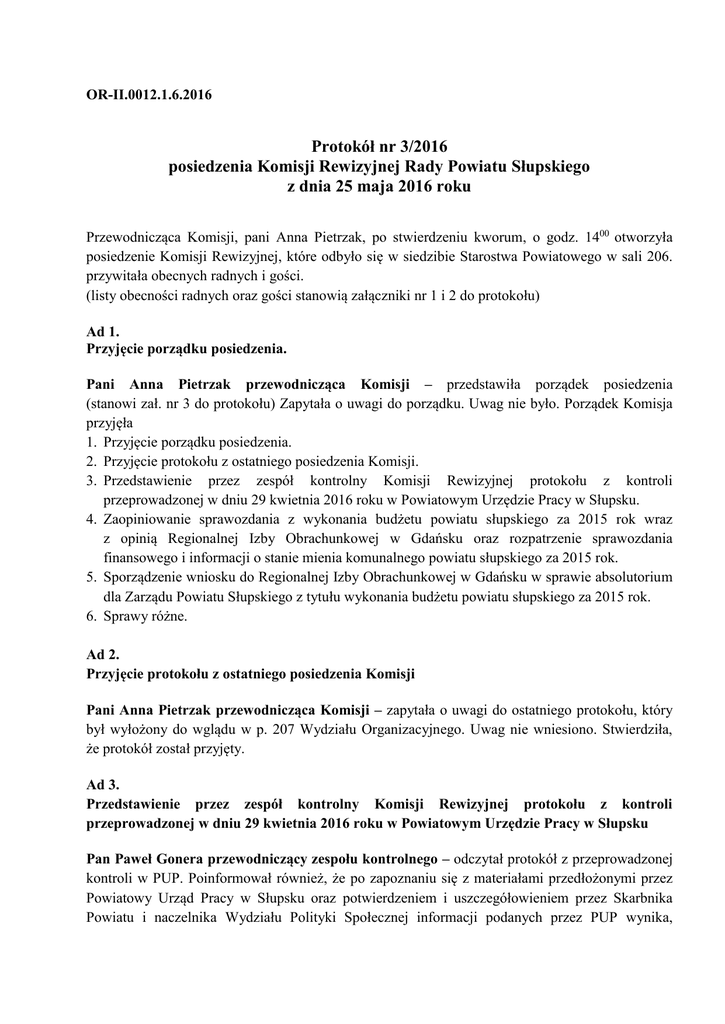 OR-II.0012.1.6.2016 Protokół nr 3/2016 posiedzenia Komisji Rewizyjnej Rady Powiatu Słupskiego z dnia 25 maja 2016 roku Przewodnicząca Komisji, pani Anna Pietrzak, po stwierdzeniu kworum, o godz. 1400 otworzyła posiedzenie Komisji Rewizyjnej, które odbyło się w siedzibie Starostwa Powiatowego w sali 206. przywitała obecnych radnych i gości. (listy obecności radnych oraz gości stanowią załączniki nr 1 i 2 do protokołu) Ad 1. Przyjęcie porządku posiedzenia. Pani Anna Pietrzak przewodnicząca Komisji – przedstawiła porządek posiedzenia (stanowi zał. nr 3 do protokołu) Zapytała o uwagi do porządku. Uwag nie było. Porządek Komisja przyjęła 1. Przyjęcie porządku posiedzenia. 2. Przyjęcie protokołu z ostatniego posiedzenia Komisji. 3. Przedstawienie przez zespół kontrolny Komisji Rewizyjnej protokołu z kontroli przeprowadzonej w dniu 29 kwietnia 2016 roku w Powiatowym Urzędzie Pracy w Słupsku. 4. Zaopiniowanie sprawozdania z wykonania budżetu powiatu słupskiego za 2015 rok wraz z opinią Regionalnej Izby Obrachunkowej w Gdańsku oraz rozpatrzenie sprawozdania finansowego i informacji o stanie mienia komunalnego powiatu słupskiego za 2015 rok. 5. Sporządzenie wniosku do Regionalnej Izby Obrachunkowej w Gdańsku w sprawie absolutorium dla Zarządu Powiatu Słupskiego z tytułu wykonania budżetu powiatu słupskiego za 2015 rok. 6. Sprawy różne. Ad 2. Przyjęcie protokołu z ostatniego posiedzenia Komisji Pani Anna Pietrzak przewodnicząca Komisji – zapytała o uwagi do ostatniego protokołu, który był wyłożony do wglądu w p. 207 Wydziału Organizacyjnego. Uwag nie wniesiono. Stwierdziła, że protokół został przyjęty. Ad 3. Przedstawienie przez zespół kontrolny Komisji Rewizyjnej protokołu z kontroli przeprowadzonej w dniu 29 kwietnia 2016 roku w Powiatowym Urzędzie Pracy w Słupsku Pan Paweł Gonera przewodniczący zespołu kontrolnego – odczytał protokół z przeprowadzonej kontroli w PUP. Poinformował również, że po zapoznaniu się z materiałami przedłożonymi przez Powiatowy Urząd Pracy w Słupsku oraz potwierdzeniem i uszczegółowieniem przez Skarbnika Powiatu i naczelnika Wydziału Polityki Społecznej informacji podanych przez PUP wynika, 2 że Miasto Słupsk nie dokłada do zadania własnych środków, przekazuje tylko subwencję otrzymaną od Ministra Finansów. Dodał, że Powiat Słupski otrzymuje na utrzymanie PUP z Funduszu Pracy na wynagrodzenia, nagrody z pochodnymi z Ministerstwa Rodziny, Pracy i Polityki Społecznej, dużo niższą subwencję tj. (842 300,00 zł) w porównaniu do Miasta Słupsk tj. (1 585 468,00 zł) , dlatego też wkład finansowy Powiatu Słupskiego na utrzymanie Powiatowego Urzędu Pracy w Słupsku jest znacznie większy. Zdaniem Komisji dyrektor PUP powinien na bieżąco informować Prezydenta Miasta o ponoszonych wydatkach na działalność urzędu i brakujących środkach oraz występować do Prezydenta o zwiększenie współfinansowania. W obecnej sytuacji słusznym wydaje się podpisywanie z Prezydentem Miasta Słupsk porozumienia na współfinansowanie urzędu w kwocie, jaką Miasto Słupsk przeznacza rok rocznie na funkcjonowanie PUP, zgodną z tą jaką otrzymuje w ramach subwencji. Wprawdzie kwota ta jest niższa niż wynika to z roszczenia, ale w znacznym stopniu zaspakaja potrzeby finansowe PUP. W przypadku nie podpisania porozumienia w danym roku i uzyskania kwoty jaką Miasto chce przekazać, ten nawet nie mógłby zaciągnąć zobowiązania finansowego na funkcjonowanie urzędu. Dodał, że zgodnie z zapisami ustawy o finansach publicznych (art. 89) można zaciągać zobowiązania wyłącznie na: pokrycie występującego w ciągu roku przejściowego deficytu budżetu jednostki samorządu terytorialnego; finansowanie planowanego deficytu budżetu jednostki samorządu terytorialnego; spłatę wcześniej zaciągniętych zobowiązań z tytułu emisji papierów wartościowych oraz zaciągniętych pożyczek i kredytów oraz wyprzedzające finansowanie działań finansowanych ze środków pochodzących z budżetu Unii Europejskiej. (protokół nr 3/2016 z kontroli w Powiatowym Urzędzie Pracy w Słupsku stanowi zał. nr 4 do protokołu) Pani Anna Pietrzak przewodnicząca Komisji – zaproponowała nie formułować zaleceń pokontrolnych, wyjaśniając, że zespół dokonujący kontroli nie wskazał na taką potrzebę. Komisja wyraziła zgodę i przyjęła protokół z przeprowadzonej kontroli w Powiatowym Urzędzie Pracy w Słupsku. Ad 4. Zaopiniowanie sprawozdania z wykonania budżetu powiatu słupskiego za 2015 rok wraz z opinią Regionalnej Izby Obrachunkowej w Gdańsku oraz rozpatrzenie sprawozdania finansowego i informacji o stanie mienia komunalnego powiatu słupskiego za 2015 rok Pani Jadwiga Janicka Skarbnik Powiatu – poinformowała, że sprawozdanie z wykonania budżetu powiatu słupskiego za 2015 rok zostało przedłożone zgodnie z terminem określonym w art. 267 ust. 1 ustawy o finansach publicznych, tj. w dniu 24 marca 2016 roku. W 2015 roku dochody zostały zrealizowane w 99,92% (bieżące – 100,21%, majątkowe – 96,63%), wydatki w 96,86% (bieżące – 97,71%, majątkowe – 92,21%). Główny wpływ na mniejsze wykonanie wydatków majątkowych miał zwrot środków od wojewody na zadanie związane z ul. Wczasową w Ustce. Pieniądze te wpłynęły od Urzędu Miejskiego w Ustce do budżetu powiatu w dniu 31 grudnia 2015 roku. W wyniku uzyskania wyższych dochodów od wydatków budżet powiatu za 2015 rok zamknął się nadwyżką budżetową w wysokości 1 765 697,33 zł. Przychody budżetu wykonano w 88,44% w kwocie 2 898 178,58 zł, w tym: przychody z tytułu wolnych środków w kwocie 1 858 178,58 zł, to jest w 100% oraz z tytułu emisji obligacji komunalnych w kwocie 1 040 000,00 zł 3 na zaplanowane 1 419 000,00 zł, to jest w 73,29%. Emisja obligacji dokonana została zgodnie z umowami w dniach 15 grudnia 2015 roku na kwotę 600 000,00 zł i 28 grudnia 2015 