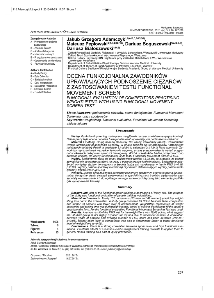 115 Adamczyk1:Layout 1 2013-01-29 11:57 Strona 1 ARTYKUŁ ORYGINALNY / ORIGINAL ARTICLE Zaangażowanie Autorów A – Przygotowanie projektu badawczego B – Zbieranie danych C – Analiza statystyczna D – Interpretacja danych E – Przygotowanie manuskryptu F – Opracowanie piśmiennictwa G – Pozyskanie funduszy Author’s Contribution A – Study Design B – Data Collection C – Statistical Analysis D – Data Interpretation E – Manuscript Preparation F – Literature Search G – Funds Collection Medycyna Sportowa © MEDSPORTPRESS, 2012; 4(4); Vol. 28, 267-276 DOI: 10.5604/1232406X.1030820 Jakub Grzegorz Adamczyk1,2(A,B,C,D,E,F,G), Mateusz Pepłowski3(A,B,C,D,F,G), Dariusz Boguszewski1(A,C,D,E), Dariusz Białoszewski1(D,E) 1 Zakład Rehabilitacji Oddziału Fizjoterapii II Wydziału Lekarskiego, Warszawski Uniwersytet Medyczny Zakład Teorii Sportu Akademii Wychowania Fizycznego, Warszawa 3 Sekcja Kultury Fizycznej SKN Fizjoterapii przy Zakładzie Rehabilitacji II WL, Warszawski Uniwersytet Medyczny 1 Department of Rehabilitation Physiotherapy Division Warsaw Medical University 2 Deaprtment of Theory of Sport Academy of Physical Education, Warsaw 3 Physical Culture Section of Physiotherapy Students Academic Group at Warsaw Medical University 2 OCENA FUNKCJONALNA ZAWODNIKÓW UPRAWIAJĄCYCH PODNOSZENIE CIĘŻARÓW Z ZASTOSOWANIEM TESTU FUNCTIONAL MOVEMENT SCREEN FUNCTIONAL EVALUATION OF COMPETITORS PRACTISING WEIGHTLIFTING WITH USING FUNCTIONAL MOVEMENT SCREEN TEST Słowa kluczowe: podnoszenie ciężarów, ocena funkcjonalna, Functional Movement Screening, urazy sportowców Key words: weightlifting, functional evaluation, Functional Movement Screening, athletic injuries Streszczenie Wstęp. Funkcjonalny trening motoryczny ma głównie na celu zmniejszenie ryzyka kontuzji. Celem pracy była ocena i analiza funkcjonalna osób uprawiających podnoszenie ciężarów. Materiał i metody. Grupę badaną stanowiły 102 osoby, zawodnicy (n=53) i zawodniczki (n=49) uprawiający podnoszenie ciężarów. W grupie znalazło się 69 sztangistów i sztangistek należących do kadry Polski, a pozostałe 33 osoby to sztangiści z II lub III klasą sportową. Zawodnicy reprezentowali wszystkie kategorie wagowe, a czas przeprowadzania badań przypadał w okresach dużej intensywności treningowej. Wśród uczestników badań przeprowadzono autorską ankietę. Do oceny funkcjonalnej użyto testu Functional Movement Screen (FMS). Wyniki. Średni wynik testu dla grupy ciężarowców wyniósł 18,08 pkt, co sugeruje, że badani zawodnicy nie są bardzo narażeni na urazy z powodu braków funkcjonalnych. Stwierdzono zależność pomiędzy stażem treningowym a średnią liczbą pkt. uzyskiwaną w teście FMS (r=0,48; p<0.05). Wyższy poziom sportowy również był czynnikiem determinującym wyższy poziom funkcjonalny ciężarowców (p<0.05). Wnioski. Istnieje silna zależność pomiędzy poziomem sportowym a wysoką oceną funkcjonalną. Korzystne efekty ćwiczeń stosowanych w specjalistycznym treningu ciężarowców uzasadniają wprowadzenie ich do ogólnego treningu sprawności fizycznej jako elementu profilaktyki występowania kontuzji. Summary Word count: Tables: Figures: References: 6606 0 4 25 Background. Aim of the functional motor training is decreasing of injury risk. The purpose of the study was functional evaluation of people training weightlifting. Material and methods. Totally 102 participants (53 men and 49 women) practicing weightlifting took part in the examination. A study group consisted 69 Polish National Team competitors and further 33 persons with lower level of advancement. Weightlifters represented all weight categories and testing time was during high intensity period of training. Participants fill the author’s questionnaire form. For the functional evaluation, Functional Movement Screening Test was used. Results. Average result of the FMS test for the weightlifters was 18,08 points, what suggest that studied group is not highly exposed for injuries due to functional defects. A correlation between years of practice and average number of FMS score has been detected (r=0,48 ; p<0.05). Higher sport level of competitors was also a determining factor of better functional level of weightlifters (p<0.05). Conclusions. There is a strong correlation between sports level and high functional evaluation. Profitable effects of exercises used in weightlifters training motivate to applied them to general fitness training as a part of injury prevention. Adres do korespondencji / Address for correspondence Jakub Grzegorz Adamczyk Zakład Rehabilitacji Oddziału Fizjoterapii II Wydziału Lekarskiego Warszawskiego Uniwersytetu Medycznego 00-424 Warszawa, ul. Solec 57, tel. (22) 629-46-65, fax. (22) 622-80-05, e-mail: [email protected] Otrzymano / Received Zaakceptowano / Accepted 05.01.2012 r. 16.07.2012 r. 267 115 Adamczyk1:Layout 1 2013-01-29 11:57 Strona 2 Adamczyk J.G. i wsp., Ocena funkcjonalna zawodników uprawiających podnoszenie ciężarów Wstęp Background We współczesnym sporcie w ostatnim dwudziestoleciu zauważalna jest bardzo gwałtowna progresja obciążeń treningowych [1]. Coraz częściej spotykamy zawodników, którzy do granic możliwości eksploatują swój organizm. Sytuacje, w których przekracza się poziom obciążeń odpowiednich dla danej jednostki treningowej bądź, co gorsza, dla całego okresu treningowego, stały się coraz bardziej powszechne. Efektem przekroczenia optymalnego poziomu pracy wykonywanej na treningach może być negatywny stan zdrowia zawodnika, co w niedalekiej przyszłości przełoży się na poziom osiąganych wyników. Dawniej podnoszenie ciężarów uważane było za dyscyplinę sportu, która w sposób szczególny predysponowała do uszkodzeń kręgosłupa. W świetle badań ciężarowcy są grupą sportowców, u których uszkodzenia te występują znacznie częściej niż u innych zawodników uprawiających sporty siłowe [2]. Zwykle u