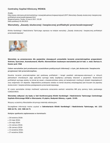 Centralny Szpital Kliniczny MSWiA Źródło: http://www.cskmswia.pl/csk/marketing-i-rozwoj/aktualnosci/najwazniejsze/12977,Warsztaty-Zasady-skutecznej-i-bezpiecznejprofilaktyki-przeciwzakrzepowej.html Wygenerowano: Środa, 8 marca 2017, 03:28 Data publikacji 01.09.2015 Warsztaty „Zasady skutecznej i bezpiecznej profilaktyki przeciwzakrzepowej” Klinika Kardiologii i Nadciśnienia Tętniczego zaprasza na kolejne warsztaty „Zasady skutecznej i bezpiecznej profilaktyki przeciwzakrzepowej”. Warsztaty są przeznaczone dla pacjentów stosujących przewlekłe leczenie przeciwkrzepliwe preparatami: Sintrom, Syncumar, Acenokumarol, Warfin. Kierownikiem naukowym warsztatów jest dr hab. n. med. Dariusz A. Kosior prof. PAN Celem warsztatów jest przekazanie uczestnikom praktycznych informacji o tym, jak skutecznie i bezpiecznie przyjmować leki przeciwkrzepliwe. Doustne leczenie przeciwkrzepliwe jest podstawą profilaktyki i terapii powikłań zakrzepowo-zatorowych w różnych jednostkach chorobowych. Jego specyfika wymaga stałej współpracy pomiędzy lekarzem a pacjentem. Skuteczność profilaktyki wymaga wiedzy na temat jej zasad, a bezpieczeństwo zależy od świadomości możliwych działań niepożądanych oraz znajomości ich objawów. Odpowiednio przekazana wiedza na temat doustnej antykoagulacji jest kluczem do poprawy skuteczności i bezpieczeństwa postępowania przeciwzakrzepowego. W czasie warsztatów istnieje możliwość wykonania oznaczenia wartości wskaźnika INR przy pomocy testu paskowego COAGUCHECK. Warsztaty odbywać się będą w Sali Konferencyjnej Kliniki Kardiologii i Nadciśnienia Tętniczego Centralnego Szpitala Klinicznego MSW w Warszawie; VI piętro, Budynek Główny, o godz. 15:05. Wszyscy uczestnicy Warsztatów otrzymują materiały edukacyjne. Szczegółowe informacje można uzyskać w Sekretariacie Kliniki Kardiologii i Nadciśnienia Tętniczego, tel. (22) 508-16-70, (22) 508-16-71 Kolejne spotkania zaplanowano w terminach: ● 26 kwietnia 2016r. ● 10 maja 2016r. ● 24 maja 2016r. ● 14 czerwca 2016r. ● 28 czerwca 2016r ● 13 września 2016r. ● 27 września 2016r. ● 11 października 2016r. ● 25 października 2016r. ● 15 listopada 2016r. ● 29 listopada 2016r. ● 13 grudnia 2016r. ● 27 grudnia 2016r. Drukuj Generuj PDF Powiadom znajomego Wstecz