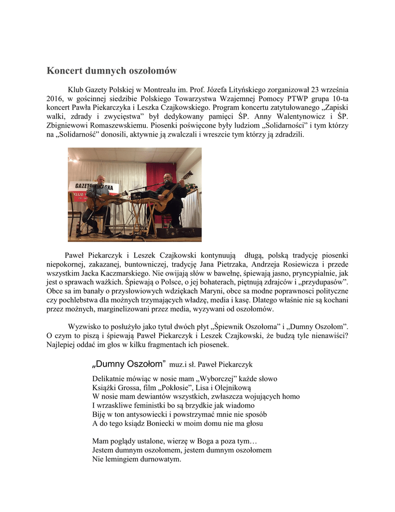 Koncert dumnych oszołomów Klub Gazety Polskiej w Montrealu im. Prof. Józefa Lityńskiego zorganizował 23 września 2016, w gościnnej siedzibie Polskiego Towarzystwa Wzajemnej Pomocy PTWP grupa 10-ta koncert Pawła Piekarczyka i Leszka Czajkowskiego. Program koncertu zatytułowanego „Zapiski walki, zdrady i zwycięstwa” był dedykowany pamięci ŚP. Anny Walentynowicz i ŚP. Zbigniewowi Romaszewskiemu. Piosenki poświęcone były ludziom „Solidarności” i tym którzy na „Solidarność” donosili, aktywnie ją zwalczali i wreszcie tym którzy ją zdradzili. Paweł Piekarczyk i Leszek Czajkowski kontynuują długą, polską tradycję piosenki niepokornej, zakazanej, buntowniczej, tradycję Jana Pietrzaka, Andrzeja Rosiewicza i przede wszystkim Jacka Kaczmarskiego. Nie owijają słów w bawełnę, śpiewają jasno, pryncypialnie, jak jest o sprawach ważkich. Śpiewają o Polsce, o jej bohaterach, piętnują zdrajców i „przydupasów”. Obce sa im banały o przysłowiowych wdziękach Maryni, obce sa modne poprawnosci polityczne czy pochlebstwa dla możnych trzymających władzę, media i kasę. Dlatego właśnie nie są kochani przez możnych, marginelizowani przez media, wyzywani od oszołomów. Wyzwisko to posłużyło jako tytuł dwóch płyt „Śpiewnik Oszołoma” i „Dumny Oszołom”. O czym to piszą i śpiewają Paweł Piekarczyk i Leszek Czajkowski, że budzą tyle nienawiści? Najlepiej oddać im głos w kilku fragmentach ich piosenek. „Dumny Oszołom” muz.i sł. Paweł Piekarczyk Delikatnie mówiąc w nosie mam „Wyborczej” każde słowo Książki Grossa, film „Pokłosie”, Lisa i Olejnikową W nosie mam dewiantów wszystkich, zwłaszcza wojujących homo I wrzaskliwe feministki bo są brzydkie jak wiadomo Biję w ton antysowiecki i powstrzymać mnie nie sposób A do tego ksiądz Boniecki w moim domu nie ma głosu Mam poglądy ustalone, wierzę w Boga a poza tym… Jestem dumnym oszołomem, jestem dumnym oszołomem Nie lemingiem durnowatym. Choć mass media plotą bzdury nie mam żadnych wątpliwości Co do wpływów agentury i do Bolka tożsamości A że sam nie byłem wtyką i nie brałem co nie moje Gardząc łotrów sofistyką IV RP się nie boję Nawet o raporcie MAK-u śmiem powiedzieć – to są kpiny! Z praw fizyki i z Polaków towarzyszki Anodiny .................... „Lepiej” muz. i sł. Leszek Czajkowski Chodzą o mnie cięte plotki tu i tam Że konfliktogenny sposób życia mam Lizusostwa nienawidzę Swych poglądów się nie wstydzę I z autorytetów szydzę Bo w ogóle jestem cham ... Czasem myślę czy nie warto w ramach prób Dla spokoju prawicowy zamknąć dziób Zamiast mieszkać w Ciemnogrodzie Europejskiej sprostać modzie Kosińskiego czytać co dzień i pedałów zwiedzić klub. Chociaż przyszłość ma poprawny model wasz Obłe życie wciąga człeka niczym hasz Jednak spiszcie mnie na straty Kręgosłupa nie mam z waty Wolę zbierać tęgie baty Ocalając przy tym twarz. Paweł Piekarczyk i Leszek Czajkowski śpiewają o dwóch wersjach Polski, tej Witolda Pileckiego i Jana Pawła II reprezentowanej przez Annę Walentynowicz i Zbigniewa Romaszewskiego i tej nazwanej Polska Sp. z o.o. Baumana, Urbana czy Michnika . Zniesmacza ich ograniczona odpowiedzialność za los Polski, mają talent i odwagę pięknie o tym śpiewać. Okazuje się, że podobnie jak w PRLu istnieje w III RP drugi obieg informacji. Płyty dumnych oszołomów wydaje Oficyna DRUGI OBIEG, teksty i wykonawców można znależć w internecie. Żyjemy w czasach informatycznego tsunami, globalnej propagandy poprawności politycznej, hedonizmu, mamonizmu i ciągłego, ogłupiającego pośpiechu. Warto czasem zwolnić, posłuchać oszołomów, zastanowić się nad tym dokąd to tak pędzimy, kto i w czyim interesie wodę z mózgu robi nam? Maciej Znojkiewicz 27.09.2016