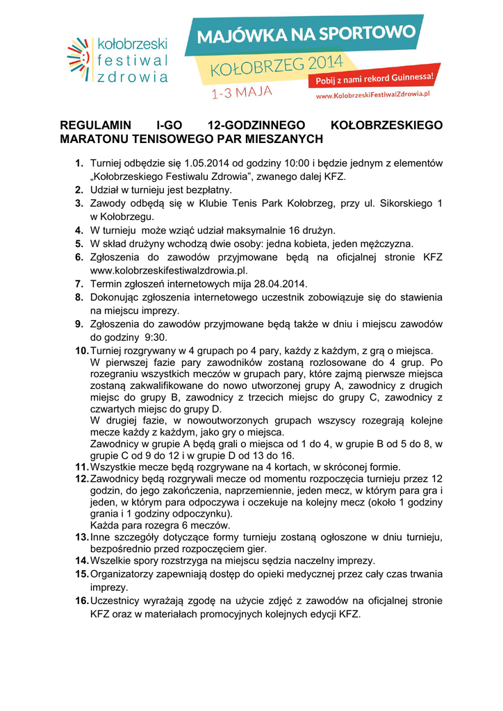 REGULAMIN I-GO 12-GODZINNEGO KOŁOBRZESKIEGO MARATONU TENISOWEGO PAR MIESZANYCH 1. Turniej odbędzie się 1.05.2014 od godziny 10:00 i będzie jednym z elementów „Kołobrzeskiego Festiwalu Zdrowia”, zwanego dalej KFZ. 2. Udział w turnieju jest bezpłatny. 3. Zawody odbędą się w Klubie Tenis Park Kołobrzeg, przy ul. Sikorskiego 1 w Kołobrzegu. 4. W turnieju może wziąć udział maksymalnie 16 drużyn. 5. W skład drużyny wchodzą dwie osoby: jedna kobieta, jeden mężczyzna. 6. Zgłoszenia do zawodów przyjmowane będą na oficjalnej stronie KFZ www.kolobrzeskifestiwalzdrowia.pl. 7. Termin zgłoszeń internetowych mija 28.04.2014. 8. Dokonując zgłoszenia internetowego uczestnik zobowiązuje się do stawienia na miejscu imprezy. 9. Zgłoszenia do zawodów przyjmowane będą także w dniu i miejscu zawodów do godziny 9:30. 10. Turniej rozgrywany w 4 grupach po 4 pary, każdy z każdym, z grą o miejsca. W pierwszej fazie pary zawodników zostaną rozlosowane do 4 grup. Po rozegraniu wszystkich meczów w grupach pary, które zajmą pierwsze miejsca zostaną zakwalifikowane do nowo utworzonej grupy A, zawodnicy z drugich miejsc do grupy B, zawodnicy z trzecich miejsc do grupy C, zawodnicy z czwartych miejsc do grupy D. W drugiej fazie, w nowoutworzonych grupach wszyscy rozegrają kolejne mecze każdy z każdym, jako gry o miejsca. Zawodnicy w grupie A będą grali o miejsca od 1 do 4, w grupie B od 5 do 8, w grupie C od 9 do 12 i w grupie D od 13 do 16. 11. Wszystkie mecze będą rozgrywane na 4 kortach, w skróconej formie. 12. Zawodnicy będą rozgrywali mecze od momentu rozpoczęcia turnieju przez 12 godzin, do jego zakończenia, naprzemiennie, jeden mecz, w którym para gra i jeden, w którym para odpoczywa i oczekuje na kolejny mecz (około 1 godziny grania i 1 godziny odpoczynku). Każda para rozegra 6 meczów. 13. Inne szczegóły dotyczące formy turnieju zostaną ogłoszone w dniu turnieju, bezpośrednio przed rozpoczęciem gier. 14. Wszelkie spory rozstrzyga na miejscu sędzia naczelny imprezy. 15. Organizatorzy zapewniają dostęp do opieki medycznej przez cały czas trwania imprezy. 16. Uczestnicy wyrażają zgodę na użycie zdjęć z zawodów na oficjalnej stronie KFZ oraz w materiałach promocyjnych kolejnych edycji KFZ. 17. Wszyscy uczestnicy turnieju otrzymają pamiątkowe koszulki oraz medale i dyplomy za udział w turnieju, a za pierwsze trzy miejsca pary zawodników otrzymają dodatkowo okolicznościowe statuetki.