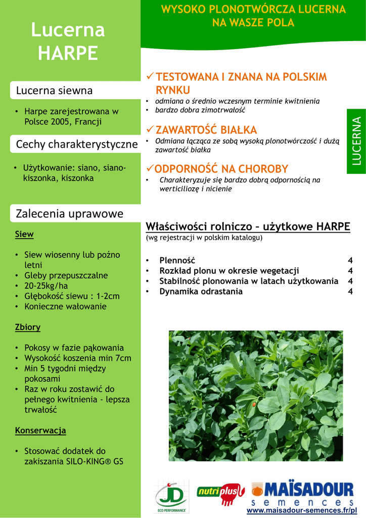 WYSOKO PLONOTWÓRCZA LUCERNA NA WASZE POLA Lucerna HARPE • Harpe zarejestrowana w Polsce 2005, Francji • odmiana o średnio wczesnym terminie kwitnienia • bardzo dobra zimotrwałość ZAWARTOŚĆ BIAŁKA Cechy charakterystyczne • Odmiana łącząca ze sobą wysoką plonotwórczość i dużą zawartość białka • Użytkowanie: siano, sianokiszonka, kiszonka ODPORNOŚĆ NA CHOROBY Zalecenia uprawowe Siew • Siew wiosenny lub poźno letni • Gleby przepuszczalne • 20-25kg/ha • Głębokość siewu : 1-2cm • Konieczne wałowanie LUCERNA Lucerna siewna TESTOWANA I ZNANA NA POLSKIM RYNKU • Charakteryzuje się bardzo dobrą odpornością na werticiliozę i nicienie Właściwości rolniczo – użytkowe HARPE (wg rejestracji w polskim katalogu) • • • • Plenność Rozkład plonu w okresie wegetacji Stabilność plonowania w latach użytkowania Dynamika odrastania 4 4 4 4 Zbiory • Pokosy w fazie pąkowania • Wysokość koszenia min 7cm • Min 5 tygodni między pokosami • Raz w roku zostawić do pełnego kwitnienia - lepsza trwałość S.A.S Konserwacja • Stosować dodatek do zakiszania SILO-KING® GS www.maisadour-semences.fr/pl