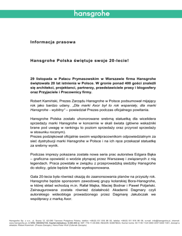Informacja prasowa Hansgrohe Polska świętuje swoje 20-lecie! 29 listopada w Pałacu Prymasowskim w Warszawie firma Hansgrohe świętowała 20 lat istnienia w Polsce. W gronie ponad 400 gości znaleźli się architekci, projektanci, partnerzy, przedstawiciele prasy i blogosfery oraz Przyjaciele i Pracownicy firmy. Robert Kamiński, Prezes Zarządu Hansgrohe w Polsce podsumował mijający rok jako bardzo udany. „Dla marki Axor był to rok wspaniały, dla marki Hansgrohe - wybitny“ – powiedział Prezes podczas oficjalnego powitania. Hansgrohe Polska zostało uhonorowane srebrną statuetką dla wicelidera sprzedaży marki Hansgrohe w koncernie w skali świata (główne wskaźniki brane pod uwagę w rankingu to poziom sprzedaży oraz przyrost sprzedaży w stosunku rocznym). Prezes podziękował oficjalnie swoim współpracownikom odpowiedzialnym za sieć dystrybucji marki Hansgrohe w Polsce i na ich ręce przekazał statuetkę za srebrny wynik. Podczas imprezy pokazana została nowa seria prac autorstwa Edgara Bąka – graficzna opowieść o wodzie płynącej przez Warszawę i związanych z nią legendach. Praca powstała w związku z przeprowadzką siedziby Hansgrohe do stolicy, gdzie będzie finalnie wyeksponowana. Gala 20-lecia była również okazją do zaanonsowania planów na przyszły rok. Hansgrohe będzie sponsorem zawodowej grupy kolarskiej Bora-Hansgrohe, w której skład wchodzą m.in. Rafał Majka, Maciej Bodnar i Paweł Poljański. Zainaugurowana została również działalność Akademii Dagmary czyli autorskiego wideobloga prowadzonego przez Dagmarę Jakubczak we współpracy z marką Axor. Hansgrohe Sp. z o.o., ul. Sowia 12, 62-080 Tarnowo Podgórne Polska, telefon +48/(0) 61/ 816 86 00, telefax +48/(0) 61/ 816 86 09, e-mail: [email protected], internet: www.hansgrohe.pl, nr KRS: 0000052155, Kapitał Zakładowy: 9.000.000 zł, NIP: 778-11-05-908, REGON: 630679633, Numer konta: 49 1140 1124 0000 3447 6300 1001, Zarząd w składzie: Robert Kamiński (Prezes Zarządu), Hans-Peter Wulf (Członek Zarządu) Tego wieczoru premierę miał spot telewizyjny firmujący kampanię reklamową firmy Hansgrohe pod hasłem „Meet the beauty of Water / Doświadcz piękna wody“. Spot reklamowy został zaprezentowany zgromadzonym w Pałacu Prymasowskim gościom oraz wemitowany w tym samym czasie po raz pierwszy w Niemczech, w kanale ARD. Wieczór uświetnił autorski program muzyczny Piotra Metza zaprezentowany tego wieczoru specjalnie dla gości Hansgrohe. Więcej informacji: Barbara Pol tel: 48 601 890 288 mail: [email protected] www.hansgrohe.pl Hansgrohe Sp. z o.o., ul. Sowia 12, 62-080 Tarnowo Podgórne Polska, telefon +48/(0) 61/ 816 86 00, telefax +48/(0) 61/ 816 86 09, e-mail: [email protected], internet: www.hansgrohe.pl, nr KRS: 0000052155, Kapitał Zakładowy: 9.000.000 zł, NIP: 778-11-05-908, REGON: 630679633, Numer konta: 49 1140 1124 0000 3447 6300 1001, Zarząd w składzie: Robert Kamiński (Prezes Zarządu), Hans-Peter Wulf (Członek Zarządu)