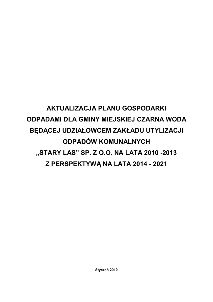 AKTUALIZACJA PLANU GOSPODARKI ODPADAMI DLA GMINY MIEJSKIEJ CZARNA WODA BĘDĄCEJ UDZIAŁOWCEM ZAKŁADU UTYLIZACJI ODPADÓW KOMUNALNYCH „STARY LAS” SP. Z O.O. NA LATA 2010 -2013 Z PERSPEKTYWĄ NA LATA 2014 - 2021 Styczeń 2010 SPIS TREŚCI 1 WSTĘP .......................................................................................................................................... 6 1.1 Podstawa prawna ................................................................................................................................... 6 1.2 Cel i zakres opracowania ......................................................................................................................... 6 1.3 Analiza aktualnego stanu prawnego ....................................................................................................... 7 1.4 Podstawowe informacje o Spółce ZUOK „Stary Las” ............................................................................... 9 2 PODSTAWOWE INFORMACJE CHARAKTERYZUJĄCE OBSZAR GMINY MIEJSKIEJ CZARNA WODA BĘDĄCEJ UDZIAŁOWCEM ZAKŁADU UTYLIZACJI ODPADÓW KOMUNALNYCH „STARY LAS” SP. Z O.O. ................................................................................ 11 2.1 Położenie geograficzne ......................................................................................................................... 11 2.2 Warunki glebowe .................................................................................................................................. 13 2.3 Warunki hydrologiczne i hydrogeologiczne ........................................................................................... 14 2.4 Sytuacja demograficzna ........................................................................................................................ 17 2.5 Uwarunkowania infrastrukturalne ........................................................................................................ 18 2.6 Sytuacja gospodarcza ............................................................................................................................ 18 2.7 Warunki geologiczne ............................................................................................................................. 21 3 ANALIZA AKTUALNEGO STANU GOSPODARKI ODPADAMI .................................... 22 3.1 Odpady komunalne ............................................................................................................................... 22 3.1.1 Rodzaje, źródła powstawania, ilość i jakość wytwarzanych odpadów komunalnych ........................ 22 3.1.2 Odpady ulegające biodegradacji ........................................................................................................ 26 3.1.3 Odpady niebezpieczne w strumieniu odpadów komunalnych. ......................................................... 27 3.1.4 Systemy gospodarowania odpadami komunalnymi .......................................................................... 28 3.1.4.1 Ilość odpadów odebranych z gminy miejskiej Czarna Woda będącej udziałowcem ZUOK „Stary Las” Sp. z o.o. ............................................................................................................................................... 28 3.1.4.2 Sposób postępowania z odpadami komunalnymi .................................................................... 30 3.1.4.3 Koszty związane z gospodarką odpadami komunalnymi.......................................................... 32 3.2 Odpady niebezpieczne .......................................................................................................................... 33 3.2.1 Zużyty sprzęt elektryczny i elektroniczny........................................................................................... 33 3.2.2 Odpady zawierające azbest ................................................................................................................ 33 3.2.3 Odpady zawierające PCB .................................................................................................................... 35 3.3 Odpady pozostałe ................................................................................................................................. 36 3.3.1 Komunalne osady ściekowe ............................................................................................................... 36 3.3.2 Odpady opakowaniowe ..................................................................................................................... 36 3.4 Istniejące systemy zbierania odpadów .................................................................................................. 39 3.4.1 Systemy zbierania odpadów komunalnych........................................................................................ 39 3.4.1.1 Systemy zbierania selektywnego odpadów.............................................................................. 41 3.4.2 Systemy zbierania odpadów niebezpiecznych ................................................................................... 43 Aktualizacja Planu Gospodarki Odpadami dla gminy miejskiej Czarna Woda będącej udziałowcem Zakładu Utylizacji Odpadów Komunalnych „Stary Las” Sp. z o.o. 3.4.3 Systemy zbierania odpadów pozostałych .......................................................................................... 43 3.5 Istniejące instalacje do odzysku i unieszkodliwiania odpadów .............................................................. 44 3.5.1 Istniejące instalacje do odzysku i unieszkodliwiania odpadów komunalnych ................................... 44 3.5.2 Istniejące instalacje do odzysku i unieszkodliwiania odpadów niebezpiecznych .............................. 46 3.5.3 Istniejące instalacje do odzysku i unieszkodliwienia odpadów pozostałych...................................... 46 3.5.4 Graficzne rozmieszczenie instalacji do odzysku i unies