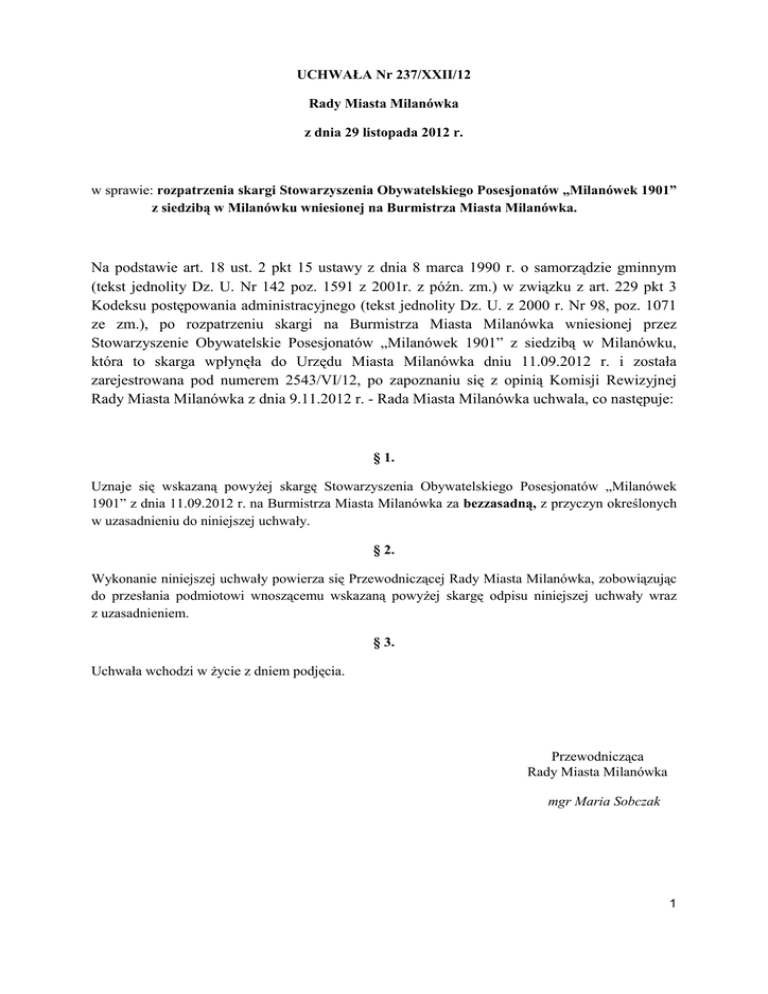 UCHWAŁA Nr 237/XXII/12 Rady Miasta Milanówka z dnia 29 listopada 2012 r. w sprawie: rozpatrzenia skargi Stowarzyszenia Obywatelskiego Posesjonatów „Milanówek 1901” z siedzibą w Milanówku wniesionej na Burmistrza Miasta Milanówka. Na podstawie art. 18 ust. 2 pkt 15 ustawy z dnia 8 marca 1990 r. o samorządzie gminnym (tekst jednolity Dz. U. Nr 142 poz. 1591 z 2001r. z późn. zm.) w związku z art. 229 pkt 3 Kodeksu postępowania administracyjnego (tekst jednolity Dz. U. z 2000 r. Nr 98, poz. 1071 ze zm.), po rozpatrzeniu skargi na Burmistrza Miasta Milanówka wniesionej przez Stowarzyszenie Obywatelskie Posesjonatów „Milanówek 1901” z siedzibą w Milanówku, która to skarga wpłynęła do Urzędu Miasta Milanówka dniu 11.09.2012 r. i została zarejestrowana pod numerem 2543/VI/12, po zapoznaniu się z opinią Komisji Rewizyjnej Rady Miasta Milanówka z dnia 9.11.2012 r. - Rada Miasta Milanówka uchwala, co następuje: § 1. Uznaje się wskazaną powyżej skargę Stowarzyszenia Obywatelskiego Posesjonatów „Milanówek 1901” z dnia 11.09.2012 r. na Burmistrza Miasta Milanówka za bezzasadną, z przyczyn określonych w uzasadnieniu do niniejszej uchwały. § 2. Wykonanie niniejszej uchwały powierza się Przewodniczącej Rady Miasta Milanówka, zobowiązując do przesłania podmiotowi wnoszącemu wskazaną powyżej skargę odpisu niniejszej uchwały wraz z uzasadnieniem. § 3. Uchwała wchodzi w życie z dniem podjęcia. Przewodnicząca Rady Miasta Milanówka mgr Maria Sobczak 1 Uzasadnienie Stowarzyszenie Obywatelskie Posesjonatów „Milanówek 1901” z siedzibą w Milanówku, skierowało do Rady Miasta Milanówka skargę na nienależyte wykonanie obowiązków przez Burmistrza Miasta Milanówka, do której rozpoznania właściwa jest Rada Miasta Milanówka, podstawie art. 227 w zw. z art. 229 pkt 3 ustawy z dnia 14 czerwca 1960 r. Kodeks postępowania administracyjnego (Dz. U. z 2000 r. Nr 98, poz. 1071 z późn. zm.). Skargę wniesiono pragnąc zwrócić uwagę Rady Miasta na przypadek nieprawidłowego funkcjonowania Urzędu Miasta Milanówka, polegający na wybiórczym czuwaniu nad przestrzeganiem przepisów prawa o ochronie zabytków w granicach zespołu urbanistyczno – krajobrazowego miasta Milanówka. W skardze, której nadano numer 2543/VI/12, jako przejaw nienależytego wykonania obowiązków przez Burmistrza Miasta Milanówka, Stowarzyszenie zarzuciło Burmistrzowi zaniechanie skorzystania z prawa wniesienia odwołania od decyzji Powiatowego Inspektora Nadzoru Budowlanego Powiatu Grodziskiego nr 199/12 z dnia 28.06.2012 r. nakazującej zamurowanie jednego z otworów okiennych w budynku przy ul. Warszawskiej 28 w Milanówku, której Miasto jest jednym ze współwłaścicieli w szczególności ze względu na nie uwzględnione przez organ I instancji przepisy ustawy o ochronie zabytków. Powyższa sprawa została przekazana do zaopiniowania Komisji Rewizyjnej Rady Miasta Milanówka, zgodnie z treścią § 12 ust. 1 w zw. z § 13 ust. 1 Regulaminu Komisji Rewizyjnej, stanowiącego załącznik nr 4 do Statutu Miasta Milanówka, przyjętego Uchwałą nr 411/XXV/10 Rady Miasta Milanówka z dnia 27 kwietnia 2010 r. w sprawie nadania Statutu Miasta Milanówka (opublikowaną w Dzienniku Urzędowym Województwa Mazowieckiego z 2010 r. Nr 155, poz. 3801). Komisja Rewizyjna podczas posiedzenia w dniu 9.11.2012 r. wyraziła swoją opinię, że skarga nr 2543/VI/12 powinna zostać uznana za zasadną. Przed zajęciem stanowiska Komisja zapoznała Przedstawiciela Skarżącego Stowarzyszenia z wyjaśnieniami Burmistrza. O wyrażeniu przez Komisję Rewizyjną powyższej opinii uznającej skargę nr 2543/VI/12 za zasadną nie przesądziło uznanie zarzutów skargi za trafne lecz przesądziło uznanie zawartej w Stanowisku Burmistrza argumentacji za nietrafną, a także niekompletną i pozbawioną rzetelnego odniesienia do wszystkich znanych z urzędu Burmistrzowi Miasta Milanówka okoliczności wydania Decyzji Nakazowej PINB w stosunku do budynku przy ul. Warszawskiej 28 w Milanówku. Rada Miasta Milanówka, po zapoznaniu się ze skargą oraz wyżej opisaną opinią Komisji Rewizyjnej, jak również ze stanowiskiem Burmistrza Miasta Milanówka zawartym w piśmie z dnia 7 listopada 2012 roku podjęła niniejszą uchwałę uznającą skargą za bezzasadną. Podejmując uchwałę Rada Miasta Milanówka kierowała się następującymi faktami. Decyzją Nr 199/12 z dnia 28.06.2012 r. Powiatowy Inspektor Nadzoru Budowlanego w Powiecie Grodziskim nakazał współwłaścicielom budynku przy ul. Warszawskiej 28 w Milanówku, w tym Gminie Milanówek, zamurowanie otworu okiennego w ścianie znajdującej się w granicy działki budowlanej, w terminie 2 miesięcy od dnia kiedy decyzja stanie się ostateczna. W uzasadnieniu decyzji organ wywiódł, iż okno o wym. 20 x 80 cm wykonane w latach osiemdziesiątych XX wieku, na wysokości strychu budynku, zrealizowane zostało z naruszeniem reżimu warunków techniczno - budowlanych obowiązujących na przestrzeni istnienia obiektu. Miasto Milanówek reprezentowane przez Burmistrza było jedną ze stron postępowania administracyjnego prowadzonego przez Powiatowego Inspektora Nadzoru Budowlanego w Grodzisku Mazowieckim. Uprawnienie strony przysługiwało Miastu z uwagi na udział w prawie własności nieruchomości wynoszący 0,05 części. Miasto korzystało z prawa strony na etapie postępowania I instancyjnego poprzez zapoznanie się ze zgromadzonym materiałem dowodowym i ustaleniami organu. W trakcie tego postępowania starano się również dokonać we własnym zakresie ustaleń, które mogłyby okazać się korzystne dla Miasta. W zasobach Miasta nie znaleziono jednak żadnych pomocnych dokumentów. Po otrzymaniu decyzji administracyjnej Burmistrz wraz z odpowiednio wykwalifikowanymi służbami Urzędu Miasta dokonali przeanalizowania stanowiska organu nadzoru budowlanego zawartego w decyzji nr 199/12 zarówno 2 pod względem formalnym 