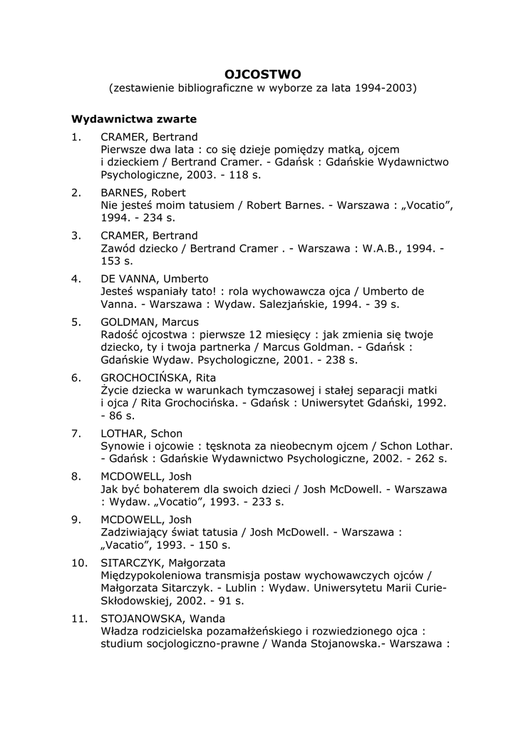 OJCOSTWO (zestawienie bibliograficzne w wyborze za lata 1994-2003) Wydawnictwa zwarte 1. CRAMER, Bertrand Pierwsze dwa lata : co się dzieje pomiędzy matką, ojcem i dzieckiem / Bertrand Cramer. - Gdańsk : Gdańskie Wydawnictwo Psychologiczne, 2003. - 118 s. 2. BARNES, Robert Nie jesteś moim tatusiem / Robert Barnes. - Warszawa : „Vocatio”, 1994. - 234 s. 3. CRAMER, Bertrand Zawód dziecko / Bertrand Cramer . - Warszawa : W.A.B., 1994. 153 s. 4. DE VANNA, Umberto Jesteś wspaniały tato! : rola wychowawcza ojca / Umberto de Vanna. - Warszawa : Wydaw. Salezjańskie, 1994. - 39 s. 5. GOLDMAN, Marcus Radość ojcostwa : pierwsze 12 miesięcy : jak zmienia się twoje dziecko, ty i twoja partnerka / Marcus Goldman. - Gdańsk : Gdańskie Wydaw. Psychologiczne, 2001. - 238 s. 6. GROCHOCIŃSKA, Rita Życie dziecka w warunkach tymczasowej i stałej separacji matki i ojca / Rita Grochocińska. - Gdańsk : Uniwersytet Gdański, 1992. - 86 s. 7. LOTHAR, Schon Synowie i ojcowie : tęsknota za nieobecnym ojcem / Schon Lothar. - Gdańsk : Gdańskie Wydawnictwo Psychologiczne, 2002. - 262 s. 8. MCDOWELL, Josh Jak być bohaterem dla swoich dzieci / Josh McDowell. - Warszawa : Wydaw. „Vocatio”, 1993. - 233 s. 9. MCDOWELL, Josh Zadziwiający świat tatusia / Josh McDowell. - Warszawa : „Vacatio”, 1993. - 150 s. 10. SITARCZYK, Małgorzata Międzypokoleniowa transmisja postaw wychowawczych ojców / Małgorzata Sitarczyk. - Lublin : Wydaw. Uniwersytetu Marii CurieSkłodowskiej, 2002. - 91 s. 11. STOJANOWSKA, Wanda Władza rodzicielska pozamałżeńskiego i rozwiedzionego ojca : studium socjologiczno-prawne / Wanda Stojanowska.- Warszawa : Wydaw. Akademii Pedagogiki Specjalnej im. Marii Grzegorzewskiej, 2000. - 335 s. Artykuły z czasopism 12. AUGUSTYN, Józef Nadzieje na odbudowanie ojcostwa / Józef Augustyn // Przegląd Powszechny. - 1999, nr 5, s. 197-207 13. AUGUSTYN, Józef Dojrzewanie do ojcostwa / Józef Augustyn // Więź. - 1996, nr 6, s. 65-75 14. BAUM, Mirosław Rodziny samotnych ojców : przegląd stanowisk / Mirosław Baum // Edukacja i Dialog. - 1996, nr 8, s. 36-42 15. BIELAT, Andrzej Ojcostwo w komuniźmie / Andrzej Bielat // Więź. - 1996, nr 6, s. 35-50 16. GRANDIS, Giancarlo Ojcostwo i synostwo / Giancarlo Grandis // Społeczeństwo. 1999, nr 4, s. 793-810 17. JANKOWSKA, Adrianna Ojcostwo końca wieku / Adrianna Jankowska // Forum Oświatowe. - 2000, t. 1, s. 103-134 18. LEWANDOWSKA, Izabela Badanie DNA, czyli ojcostwo praktycznie pewne / Izabela Lewandowska // Rzeczpospolita. - 2000, nr 120, s. C 3 19. MAZAN, Andrzej Ojcostwo dnia codziennego / Andrzej Mazan // Studia nad Rodziną. - 1999, nr 2, s. 155-161 20. MAJDAŃSKI, Kazimierz Ojcostwo jako podstawowe posłannictwo mężczyzny / Kazimierz Majdański // Studia nad Rodziną. - 1999, nr 2, s. 5-10 21. MENDAL, Eugenia Stereotypy matki i ojca u dzieci w różnym wieku / Eugenia Mendal // Psychologia Wychowawcza. - 1998, nr 4, s. 333-338 22. NOWOSIELSKI, Mirosław Kryzys ojcostwa / Mirosław Nowosielski // Studia nad Rodziną. 1999, nr 2, s. 101-104 23. POSPISZYL, Kazimierz Czy zmierzch rodziny patriarchalnej? / Kazimierz Pospiszyl // Problemy Rodziny. - 1996, nr 6, s. 11-17 24. POSPISZYL, Kazimierz Pigmalion i Galatea, czyli dominujący ojciec uległej córki / Kazimierz Pospiszyl // Problemy Rodziny. - 1996, nr 1. s. 29-33 25. SOBIERAJ, Krzysztof Dar ojcostwa – łaska i odpowiedzialność / Krzysztof Sobieraj // Studia nad Rodziną. - 1999, nr 2, s. 145-154 26. STOJANOWSKA, Wanda Ojcostwo w aspekcie prawnym / Wanda Stojanowska // Studia nad Rodziną. - 1999, nr 2, s. 155-161 27. SZCZUKIEWICZ, Piotr Rodzicielstwo po męsku / Piotr Szczukiewicz // Remedium. - 2001, nr 10, s. 22-23 28. TYSZKA, Agnieszka Kochane dranie / Agnieszka Tyszka // Wprost. - 1999, nr 38, s. 66-67 29. WARZESZCZAK, Stanisław Etyczny wymiar ojcostwa / Stanisław Warzeszczak // Homo Dei. 2000, nr 1, s. 58-71 30. WÓJCIK, Monika Rodowód ojcostwo / Monika Wójcik // Studia nad Rodziną. - 1999, nr 2, s. 29-40 Opracowała Małgorzata Pidek