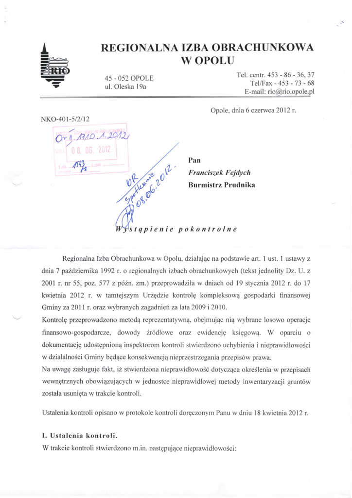 REGIONALNA IZBA OBRACHUNKOWA W OPOLU Tel.centr. 453-86-36, 37 45 - 052 OPOLE ul.Oleska 19a Tel/Fax - 453 - 73 - 68 E-mail: [email protected] Opole, dnia 6 czerwca 2012 r. NKO-401-5/2/12 Pan '*& (] I* Franciszek Fejdych Burmistrz Prudnika stqpienie pokontrolne Regionalna Izba Obrachunkowa w Opolu, dzialajac na podstawie art. 1 ust. 1 ustawy z dnia 7 pazdziernika 1992 r. o regionalnych izbach obrachunkowych (tekst jednolity Dz. U. z 2001 r. nr 55, poz. 577 z pozn. zm.) przeprowadzila w dniach od 19 stycznia 2012 r. do 17 kwietnia 2012 r. w tamtejszym Urzedzie kontrole kompleksowa gospodarki finansowej Gminy za 2011 r. oraz wybranych zagadnien za lata 2009 i 2010. Kontrole przeprowadzono metodq reprezentatywna. obejmujac nia wybrane losowo operacje finansowo-gospodarcze. dowody zrodlowe oraz ewidencje ksiegowa. W oparciu o dokumentacje udostepniona inspektorom kontroli stwierdzono uchybienia i nieprawidlowosci w dzialalnosci Gminy bed^ce konsekwencj^ nieprzestrzegania przepisow prawa. Na irwag? zasluguje fakt, iz stwierdzona nieprawidlowosc dotyczaca okreslenia w przepisach wewnetrznych obowiazujacych w jednostce nieprawidlowej metody inwentaryzacji gruntow zostala usunieta w trakcie kontroli. Ustalenia kontroli opisano w protokole kontroli doreczonym Panu w dniu 18 kwietnia 2012 r. I. Ustalenia k o n t r o l i . W trakcie kontroli stwierdzono m.in. nastepujace nieprawidlowosci: 1. Naruszenie przepisow w zakresie inwentaryzacji polegajace na niewlasciwym przeprowadzeniu inwentaryzacji gruntow na koniec 2011 roku (protokol kontroli str. 115- 118). Odpowiedzialnosc ponoszzj czlonkowie Komisji Inwentaryzacyjnej oraz z nadzoru Burrnistrz Prudnika. Powyzsza nieprawidlowosc moze wypelniac znamiona czynu okreslonego w przepisach ustawy z dnia 17 grudnia 2004 r. o odpowiedzialnosci za naruszenie dyscypliny finansow publicznych (Dz. U. z 2005 r. nr 14, poz. 114 z pozn. zm.). 2. Nieustalenie trwalego zarzadu wobec nieruchomosci gminnych przekazanych na rzecz jednostek organizacyjnych Gminy dzialajacych w formie jednostek budzetowych i samorzadowego zakladu budzetowego (protokol kontroli str, 125-130). Odpowiedzialnosc ponosi byly i obecny Burrnistrz Prudnika. 3. Nieprawidlowe obliczenie kwot bazowych niezbednych do obliczenia wysokosci funduszu soleckiego na 2010 i 2011 rok. czego skutkiem bylo zawyzenie w tych latach wysokosci funduszu soleckiego o laczna^ kwote 3.440,39 zl oraz wykazanie we wniosku do Wojewody Opolskiego o zwrot z budzetu pahstwa czesci wydatkow Gminy wykonanych w ramach funduszu soleckiego za 2010 r. kwoty zwrotu zawyzonej o 130,10 zl (protokol kontroli str. 130-134, 139-140). Odpowiedzialnosc ponoszq inspektor Wydzialu Gospodarki Komunalnej Ochrony Srodowiska i Rolnictwa oraz Skarbnik Gminy. [I. Wnioski p o k o n t r o l n e . W celu usuniecia stwierdzonych uchybien i nieprawidlowosci oraz usprawnienia prowadzenia zagadnien obj^tych kontrola, Regionalna Izba Obrachunkowa w Opolu dzialajac na podstawie art. 9 ust. 2 powolanej na wstepie ustawy o regionalnych izbach obrachunkowych, wnosi o pehie wykorzystanie ustaleii zawartych w protokole kontroli oraz o podjecie skutecznych dzialan w celu wyeliminowania powstalych nieprawidlowosci, a w szczegolnosci o realizacj^ nastepujqcych wnioskow: 1. Zapewnic przestrzeganie zasad przeprowadzania inwentaryzacji gruntow, drog$ porownania danych ksiag rachunkowych z odpowiednimi dokumentami i weryfikacji wartosci tych skladnikow, zgodnie z przepisami art. 26 ust. 1 pkt 3 ustawy z dnia 29 wrzesnia 1994 r. o rachunkowosci (tekst jednolity Dz. U. z 2009 r. nr 152, poz. 1223 zpozn. zm.)2. Podjac dzialania w celu prawidtowego uregulowania formy wladania nieruchomosciami gminnymi przekazanymi jednostkom organizacyjnym gminy. Przekazujac jednostkom budzetowym i samorzadowym zakladom budzetowym nieposiadajacym osobowosci prawnej nieruchomosci niezbedne do wykonywania ich statutowej dzialalnosci stosowac instytucje trwalego zarz^du. stosownie do przepisow art. 43 ustawy z dnia 21 sierpnia 1997 r. o gospodarce nieruchomosciami (tekst jednolity Dz. U. z 2010 r. nr 102, poz. 651 z pozn. zm.). 3. Dokonac korekty wniosku skierowanego do Wojewody Opolskiego o zwrot z budzetu paiistwa czesci wydatkow Gminy wykonanych w ramach funduszu soleckiego za 2010 r. oraz zwrocic nienaleznie uzyskana kwote zwrotu poniesionych wydatkow wykonanych w ramach funduszu soleckiego za 2010 r. Dokonac korekty wielkosci funduszu soleckiego za 2011 r. do wysokosci wynikajacej z prawidlowego obliczenia. Zapewnic przestrzeganie w tym zakresie przepisow art. 2 ust. 1 ustawy z dnia 20 lutego 2009 r. o funduszu soleckim (Dz. U. nr 52 poz. 420 z pozn. zm.). Stosownie do postanowien art. 9 ust. 3 cyt. ustawy o regionalnych izbach obrachunkowych, oczekuje w terminie 30 dni od daty otrzymania niniejszego wystapienia pokontrolnego pisemnej informacji o wykonaniu wnioskow pokontrolnych w nim zawartych lub przyczynach ich niewykonania. Poinformowanie Izby niezgodnie z prawda o wykonaniu wnioskow pokontrolnych w mysl art. 27 ww. ustawy zagrozone jest kar^ grzywny. Zgodnie z art. 9 ust. 3 i 4 ustawy o regionalnych izbach obrachunkowych do wnioskow zawartych w: wystapieniu pokontrolnym przysluguje prawo wniesienia zastrzezen do Kolegium Izby w terminie 14 dni od daty otrzymania wystapienia pokontrolnego. Podstaw^ zgloszenia zastrzezen moze bye tylko zarzut naruszenia prawa przez bledn^ jego wykladnie lub niewlasciwe zastosowanie. Do wiadomosci: Rada Miejska 7. GalkiewicK