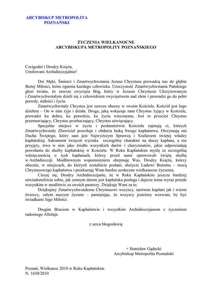 ARCYBISKUP METROPOLITA POZNAŃSKI ŻYCZENIA WIELKANOCNE ARCYBISKUPA METROPOLITY POZNAŃSKIEGO Czcigodni i Drodzy Księża, Umiłowani Archidiecezjalnie! Dni Męki, Śmierci i Zmartwychwstania Jezusa Chrystusa prowadzą nas do głębin Bożej Miłości, która ogarnia każdego człowieka. Uroczystość Zmartwychwstania Pańskiego głosi światu, że zawsze zwycięża Bóg, który w Jezusie Chrystusie Ukrzyżowanym i Zmartwychwstałym dzieli się z człowiekiem zwycięstwem nad złem i prowadzi go do pełni prawdy, miłości i życia. Zmartwychwstały Chrystus jest zawsze obecny w swoim Kościele. Kościół jest Jego dziełem – On w nim żyje i działa. Droga, jaką wskazuje nam Chrystus żyjący w Kościele, prowadzi ku dobru, ku prawdzie, ku życiu wiecznemu. Jest to przecież Chrystus przemawiający, Chrystus przebaczający, Chrystus uświęcający. Specjalne miejsce w życiu i posłannictwie Kościoła zajmują ci, których Zmartwychwstały Zbawiciel powołuje i obdarza łaską Swego kapłaństwa. Otrzymują oni Ducha Świętego, który sam jest Najwyższym Sprawcą i Szafarzem świętej władzy kapłańskiej. Sakrament święceń wyciska szczególny charakter na duszy kapłana, a raz przyjęty, trwa w nim jako źródło wszystkich darów i charyzmatów, jakie odpowiadają powołaniu do służby kapłańskiej w Kościele. W Roku Kapłańskim myślę ze szczególną wdzięcznością o tych kapłanach, którzy przed nami sprawowali świętą służbę w Archidiecezji. Modlitewnym wspomnieniem obejmuję Was, Drodzy Księża, którzy obecnie, w miejscach, do których zostaliście posłani, służycie Ludowi Bożemu – mocą Chrystusowego kapłaństwa i przekazuję Wam bardzo serdeczne wielkanocne życzenia. Cieszę się, Drodzy Archidiecezjanie, że w Roku Kapłańskim jeszcze bardziej uświadomiliście sobie, jak cennym darem jest kapłańska posługa i dajecie temu wyraz przede wszystkim w modlitwie za swoich pasterzy. Dziękuję Wam za to. Dziękujmy Zmartwychwstałemu Chrystusowi wszyscy, zarówno kapłani jak i wierni świeccy, całym naszym życiem – pamiętając, że wszyscy jesteśmy wezwani, by być świadkami Jego Miłości. Drogim Braciom w Kapłaństwie i wszystkim Archidiecezjanom z życzeniem radosnego Alleluja z serca błogosławię + Stanisław Gądecki Arcybiskup Metropolita Poznański Poznań, Wielkanoc 2010 w Roku Kapłańskim N. 1650/2010