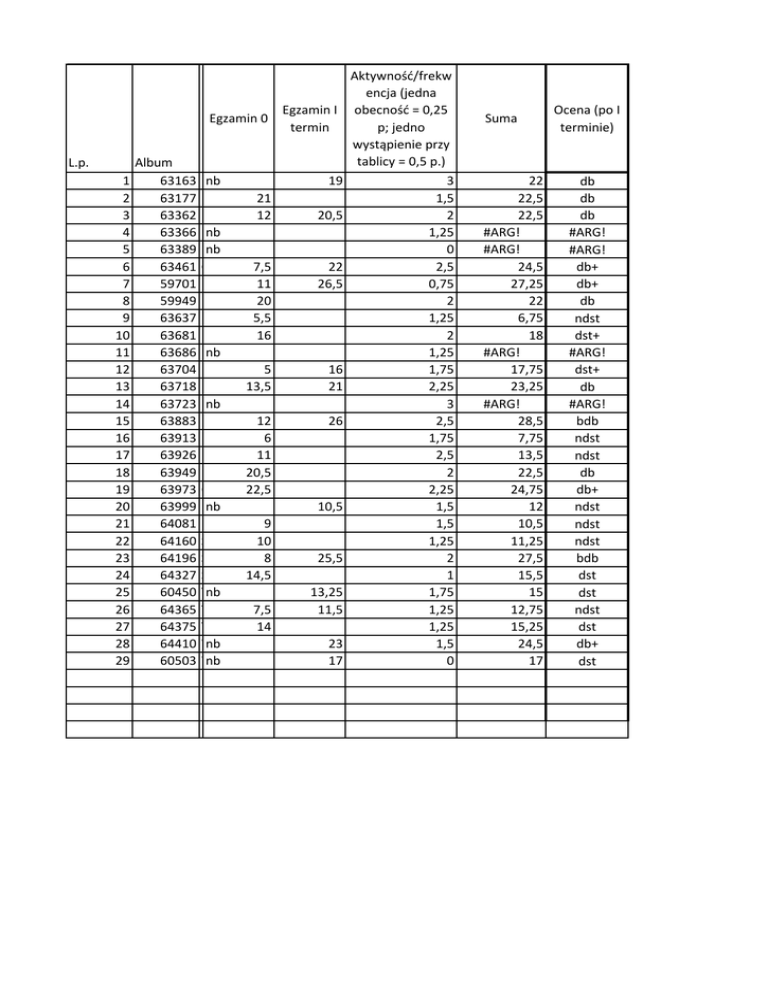 Egzamin 0 L.p. 1 2 3 4 5 6 7 8 9 10 11 12 13 14 15 16 17 18 19 20 21 22 23 24 25 26 27 28 29 Album 63163 63177 63362 63366 63389 63461 59701 59949 63637 63681 63686 63704 63718 63723 63883 63913 63926 63949 63973 63999 64081 64160 64196 64327 60450 64365 64375 64410 60503 Egzamin I termin Nazwisko i imiona Bartman nb Natalia 19 Below Łukasz 21 Dymowska 12Joanna 20,5 Dzięcioł nb Artur Flis nb Paulina Grabowski 7,5Krzysztof 22 Kapella Emilia 11 26,5 Karbowska 20Martyna Konopka 5,5 Agnieszka Kozłowska16Justyna Kraśniewska nb Maria Kubacki Piotr 5 16 Kucięba13,5 Kacper 21 Kula nb Daria Michalski 12 Tomasz 26 Mróz Roksana 6 Napiórkowska 11 Adrianna Nowacki20,5 Adam Opalińska 22,5 Alicja Paradecki nb Gabriel 10,5 Porycki Filip9 Sapko Marcin 10 Skóra Martyna 8 25,5 Śmigielska 14,5Marta Tomica nb Izaak 13,25 Troczyński 7,5Kacper 11,5 Trzeciak Paulina 14 Wąsiewicz nb Karina 23 Wilk nb Artur 17 Aktywność/frekw encja (jedna obecność = 0,25 p; jedno wystąpienie przy tablicy = 0,5 p.) 3 1,5 2 1,25 0 2,5 0,75 2 1,25 2 1,25 1,75 2,25 3 2,5 1,75 2,5 2 2,25 1,5 1,5 1,25 2 1 1,75 1,25 1,25 1,5 0 Suma 22 22,5 22,5 #ARG! #ARG! 24,5 27,25 22 6,75 18 #ARG! 17,75 23,25 #ARG! 28,5 7,75 13,5 22,5 24,75 12 10,5 11,25 27,5 15,5 15 12,75 15,25 24,5 17 Ocena (po I terminie) db db db #ARG! #ARG! db+ db+ db ndst dst+ #ARG! dst+ db #ARG! bdb ndst ndst db db+ ndst ndst ndst bdb dst dst ndst dst db+ dst
