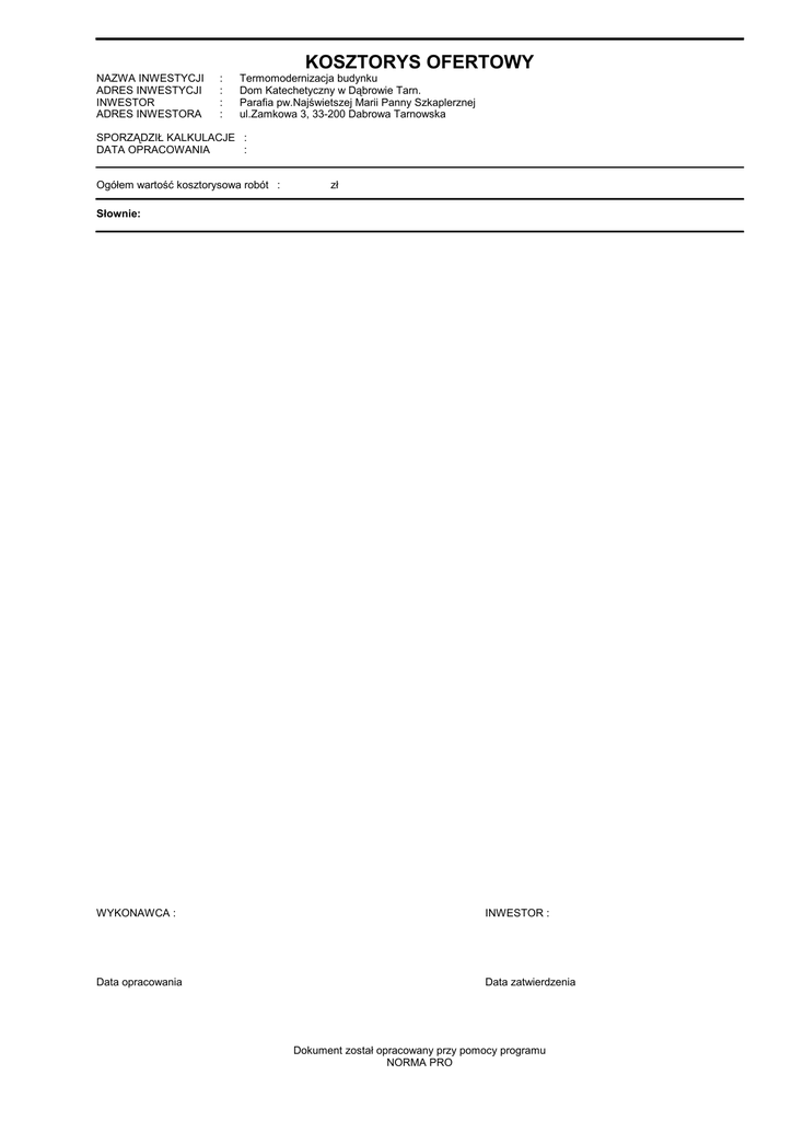 KOSZTORYS OFERTOWY NAZWA INWESTYCJI ADRES INWESTYCJI INWESTOR ADRES INWESTORA : : : : Termomodernizacja budynku Dom Katechetyczny w Dąbrowie Tarn. Parafia pw.Najświetszej Marii Panny Szkaplerznej ul.Zamkowa 3, 33-200 Dabrowa Tarnowska SPORZĄDZIŁ KALKULACJE : DATA OPRACOWANIA : Ogółem wartość kosztorysowa robót : zł Słownie: WYKONAWCA : INWESTOR : Data opracowania Data zatwierdzenia Dokument został opracowany przy pomocy programu NORMA PRO Bud. Katechetyczny L Podstawa Opis jm p. 1 Roboty przygotowawcze 1 KNR 4-01 Rozebranie obróbek blacharskich murów ognio- m2 d.1 0535-08 wych, attyk, pasów podrynnowych itp.z blachy nie nadającej się do uŜytku obmiar = 26.0*2*0.5+30*2*0.5 = 56.000m2 1* 2 KNR 4-01 d.1 0535-06 1* 3 KNR 4-01 d.1 0535-08 1* 4 KNR 4-04 d.1 1107-01 1* 2* 5 KNR 4-04 d.1 1107-04 1* 6 KNR 2-31 d.1 0815-02 1* 6' KNR 4-04 d.1 1104-01 -- R -robocizna' 0.3r-g/m2 Razem koszty bezpośrednie: Ceny jednostkowe Rozebranie rur spustowych z blachy nie nadającej się do uŜytku obmiar = 12*8 = 96.000m -- R -robocizna 0.11r-g/m Razem koszty bezpośrednie: Ceny jednostkowe Rozebranie obróbek blacharskich - podokienniki - z blachy nie nadającej się do uŜytku obmiar = (31.75+34.7+91.2+60.6)*0.4 = 87.300m2 r-g r-g 10.5600 m2 r-g -- S -samochód skrzyniowy do 5 t m-g 0.83m-g/t Razem koszty bezpośrednie: Ceny jednostkowe Transport złomu samochodem skrzyniowym t dodatek za kaŜdy rozpoczęty km ponad 1 km obmiar = 3*3 = 9.000t -- S -samochód skrzyniowy do 5 t m-g 0.036m-g/t Razem koszty bezpośrednie: Ceny jednostkowe Rozebranie opaski wokół budynku z płytek be- m2 tonowych 50x50x7 cm na podsypce piaskowej obmiar = (28+26+11+13+8+13+9+26)*0.5 = 67.000m2 -- R -robocizna 0.1249r-g/m2 Razem koszty bezpośrednie: Ceny jednostkowe Transp.płytek chodnikowych betonow.o masie do 50 kg przy ręcznym załadowaniu i wyładowaniu samoch.skrzyniowymi na odleg. 1 km obmiar = 0.0616*67 = 4.127t 16.8000 m -- R -robocizna r-g 0.3r-g/m2 Razem koszty bezpośrednie: Ceny jednostkowe Transport złomu samochodem skrzyniowym z t załadunkiem i wyładunkiem ręcznym na odl. do 1 km obmiar = 3t -- R -robocizna 1.71r-g/t Nakłady r-g 26.1900 5.1300 2.4900 0.3240 8.3683 t 1* -- R -robocizna 0.8r-g/t r-g 3.3016 2* -- S -samochód skrzyniowy do 5 t 0.312m-g/t m-g 1.2876 -2- Norma PRO Wersja 4.01, Marzec 2003 r. Licencja: 37337 dla AB Koszt jedn. R M S Bud. Katechetyczny L p. Podstawa 7 KNR 4-04 d.1 1104-03 1* 8 KNR 4-03 d.1 1139-06 1* Opis jm Razem koszty bezpośrednie: Ceny jednostkowe Transp.płytek chodnikowych betonow. przy ręcznym załadowaniu i wyładowaniu samoch.skrzyniowymi - dod.za kaŜdy nast.rozp. 1 km obmiar = 0.0616*67 = 4.127t Nakłady R M S t -- S -samochód skrzyniowy do 5 t m-g 0.033m-g/t Razem koszty bezpośrednie: Ceny jednostkowe DemontaŜ przewodów uziemiajacych i odgrom mowych z płaskownika o przekroju do 120 mm2 mocowanych na wspornikach na ścianie w ciągu pionowym obmiar = 8*13.5 = 108.000m -- R -robocizna 0.0945r-g/m Razem koszty bezpośrednie: Ceny jednostkowe Koszt jedn. r-g 0.1362 10.2060 PODSUMOWANIE RAZEM Robocizna Roboty przygotowawcze Materiały Sprzęt RAZEM Koszty pośrednie [Kp] RAZEM Zysk [Z] RAZEM OGÓŁEM Słownie: -3- Norma PRO Wersja 4.01, Marzec 2003 r. Licencja: 37337 dla AB Bud. Katechetyczny L Podstawa Opis p. 2 Wymiana okien i drzwi 9 KNR 0-19 Okna w domu katechetycznym - Wymiana d.2 0929-05 okien zespolonych na okna rozwierane i uchylno-rozwierane jednodzielne z PCV o pow. do 1.0 m2 obmiar = 3.5m2 1* 2* 3* 4* 5* 6* 7* 8* 9* 10* 10 KNR 0-19 d.2 0929-06 1* 2* 3* 4* 5* 6* 7* 8* 9* 10* 11 KNR 0-19 d.2 0929-07 -- R -robocizna 6.8r-g/m2 -- M -kotwy stalowe 10.18szt/m2 pianka poliuretanowa 0.205kg/m2 silikon 0.09dm3/m2 gips szpachlowy 0.0034t/m2 Szpachlówka do tynków Ceresit CT 29, opak. 25 kg (dostawca: HEN) 6.12kg/m2 materiały pomocnicze 1.5% okna i drzwi balkonowe z tworzyw 1m2/m2 jm m2 r-g 23.8000 szt 35.6300 kg 0.7175 dm3 0.3150 t 0.0119 kg 21.4200 % 1.5000 m2 3.5000 -- S -wyciąg m-g 0.05m-g/m2 środek transportowy m-g 0.06m-g/m2 Razem koszty bezpośrednie: Ceny jednostkowe Okna w domu katechetycznym- Wymiana okien m2 zespolonych na okna rozwierane i uchylno-rozwierane jednodzielne z PCV o pow. ponad 1.5 m2 obmiar = 2.7m2 -- R -robocizna 4.68r-g/m2 -- M -dyble 6.26kg/m2 Pianka poliuretanowa 0.238kg/m2 silikon 0.07dm3/m2 gips szpachlowy 0.0027t/m2 mineralna szpachlówka do tynków zewnętrznych 4.86kg/m2 materiały pomocnicze 1.5% okna i drzwi balkonowe z tworzyw 1m2/m2 0.1750 0.2100 r-g 12.6360 kg 16.9020 kg 0.6426 dm3 0.1890 t 0.0073 kg 13.1220 % 1.5000 m2 2.7000 -- S -wyciąg m-g 0.05m-g/m2 środek transportowy m-g 0.06m-g/m2 Razem koszty bezpośrednie: Ceny jednostkowe Wymiana okien zespolonych na okna rozwiera- m2 ne i uchylno-rozwierane jednodzielne z PCV o pow. ponad 1.5 m2 obmiar = 238.3m2 -- R -- -4- Norma PRO Wersja 4.01, Marzec 2003 r. Licencja: 37337 dla AB Nakłady 0.1350 0.1620 Koszt jedn. R M S Bud. Katechetyczny L p. 1* Podstawa 2* 3* 4* 5* 6* 7* 8* 9* 10* 12 KNR 0-19 d.2 0931-08 1* 2* 3* 4* 5* 6* 7* 13 K.I. d.2 1* 14 KNR 4-01 d.2 0304-02 1* Opis robocizna 4.68r-g/m2 -- M -kotwy stalowe 4.8szt/m2 pianka poliuretanowa 0.33dm3/m2 silikon 0.06dm3/m2 gips szpachlowy 2.34kg/m2 mineralna szpachlówka do tynków zewnętrznych 4.2kg/m2 materiały pomocnicze 1.5% okna i drzwi balkonowe z tworzyw 1m2/m2 jm Nakłady r-g 1115.2440 szt 1143.8400 dm3 78.6390 dm3 14.2980 kg 557.6220 kg 1000.8600 % 1.5000 m2 238.3000 -- S -wyciąg m-g 0.05m-g/m2 środek transportowy m-g 0.06m-g/m2 Razem koszty bezpośrednie: Ceny jednostkowe Drzwi wejsciowe - Wymiana stolarki drewnianej m2 na drzwi aluminiowe dwuskrzydłowe oszklone szybami jednokomorowymi z szyba bezpieczną i samozamykaczem obmiar = 3.8+2.1+2.4+7.8+6.3 = 22.400m2 -- R -robocizna 3.6r-g/m2 r-g -- M -kotwy stalowe' szt 4.76szt/m2 pianka poliuretanowa dm3 0.24dm3/m2 materiały pomocnicze % 1.5% drzwi aluminiowe zewnetrzne przymykowe 2m2 skrzydłowe z szyba bezpieczną i samozamykaczem 1m2/m2 -- S 