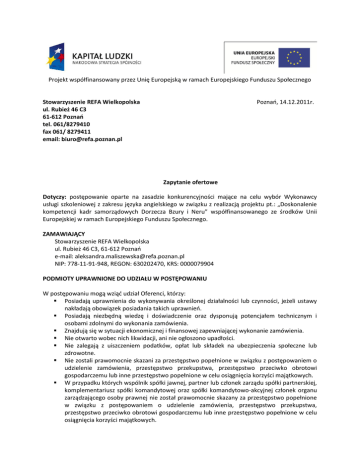 Projekt współfinansowany przez Unię Europejską w ramach Europejskiego Funduszu Społecznego Stowarzyszenie REFA Wielkopolska ul. Rubież 46 C3 61-612 Poznań tel. 061/8279410 fax 061/ 8279411 email: [email protected] Poznao, 14.12.2011r. Zapytanie ofertowe Dotyczy: postępowanie oparte na zasadzie konkurencyjności mające na celu wybór Wykonawcy usługi szkoleniowej z zakresu języka angielskiego w związku z realizacją projektu pt.: „Doskonalenie kompetencji kadr samorządowych Dorzecza Bzury i Neru” współfinansowanego ze środków Unii Europejskiej w ramach Europejskiego Funduszu Społecznego. ZAMAWIAJĄCY Stowarzyszenie REFA Wielkopolska ul. Rubież 46 C3, 61-612 Poznao e-mail: [email protected] NIP: 778-11-91-948, REGON: 630202470, KRS: 0000079904 PODMIOTY UPRAWNIONE DO UDZIAŁU W POSTĘPOWANIU W postępowaniu mogą wziąd udział Oferenci, którzy: Posiadają uprawnienia do wykonywania określonej działalności lub czynności, jeżeli ustawy nakładają obowiązek posiadania takich uprawnieo. Posiadają niezbędną wiedzę i doświadczenie oraz dysponują potencjałem technicznym i osobami zdolnymi do wykonania zamówienia. Znajdują się w sytuacji ekonomicznej i finansowej zapewniającej wykonanie zamówienia. Nie otwarto wobec nich likwidacji, ani nie ogłoszono upadłości. Nie zalegają z uiszczeniem podatków, opłat lub składek na ubezpieczenia społeczne lub zdrowotne. Nie zostali prawomocnie skazani za przestępstwo popełnione w związku z postępowaniem o udzielenie zamówienia, przestępstwo przekupstwa, przestępstwo przeciwko obrotowi gospodarczemu lub inne przestępstwo popełnione w celu osiągnięcia korzyści majątkowych. W przypadku których wspólnik spółki jawnej, partner lub członek zarządu spółki partnerskiej, komplementariusz spółki komandytowej oraz spółki komandytowo-akcyjnej członek organu zarządzającego osoby prawnej nie został prawomocnie skazany za przestępstwo popełnione w związku z postępowaniem o udzielenie zamówienia, przestępstwo przekupstwa, przestępstwo przeciwko obrotowi gospodarczemu lub inne przestępstwo popełnione w celu osiągnięcia korzyści majątkowych. Wobec których, sąd nie orzekł zakazu ubiegania się o zamówienia, na podstawie przepisów o odpowiedzialności podmiotów zbiorowych za czyny zabronione pod groźbą kary. OPIS PRZEDMIOTU ZAMÓWIENIA 1. Przedmiotem zamówienia jest usługa polegająca na przeprowadzeniu szkoleo językowych, w ramach projektu „Doskonalenie kompetencji kadr samorządowych Dorzecza Bzury i Neru”, współfinansowanego ze środków Unii Europejskiej w ramach programu operacyjnego Kapitał Ludzki, Działanie 5.2. Wzmocnienie potencjału administracji samorządowej. 2. Szczegółowy opis przedmiotu zamówienia: a) Szkolenia będą realizowane na 2 poziomach. Poziom ten będzie dopasowany do wiedzy uczestników sprawdzonej za pomocą testów wstępnych. Dla osób w wieku powyżej 45+ tworzone będą odrębne grupy, co pozwoli na dopasowanie tempa zajęd do predyspozycji uczestników. Ogółem przewidzianych jest 160h w tym IV grupy każda po 40h, w grupach ok. 10 uczestników. Czas trwania zajęd ok. 4h. b) Oferent zobowiązany jest zapewnid salę, materiały oraz świadczenia na rzecz uczestników i uczestniczek – konsumpcja, na którą składa się kawa, herbata, ciastka. c) Oferent zobowiązany jest do przeprowadzenia egzaminu koocowego poświadczonego certyfikatem znanym i honorowanym w Unii Europejskiej. 3. Zamawiający nie dopuszcza możliwości składania ofert częściowych. 4. Zamawiający dopuszcza możliwośd powierzenia części zamówienia podwykonawcom. TERMIN WYKONANIA ZAMÓWIENIA Termin wykonania przedmiotu zamówienia: od stycznia 2012 do maja 2012 ZASADY SKŁADANIA OFERT 1. Oferta powinna byd sporządzona w języku polskim na formularzu stanowiącym Załącznik nr 1 do niniejszego zapytania oraz podpisana przez osobę/osoby upoważnione do występowania w imieniu Oferenta. 2. W celu udziału w postępowaniu należy przesład wypełniony Załączniki nr 2. 3. Każdy oferent może złożyd wyłącznie jedną ofertę, w której musi byd zaoferowana tylko jedna ostateczna cena. 4. Zamawiający nie dopuszcza składania ofert wariantowych 5. Ceny w złożonych ofertach muszą obejmowad wszystkie koszty związane z realizacją zamówienia, włączając w to koszty sali szkoleniowej oraz cateringu. SPOSOBY I TERMIN SKŁADANIA OFERT Oferty należy składad do dnia 21 grudnia 2011 roku, do godziny 12:00. Sposoby składania ofert: pocztą elektroniczną na adres [email protected] faksem na numer 061 827-94-11 osobiście w siedzibie Zleceniodawcy – Stowarzyszenie REFA Wielkopolska, ul. Rubież 46 C3, 61-612 Poznao O terminowości złożenia oferty decyduje data wpływu do siedziby Zamawiającego. Osobą upoważnioną do udzielenia ewentualnych wyjaśnieo związanych z przedmiotem zapytania ofertowego jest Aleksandra Maliszewska, tel.61 827-94-12. WSPÓŁNY SŁOWNIK ZAMÓWIEO 80500000-9 – Usługi szkoleniowe 55270000-3 – Usługi świadczone przez placówki oferujące wyżywienie i miejsca noclegowe KRYTERIA OCENY OFERT Zamawiający dokona oceny ważnych ofert na podstawie następujących kryteriów: 1 - Cena 100% INFORMACJE DOTYCZĄCE WYBORU NAJKORZYSTNIEJSZEJ OFERTY O wyborze najkorzystniejszej oferty Zamawiający zawiadomi oferentów drogą mailową UWAGI KOOCOWE 1. Niniejsze zapytanie ofertowe nie zobowiązuje Zamawiającego do żadnego określonego działania. Wydanie niniejszego zapytania ofertowego nie zobowiązuje Zamawiającego do akceptacji oferty, w całości lub części, bez względu na jej zawartośd cenową i nie zobowiązuje do składania wyjaśnieo czy powodów akceptacji lub odrzucenia oferty. 2. Na podstawie złożonej oferty zostanie podpisana umowa na zakup usługi szkoleniowej. 3. Zamawiający zastrzega sobie prawo do unieważnienia niniejszego zapytania ofertowego. 4. Zamawiający nie może byd pociągany do odpowiedzialności za ja