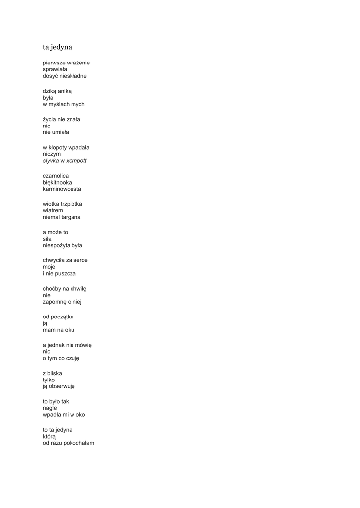 ta jedyna pierwsze wrażenie sprawiała dosyć nieskładne dziką aniką była w myślach mych życia nie znała nic nie umiała w kłopoty wpadała niczym slyvka w xompott czarnolica błękitnooka karminowousta wiotka trzpiotka wiatrem niemal targana a może to siła niespożyta była chwyciła za serce moje i nie puszcza choćby na chwilę nie zapomnę o niej od początku ją mam na oku a jednak nie mówię nic o tym co czuję z bliska tylko ją obserwuję to było tak nagle wpadła mi w oko to ta jedyna którą od razu pokochałam jak mogłabym to powiedzieć dzikiej anice? Kama.