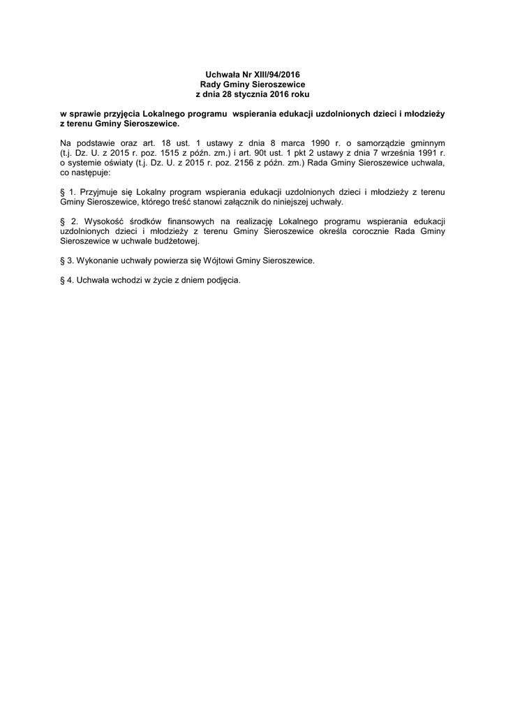 Uchwała Nr XIII/94/2016 Rady Gminy Sieroszewice z dnia 28 stycznia 2016 roku w sprawie przyjęcia Lokalnego programu wspierania edukacji uzdolnionych dzieci i młodzieży z terenu Gminy Sieroszewice. Na podstawie oraz art. 18 ust. 1 ustawy z dnia 8 marca 1990 r. o samorządzie gminnym (t.j. Dz. U. z 2015 r. poz. 1515 z późn. zm.) i art. 90t ust. 1 pkt 2 ustawy z dnia 7 września 1991 r. o systemie oświaty (t.j. Dz. U. z 2015 r. poz. 2156 z późn. zm.) Rada Gminy Sieroszewice uchwala, co następuje: § 1. Przyjmuje się Lokalny program wspierania edukacji uzdolnionych dzieci i młodzieży z terenu Gminy Sieroszewice, którego treść stanowi załącznik do niniejszej uchwały. § 2. Wysokość środków finansowych na realizację Lokalnego programu wspierania edukacji uzdolnionych dzieci i młodzieży z terenu Gminy Sieroszewice określa corocznie Rada Gminy Sieroszewice w uchwale budżetowej. § 3. Wykonanie uchwały powierza się Wójtowi Gminy Sieroszewice. § 4. Uchwała wchodzi w życie z dniem podjęcia. Załącznik do Uchwały Nr XIII/94/2016 Rady Gminy Sieroszewice z dnia 28 stycznia 2016 roku LOKALNY PROGRAM WSPIERANIA EDUKACJI UZDOLNIONYCH DZIECI I MŁODZIEŻY Z TERENU GMINY SIEROSZEWICE 1. WSTĘP Rada Gminy Sieroszewice uznając potrzebę otoczenia szczególną opieką uzdolnionych dzieci i młodzieży, przyjmuje Lokalny program wspierania edukacji uzdolnionych dzieci i młodzieży z terenu Gminy Sieroszewice. Osiągnięcia ludzi zdolnych są motorem rozwoju w każdej dziedzinie życia. Z tego właśnie powodu społeczeństwo dba o zapewnienie utalentowanym dzieciom i młodzieży odpowiednich warunków do rozwijania i kształtowania uzdolnień. Właściwe wspieranie rozwoju uzdolnień uczniów to jedno z najważniejszych zadań edukacyjnych. Założeniem nowoczesnej szkoły jest przede wszystkim stymulowanie rozwoju uczniów i wyposażenie ich w bogaty zasób wiedzy oraz umiejętności. Opracowanie, przyjęcie i realizacja Programu pozwoli kompleksowo planować działania wspierające edukację młodych mieszkańców Gminy Sieroszewice, wykazujących szczególne uzdolnienia. Wychodząc naprzeciw oczekiwaniom społecznym Rada Gminy pragnie motywować uczniów do rozwoju i wzrostu aspiracji m.in. poprzez przyznawanie stypendiów. Grono stypendystów będzie stanowić pozytywny wzorzec dla wszystkich uczniów oraz będzie wzmacniać poczucie własnej wartości w społeczności naszej gminy. Promowanie uczniów zdolnych w obecnym stanie prawnym możliwe jest poprzez przyjęcie lokalnego programu wspierania edukacji uzdolnionych dzieci i młodzieży. 2. CELE PROGRAMU 1) promowanie młodzieży szczególnie uzdolnionej, 2) motywowanie uczniów do podejmowania działań mających na celu odkrycie własnych uzdolnień oraz do ciągłej pracy nad rozwijaniem talentów i pogłębianiem wiedzy, 3) stwarzanie pozytywnych wzorców dla społeczności uczniowskiej lokalnych szkół. 4) motywowanie rodziców do wspierania edukacji uzdolnionych dzieci, 5) zwiększanie liczby uczestników olimpiad i konkursów oraz zawodów sportowych, 6) promocja Gminy Sieroszewice, jako gminy przyjaznej uczniom wybitnie uzdolnionym. 3. SPOSOBY DZIAŁANIA 1) przyznawanie stypendiów uzdolnionym uczniom przez Wójta Gminy Sieroszewice, 2) zwiększanie liczby uczestników olimpiad i konkursów przedmiotowych, 3) szkolenia dla nauczycieli z zakresu pracy ze zdolnym uczniem, 4) wzbogacanie szkolnych bibliotek w specjalistyczne książki i czasopisma, 5) doposażenie istniejących pracowni naukowych. 4. ADRESACI PROGRAMU Uczniowie kl. IV-VI szkół podstawowych, gimnazjów i szkół ponadgimnazjalnych, kształcących młodzież bezpośrednio po ukończeniu gimnazjum, zamieszkujący na terenie Gminy Sieroszewice. 5. FINANSOWANIE PROGRAMU Realizacja Lokalnego programu wspierania edukacji uzdolnionych dzieci i młodzieży z terenu Gminy Sieroszewice odbywać się będzie w oparciu o środki finansowe pochodzące z budżetu Gminy Sieroszewice. 6. SPODZIEWANE EFEKTY 1) wzrost aktywności edukacyjnej dzieci i młodzieży, 2) realizacja możliwości indywidualnego rozwoju ucznia, 3) wzrost zaangażowania w działaniach na rzecz środowiska lokalnego i regionalnego, 4) wzrost liczby laureatów i finalistów konkursów przedmiotowych i innych, 5) promocja Gminy Sieroszewice w powiecie, województwie i kraju, 6) wzrost motywacji uczniów oraz nauczycieli. Uzasadnienie do Uchwały Nr XIII/94/2016 Rady Gminy Sieroszewice z dnia 28 stycznia 2016 roku w sprawie przyjęcia Lokalnego programu wspierania edukacji uzdolnionych dzieci i młodzieży z terenu Gminy Sieroszewice. Zgodnie z art. 90t ust. 1 pkt 2 ustawy z dnia 7 września 1991 r. o systemie oświaty (t.j. Dz. U. z 2015 r. poz. 2156 z późn. zm.) jednostki samorządu terytorialnego mogą tworzyć regionalne lub lokalne programy wspierania edukacji uzdolnionych dzieci i młodzieży. Cytowany przepis nie zawiera normy kompetencyjnej dla organu gminy właściwego do przyjęcia programu, normę taką zawiera zapis art. 18 ust. 1 ustawy z dnia 8 marca 1990 r. o samorządzie gminnym (t.j. Dz. U. z 2015 r. poz. 1515 z późn. zm.), zgodnie z którym do właściwości rady gminy należą wszystkie sprawy pozostające w zakresie działania gminy, o ile ustawy nie stanowią inaczej. Gmina Sieroszewice zamierza wesprzeć pomocą m.in. w formie stypendiów najzdolniejszych uczniów zamieszkałych na jej terenie. Podjęcie uchwały w sprawie zasad udzielania stypendiów za wyniki w nauce powinno być poprzedzone przyjęciem Lokalnego programu wspierania edukacji uzdolnionych dzieci i młodzieży. Dotychczas w Gminie Sieroszewice nie utworzono takiego programu. Przyjęcie lokalnego programu wspierania edukacji uzdolnionych dzieci i młodzieży z terenu Gminy Sieroszewice przyczyni się w szczególności do wzrostu liczby laureatów konkursów, olimpiad i zawodów, a także do wzrostu motywacji uczniów i nauczycieli. Wobec powyższego podjęcie niniejszej uchwały jest w pełni uzas