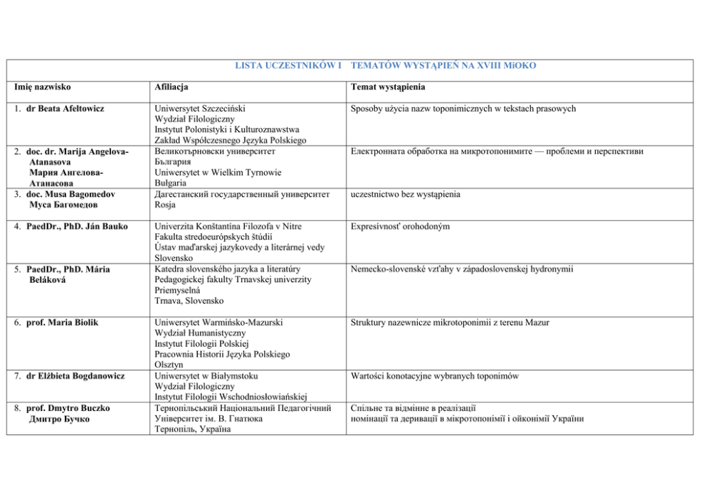 LISTA UCZESTNIKÓW I TEMATÓW WYSTĄPIEŃ NA XVIII MiOKO Imię nazwisko Afiliacja Temat wystąpienia 1. dr Beata Afeltowicz Uniwersytet Szczeciński Wydział Filologiczny Instytut Polonistyki i Kulturoznawstwa Zakład Współczesnego Języka Polskiego Великотърновски университет България Uniwersytet w Wielkim Tyrnowie Bułgaria Дагестанский государственный университет Rosja Sposoby użycia nazw toponimicznych w tekstach prasowych Univerzita Konńtantína Filozofa v Nitre Fakulta stredoeurópskych ńtúdií Ústav maďarskej jazykovedy a literárnej vedy Slovensko Katedra slovenského jazyka a literatúry Pedagogickej fakulty Trnavskej univerzity Priemyselná Trnava, Slovensko Expresívnosť orohodoným Uniwersytet Warmińsko-Mazurski Wydział Humanistyczny Instytut Filologii Polskiej Pracownia Historii Języka Polskiego Olsztyn Uniwersytet w Białymstoku Wydział Filologiczny Instytut Filologii Wschodniosłowiańskiej Тернопільський Національний Педагогічний Університет ім. В. Гнатюка Тернопіль, Україна Struktury nazewnicze mikrotoponimii z terenu Mazur 2. doc. dr. Marija AngelovaAtanasova Мария АнгеловаАтанасова 3. doc. Musa Bagomedov Муса Багомедов 4. PaedDr., PhD. Ján Bauko 5. PaedDr., PhD. Mária Beláková 6. prof. Maria Biolik 7. dr Elżbieta Bogdanowicz 8. prof. Dmytro Buczko Дмитро Бучко Електронната обработка на микротопонимите — проблеми и перспективи uczestnictwo bez wystąpienia Nemecko-slovenské vzťahy v západoslovenskej hydronymii Wartości konotacyjne wybranych toponimów Спільне та відмінне в реалізації номінації та деривації в мікротопонімії і ойконімії України 9. prof. Hanna Buczko Ганна Бучко Тернопільський Національний Педагогічний Університет ім. В. Гнатюка Тернопіль, Україна Реалізація приналежності в українській антропонімії і мікротопонімії 10. Mgr., PhD. Alexandra Chomová Katedra slovenského jazyka a literatury Fakulta humanitných vied UMB Banská Bystrica, Slovensko dr Joanna Ciesielka Uniwersytet Łódzki Katedra Filologii Romańskiej Zakład Italianistyki Z hydronymie povodia Torysy 11. dr Joanna Ciesielka dr Dagmara Milińska 12. prof. Aleksandra Cieślikowa 13. prof. Lidia Citko 14. PhD. Corobcean Doina 15. prof. Marek Cybulski 16. dr Anna Czapla 17. prof. Maria CzaplickaJedlikowska dr Dagmara Milińska Wyższa Szkoła Humanistyczno-Ekonomiczna w Pabianicach Instytut Języka Polskiego PAN Kraków Uniwersytet w Białymstoku Wydział Filologiczny Instytut Filologii Wschodniosłowiańskiej State University of Moldova Faculty of Philology Republica Moldova Uniwersytet Łódzki Wydział Filologiczny Instytut Filologii Polskiej Katedra Historii Języka Polskiego Uniwersytet Lubelski Jana Pawła II Wydział Humanistyczny Instytut Filologii Polskiej Katedra Języka Polskiego Uniwersytet Kazimierza Wielkiego w Bydgoszczy Instytut Pedagogiki La toponymie du monde des sorciers en anglais, français, italien et polonais ou quelques aspects des traductions d'Harry Potter O naszych tegorocznych jubilatach Obraz Podlasia z perspektywy mikrotoponimii The eponyms formed from toponyms uczestnictwo bez wystąpienia Geografia nazw patronimicznych na -ice a granice etniczne Toponimy jako świadectwo przeszłości językowej /na podstawie wybranej grupy mikrotoponimów z podstawowym wykładnikiem ’-e / 18. prof. Barbara CzopekKopciuch 19. Mgr., PhD. Jaroslav David Instytut Języka Polskiego PAN Kraków Katedra českého jazyka Filozofická fakulta Ostravská univerzita v Ostravě Česká republika Uczestnictwo bez wystąpienia 20. dr Anna DąbrowskaKamińska Uniwersytet Kardynała Stefana Wyszyńskiego Wydział Nauk Humanistycznych Instytut Filologii Polskiej Katedra Historii Języka. Uniwersytet Jagielloński Wydział Filologiczny Instytut Filologii Romańskiej Uniwersytet Marii Curie-Skłodowskiej Instytut Filologii Polskiej Lublin Uniwersytet Warmińsko-Mazurski Wydział Humanistyczny Instytut Filologii Polskiej Olsztyn Uniwersytet Kazimierza Wielkiego Instytut Neofilologii i Lingwistyki Stosowanej Bydgoszcz Warianty odmiejscowych struktur przymiotnikowych w polskiej antroponimii 25. Mgr Ņaneta Dvořáková Česká republika 26. доц. Галина Філь Олександрівна ст. преп. Елена КравченкоДзондза Енеевна Педагогически Факультет Дрогобичского государственного педагогического университета имени Ивана Франко Ukraina Vyvaņovací světadíl, Dehydrované moře a Nakřápnuté hory — Vítejte na Zeměplońe Terrego Pratchetta Микротопонимы в художественных произведениях западноукраинских писателей ХIХ – начала ХХ века 27. prof. Sławomir Gala Uniwersytet Łódzki Wydział Filologiczny Instytut Filologii Polskiej 21. mgr Przemysław Dębowiak 22. dr Izabela Domaciuk-Czarny 23. prof. Jerzy Duma 24. mgr Henryk Duszyński „Ņivá‖ toponymie městského prostoru (na příkladu Havířova a Ostravy) Les couleurs dans les noms de lieux habités en Espagne Nazwy miejsc w wybranych utworach literatury niemimetycznej Z zagadnień mikrotoponimii Pomorza Zachodniego Die Straßen- und Platznamen der Gemeinde Nakel an der Netze (Nakło nad Notecią) uczestnictwo bez wystąpienia (otwarcie konferencji) 28. prof. Artur Gałkowski 29. dr Renata Gliwa 30. PhDr. Andrea Goótńová 31. doc. PhDr., PhD. Milàn Harvalík 32. dr Ewa Jakus-Borkowa (von Lochner) 33. doc. PhDr., PhD. Juraj Hla