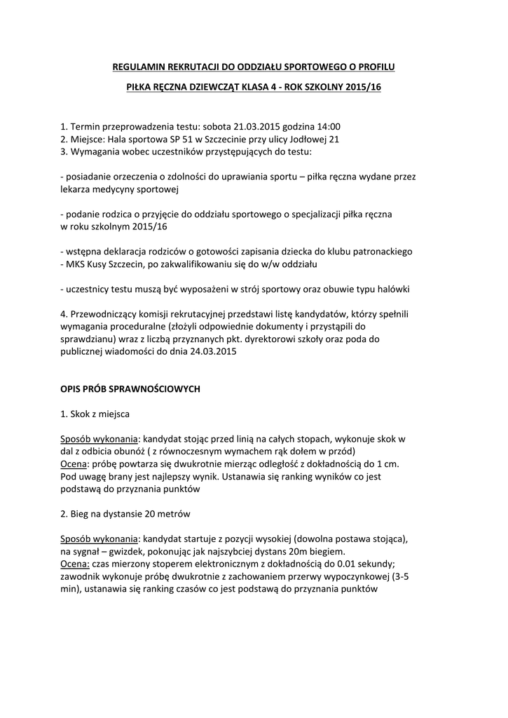 REGULAMIN REKRUTACJI DO ODDZIAŁU SPORTOWEGO O PROFILU PIŁKA RĘCZNA DZIEWCZĄT KLASA 4 - ROK SZKOLNY 2015/16 1. Termin przeprowadzenia testu: sobota 21.03.2015 godzina 14:00 2. Miejsce: Hala sportowa SP 51 w Szczecinie przy ulicy Jodłowej 21 3. Wymagania wobec uczestników przystępujących do testu: - posiadanie orzeczenia o zdolności do uprawiania sportu – piłka ręczna wydane przez lekarza medycyny sportowej - podanie rodzica o przyjęcie do oddziału sportowego o specjalizacji piłka ręczna w roku szkolnym 2015/16 - wstępna deklaracja rodziców o gotowości zapisania dziecka do klubu patronackiego - MKS Kusy Szczecin, po zakwalifikowaniu się do w/w oddziału - uczestnicy testu muszą być wyposażeni w strój sportowy oraz obuwie typu halówki 4. Przewodniczący komisji rekrutacyjnej przedstawi listę kandydatów, którzy spełnili wymagania proceduralne (złożyli odpowiednie dokumenty i przystąpili do sprawdzianu) wraz z liczbą przyznanych pkt. dyrektorowi szkoły oraz poda do publicznej wiadomości do dnia 24.03.2015 OPIS PRÓB SPRAWNOŚCIOWYCH 1. Skok z miejsca Sposób wykonania: kandydat stojąc przed linią na całych stopach, wykonuje skok w dal z odbicia obunóż ( z równoczesnym wymachem rąk dołem w przód) Ocena: próbę powtarza się dwukrotnie mierząc odległość z dokładnością do 1 cm. Pod uwagę brany jest najlepszy wynik. Ustanawia się ranking wyników co jest podstawą do przyznania punktów 2. Bieg na dystansie 20 metrów Sposób wykonania: kandydat startuje z pozycji wysokiej (dowolna postawa stojąca), na sygnał – gwizdek, pokonując jak najszybciej dystans 20m biegiem. Ocena: czas mierzony stoperem elektronicznym z dokładnością do 0.01 sekundy; zawodnik wykonuje próbę dwukrotnie z zachowaniem przerwy wypoczynkowej (3-5 min), ustanawia się ranking czasów co jest podstawą do przyznania punktów 3. Rzut piłką ręczną Sposób wykonania: uczeń stojąc przed linią, trzyma w ręku piłkę, poprzez odwiedzenie ręki do tyłu wykonuje rzut piłką do przodu. Ocena: próbę powtarza się trzykrotnie mierząc odległość z dokładnością do 1 cm. Pod uwagę brany jest najlepszy wynik. Ustanawia się ranking wyników co jest podstawą do przyznania punktów. 4. Bieg slalomem Sposób wykonania: ćwiczący staje na linii startu , na komendę „gotów – start” biegnie pokonując slalomem wszystkie pachołki, na ostatnim zawraca i jak najszybciej wraca na linię startu, która jest również linią mety Ocena: czas mierzony za pomocą stopera elektronicznego z dokładnością do 0,01 sekundy; zawodnik wykonuje próbę dwukrotnie z zachowaniem przerwy wypoczynkowej (3-5 min), a wynik stanowi czas najszybszego z dwóch biegów. Ustanawia się ranking uzyskanych wyników co jest podstawą do przyznania punktów 5. Gra w dwa ognie Sposób wykonania : na wyznaczonym polu gry , zawodnicy współzawodniczą w losowo dobranych dwóch zespołach . Zawodnicy dwoma piłkami z gąbki rzucają w przeciwnika. Punkty naliczane dla zespołu są za zbicie zawodnika, lecz zbity zawodnik nie schodzi z boiska, uczestniczy w grze dalej. Ocena poziomu umiejętności gry : – ocena techniki rzutu, umiejętność wykonywania uniku od piłki, zaangażowanie w grę, każdego zawodnika ocenia co najmniej 2 trenerów PUNKTACJA PRÓB Wszystkie próby punktowane są w skali 1-20 pkt. Najlepszy wynik otrzymuje 20 pkt.