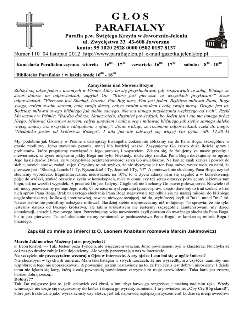 GŁOS PARAFIALNY Parafia p.w. Świętego Krzyża w Jaworznie-Jeleniu ul. Zwycięstwa 33 43-608 Jaworzno konto: 95 1020 2528 0000 0502 0157 8137 Numer 110 04 listopad 2012 http://www.parafiajelen.pl e-mail:[email protected] Kancelaria Parafialna czynna: wtorek: 1600 – 1730 czwartek: 1600 – 1730 sobota: 830 - 1000 Biblioteka Parafialna : w każdą środę 1600 - 1800 Zamyślenia nad Słowem Bożym Zbliżył się także jeden z uczonych w Piśmie, który im się przysłuchiwał, gdy rozprawiali ze sobą. Widząc, że Jezus dobrze im odpowiedział, zapytał Go: "Które jest pierwsze ze wszystkich przykazań?" Jezus odpowiedział: "Pierwsze jest Słuchaj, Izraelu, Pan Bóg nasz, Pan jest jeden. Będziesz miłował Pana, Boga swego, całym swoim sercem, całą swoją duszą, całym swoim umysłem i całą swoją mocą. Drugie jest to: Będziesz miłował swego bliźniego jak siebie samego. Nie ma innego przykazania większego od tych". Rzekł Mu uczony w Piśmie: "Bardzo dobrze, Nauczycielu, słusznieś powiedział, bo Jeden jest i nie ma innego prócz Niego. Miłować Go całym sercem, całym umysłem i całą mocą i miłować bliźniego jak siebie samego daleko więcej znaczy niż wszystkie całopalenia i ofiary". Jezus widząc, że rozumnie odpowiedział, rzekł do niego: "Niedaleko jesteś od królestwa Bożego". I nikt już nie odważył się więcej Go pytać. Mk 12,28-34 My, podobnie jak Uczony w Piśmie z dzisiejszej Ewangelii, codziennie zbliżamy się do Pana Boga, szczególnie w czasie modlitwy. Jemu stawiamy pytania, mniej lub bardziej ważne. Zasypujemy Go często dużą ilością spraw i problemów, które pragniemy rozwiązać z Jego pomocą i wsparciem. Zdarza się, że żałujemy za nasze grzechy i niewierności, za życie miejscami jakby Boga nie było. Niekiedy, może zbyt rzadko, Panu Bogu dziękujemy za ogrom Jego łask i darów. Bywa, że w przypływie bezinteresowności serca Go uwielbiamy. Na koniec znak krzyża i powrót do siebie, swoich spraw, zadań, zajęć. Czynimy to tak szybko, że nie słyszymy jak ten Bóg mówi, wręcz woła za nami, że pierwsze jest: "Słuchaj, Izraelu! I Ty, Ryszardzie! I Ty, Joanno! I Ty, N!" A ponieważ nie słuchamy Pana Boga, czy też słuchamy wybiórczo, fragmentarycznie, nieuważnie, na 10%, to w życiu zdarzy nam się zagubić a w konsekwencji pójść do wróżki, szukać prawdy o życiu w horoskopach, mieć w domu czy też sercu ołtarzyk poświęcony jakiemuś tam bogu, tak na wszelki wypadek. A przecież On jest Jedyny. Ciągle też nie kochamy Go nawet połową serca. Niewiele też sił, mocy poświęcamy pełniąc Jego wolę. Choć nasz umysł zaprząta tysiące spraw, często daremny to trud szukać wśród nich spraw Pana Boga. Brak należytego słuchania Pana Boga negatywnie też odbija się na naszej miłości do bliźniego ciągle ślamazarnej, koślawej, interesownej, zawsze niewystarczającej, od do, wybiórczej czyli ci "tak", tamci "nie" itd. Nawet siebie nie potrafimy należycie miłować. Bardziej siebie rozpieszczamy niż miłujemy. To sprawia, że nie tyko jesteśmy daleko od Bożego królestwa, ale takim królestwem nie jesteśmy szczególnie zainteresowani, my dzieci demokracji, anarchii, życiowego luzu. Potrzebujemy więc nawrócenia czyli powrotu do uważnego słuchania Pana Boga, bo to jest pierwsze. To zaś słuchanie mamy zamieniać w posłuszeństwo Panu Bogu, w konkretną miłość Boga i bliźniego. Zapukał do mnie po śmierci (z O. Leonem Knabitem rozmawia Marcin Jakimowicz) Marcin Jakimowicz: Możemy jutro przyjechać? o. Leon Knabit: — Tak. Jestem poza Tyńcem, ale wieczorem wracam. Jutro powinienem być w klasztorze. No chyba że coś nas po drodze zabije i nie dojedziemy. Ale wtedy przeczytają o nas w internecie... Na szczęście nie przeczytałem wczoraj o Ojcu w internecie. A czy ojciec Leon boi się w ogóle śmierci? Nie chciałbym w tej chwili umierać. Mam taki bałagan w swych rzeczach, że nie wyszedłbym z czyśćca, zanimby moi współbracia tego nie uporządkowali. A poważnie: jestem nastawiony na to, że Pan Jezus jest dobry i miłosierny. I dzięki temu nie lękam się kary, którą z całą pewnością powinienem otrzymać za moje przewinienia. Taka kara jest zresztą bardzo dobrą rzeczą... Dobrą??? Tak. Bo najgorsze jest to, jeśli człowiek coś zbroi, a inni zbyt łatwo go rozgrzeszą i machną nad nim ręką. Wtedy winowajca nie czuje się oczyszczony do końca i dręczą go wyrzuty sumienia. I to powiedzenie: „Oby Cię Bóg skarał!”, które jest traktowane jako wyraz zemsty czy złości, jest tak naprawdę najlepszym życzeniem! Ludzie są niesprawiedliwi i albo przesadzają w karaniu, albo wcale nie karzą, dozwalając na bezkarność. A Pan Bóg będzie oczyszczał nas sprawiedliwie. Czyściec jest karą? Tak. Boimy się tego słowa — „kara”, prawda? Chcemy je zagłaskać. Wołamy „Boziu dobra, Boziu kochana”, a przecież Pismo Święte aż się trzęsie od słowa „kara”. Jest kara. To naturalna konsekwencja grzechu, przekroczenia prawa. Dominikanki ze świętej Anny opowiadały, że w chwili śmierci mniszki — nawet święte, mistyczki — stawały się bezradne jak dzieci. Bały się. Trzeba było je wziąć za ręce i przeprowadzić na drugą stronę... Jako proboszcz widziałem ludzi (nie mistyków, ale zwykłych, często pogubionych, uwikłanych w alkohol), którzy w obliczu śmierci zmieniali się, nabierali ufności, odchodzili spokojnie, bez histerii. Ale pamiętam też inną sytuację: umierał ksiądz, znany, ceniony, poważany i pobożny. W obliczu śmierci zaczął nagle przypominać sobie jakieś dawne grzeszki. I przesłoniły mu one wszystko. Tak przeraził się swej grzeszności, że zaczął panicznie wołać: „Nie ma dla mnie miłosierdzia!”. Pocieszaliśmy go: „To było dawno, przecież twoje życie było bardzo dobre”, ale on trwał w ciemności. Nie wiem, czyja to była sprawka... Może szatana? Taka skondensowana 