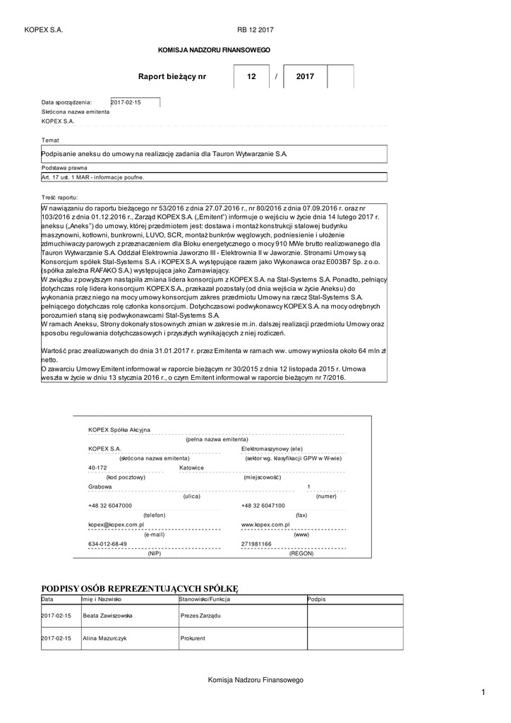 KOPEX S.A. RB 12 2017 KOMISJA NADZORU FINANSOWEGO Raport bieżący nr 12 / 2017 2017-02-15 Data sporządzenia: Skróc ona nazwa emitenta KOPEX S.A. Temat Podpisanie aneksu do umowy na realizację zadania dla Tauron Wytwarzanie S.A. Podstawa prawna Art. 17 ust. 1 MAR - informac je poufne. Treść raportu: W nawiązaniu do raportu bieżącego nr 53/2016 z dnia 27.07.2016 r., nr 80/2016 z dnia 07.09.2016 r. oraz nr 103/2016 z dnia 01.12.2016 r., Zarząd KOPEX S.A. („Emitent”) informuje o wejściu w życie dnia 14 lutego 2017 r. aneksu („Aneks”) do umowy, której przedmiotem jest: dostawa i montaż konstrukcji stalowej budynku maszynowni, kotłowni, bunkrowni, LUVO, SCR, montaż bunkrów węglowych, podniesienie i ułożenie zdmuchiwaczy parowych z przeznaczeniem dla Bloku energetycznego o mocy 910 MWe brutto realizowanego dla Tauron Wytwarzanie S.A. Oddział Elektrownia Jaworzno III - Elektrownia II w Jaworznie. Stronami Umowy są Konsorcjum spółek Stal-Systems S.A. i KOPEX S.A. występujące razem jako Wykonawca oraz E003B7 Sp. z o.o. (spółka zależna RAFAKO S.A.) występująca jako Zamawiający. W związku z powyższym nastąpiła zmiana lidera konsorcjum z KOPEX S.A. na Stal-Systems S.A. Ponadto, pełniący dotychczas rolę lidera konsorcjum KOPEX S.A., przekazał pozostały (od dnia wejścia w życie Aneksu) do wykonania przez niego na mocy umowy konsorcjum zakres przedmiotu Umowy na rzecz Stal-Systems S.A. pełniącego dotychczas rolę członka konsorcjum. Dotychczasowi podwykonawcy KOPEX S.A. na mocy odrębnych porozumień staną się podwykonawcami Stal-Systems S.A. W ramach Aneksu, Strony dokonały stosownych zmian w zakresie m.in. dalszej realizacji przedmiotu Umowy oraz sposobu regulowania dotychczasowych i przyszłych wynikających z niej rozliczeń. Wartość prac zrealizowanych do dnia 31.01.2017 r. przez Emitenta w ramach ww. umowy wyniosła około 64 mln zł netto. O zawarciu Umowy Emitent informował w raporcie bieżącym nr 30/2015 z dnia 12 listopada 2015 r. Umowa weszła w życie w dniu 13 stycznia 2016 r., o czym Emitent informował w raporcie bieżącym nr 7/2016. KOPEX Spółka Akc yjna (pełna nazwa emitenta) KOPEX S.A. Elektromaszynowy (ele) (skróc ona nazwa emitenta) 40-172 (sektor wg. klasyfikac ji GPW w W-wie) Katowice (kod poc ztowy) (miejscowość) Grabowa 1 (ulica) (numer) +48 32 6047000 +48 32 6047100 (telefon) (fax) [email protected] www.kopex.com.pl (e-mail) (www) 271981166 634-012-68-49 (NIP) (REGON) PODPISY OSÓB REPREZENTUJĄCYCH SPÓŁKĘ Data Imię i Nazwisko Stanowisko/Funkc ja 2017-02-15 Beata Zawiszowska Prezes Zarządu 2017-02-15 Alina Mazurc zyk Prokurent Podpis Komisja Nadzoru Finansowego 1