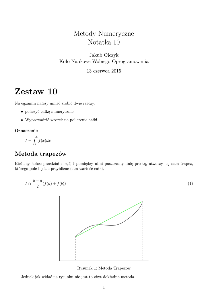 Metody Numeryczne Notatka 10 Jakub Olczyk Koło Naukowe Wolnego Oprogramowania 13 czerwca 2015 Zestaw 10 Na egzamin należy umieć zrobić dwie rzeczy: • policzyć całkę numerycznie • Wyprowadzić wzorek na policzenie całki Oznaczenie I= Z b f (x)dx a Metoda trapezów Bieżemy końce przedziału [a, b] i pomiędzy nimi puszczamy linię prostą, utworzy się nam trapez, którego pole będzie przybliżać nam wartość całki. I≈ b−a (f (a) + f (b)) 2 (1) Rysunek 1: Metoda Trapezów Jednak jak widać na rysunku nie jest to zbyt dokładna metoda. 1 Metoda parabol (Simpsona) Tym razem będziemy się starać przybliżyć całkę za pomocą funkcji kwadratowej. Będziemy brać punkty z końców przedziału [a, b] oraz punkt w jego środku i przez nie interpolować dwumian kwadratowy. Rysunek 2: Metoda Simpsona b−a (f (a) + 4 · f I≈ 6 ! a+b + f (b)) 2 (2) Złożona metoda trapezów Stąd pomysł na złożoną metodę trapezów, gdzie będziemy dzielić przedział [a, b] na n przedziałów, w których będziemy przybliżać metodą trapezów. Rysunek 3: Złożona metoda trapezów b−a I≈ n f (a) f (b) ) + f (x1 ) + f (x2 ) + · · · + f (xn−1 ) + 2 2 ! Jak widać w tym wypadku jest ona już dużo dokładniejsza. 2 (3) Złożona metoda parabol Jest analogiczna do złożonej metody trapezów. Zadanie 4 f (x) = sin x I= Z π f (x)dx analitycznie = 0 [− cos x]π0 = 2 a) metoda trapezów (n=1) I≈0 f (a) = f (b) = 0 b) metoda trapezów (n= 2) π π I ≈ (0 + 1 + 0) = ≈ 1.5708 2 2 f a+b 2 ! =1 c) metoda Simpsona I≈ π 2 (0 + 4 · 1 + 0) = π ≈ 2.0944 6 3 Zadanie 9 Jak sobie radzić z wyprowadzaniem wzorów. Treść: Dla [a, b] = [0, 2] znaleźć takie A, B, C, żeby wzór Z b f (x)dx ≈ A · f (0) + B · f (1) + C · f (2) a był dokładny dla wielomianów możliwie wysokiego stopnia. Jaki jest maksymalny stopień? Rozwiązanie: Trzeba zauważyć, że mamy tu doczynienia z pewną kombinacją liniową (po prawej stronie) oraz że całka sama w sobie jest operatorem liniowym. Następnie udowodnić dla kolejnych wielomianów. p0 (x) = 1 ← wielomian stopnia 0 z liniowości wychodzi, że będzie działać dla dowolnego wielomianu stałego (będzie można wyłączyć stałą). Z (ax + b)dx = a Z x dx + b Z 1 dx 3 Jak to liczyć? Z 2 dx = 2 = A · 1 + B · 1 + C · 1 0 Z 2 xdx = 2 = A · 0 + B · 1 + C · 2 0 1 3 2 8 = =A·0+B·1+C ·4 x 3 0 3 0 I rozwiązujemy układ równań, żeby otrzymać wszystkie parametry. Z 2 x2 dx = 2 1 1 1 2 1 1 1 A = B = 0 1 2 x = 2 =⇒ 0 1 2 x = 2 =⇒ 8 2 0 0 2 C = 0 1 4 3 3 Z 2 0 1 3 4 3 1 3 4 1 2−0 1 (f (0) + 4f (1) + f (2)) f (x)dx ≈ f (0) + f (1) + f (2) = 3 3 3 6 No i dostaliśmy wzór Simpsona. Sprawdźmy dokładność wzoru dla wyższych stopni. Z 2 x3 dx ≈ 0 1 4 2 x =4=L 4 0 4 1 12 1 · 0 + · 1 + · 23 = 4 3 3 3 3 L=P P = Działa dla wielomianów stopnia 3! Z 2 x4 dx = 0 P = 1 5 2 32 x = =L 5 0 5 1 4 1 20 · 0 + · 1 + · 24 = 3 3 3 3 P 6= L Nie zachodzi już dla wielomianów stopnia 4 i też dla wyższych. (Musiałoby zachodzić dla wielomianów niżej żeby mogło zachodzić dla wyższych) 4