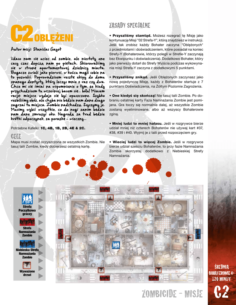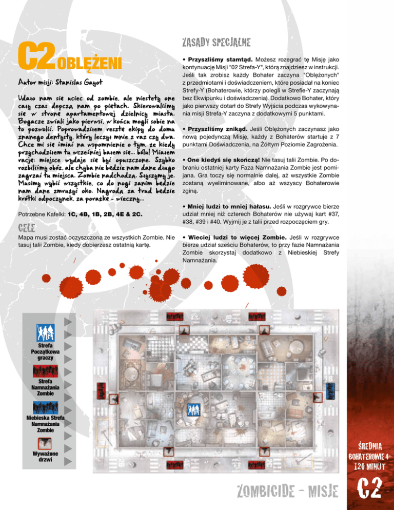 C2 oblężeni zasady specjalne Autor misji: Stanislas Gayot Udało nam się uciec od zombie, ale niestety one cały czas depczą nam po piętach. Skierowaliśmy się w stronę apartamentowej dzielnicy miasta. Bogacze zwiali jako pierwsi, w końcu mogli sobie na to pozwolić. Poprowadziłem resztę ekipy do domu znanego dentysty, który leczył mnie z raz czy dwa. Chce mi się śmiać na wspomnienie o tym, że kiedy przychodziłem tu wcześniej bałem się... bólu! Miałem rację: miejsce wydaje się być opuszczone. Szybko rozbiliśmy obóz, ale chyba nie będzie nam dane długo zagrzać tu miejsca. Zombie nadchodzą. Słyszymy je. Musimy wybić wszystkie, co do nogi zanim będzie nam dane zmrużyć oko. Nagrodą za trud będzie krótki odpoczynek, za porażkę - wieczny... G Potrzebne Kafelki: 1C, 4B, 1B, 2B, 4E & 2C. • One kiedyś się skończą! Nie tasuj talii Zombie. Po dobraniu ostatniej karty Faza Namnażania Zombie jest pomijana. Gra toczy się normalnie dalej, aż wszystkie Zombie zostaną wyeliminowane, albo aż wszyscy Bohaterowie zginą. • Mniej ludzi to mniej hałasu. Jeśli w rozgrywce bierze udział mniej niż czterech Bohaterów nie używaj kart #37, #38, #39 i #40. Wyjmij je z talii przed rozpoczęciem gry. • Wieciej ludzi to więcej Zombie. Jeśli w rozgrywce bierze udział sześciu Bohaterów, to przy fazie Namnażania Zombie skorzystaj dodatkowo z Niebieskiej Strefy Namnażania. G Mapa musi zostać oczyszczona ze wszystkich Zombie. Nie tasuj talii Zombie, kiedy dobierzesz ostatnią kartę. Strefa Początkowa graczy • Przyszliśmy znikąd. Jeśli Oblężonych zaczynasz jako nową pojedynczą Misję, każdy z Bohaterów startuje z 7 punktami Doświadczenia, na Żółtym Poziomie Zagrożenia. À CELE • Przyszliśmy stamtąd. Możesz rozegrać tę Misję jako kontynuację Misji "02 Strefa-Y", którą znajdziesz w instrukcji. Jeśli tak zrobisz każdy Bohater zaczyna "Oblężonych" z przedmiotami i doświadczeniem, które posiadał na koniec Strefy-Y (Bohaterowie, którzy polegli w Strefie-Y zaczynają bez Ekwipunku i doświadczenia). Dodatkowo Bohater, który jako pierwszy dotarł do Strefy Wyjścia podczas wykowynania misji Strefa-Y zaczyna z dodatkowymi 5 punktami. Strefa Namnażania Zombie Niebieska Strefa Namnażania Zombie ŚREDNIA Wyważone drzwi BOHATEROWIE 4+ 120 MINUT Zombicide - MISJE C2