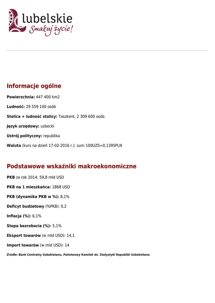 Informacje ogólne Powierzchnia: 447 400 km2 Ludność: 29 559 100 osób Stolica + ludność stolicy: Taszkent, 2 309 600 osób Język urzędowy: uzbecki Ustrój polityczny: republika Waluta (kurs na dzień 17-02-2016 r.): sum 100UZS=0,1395PLN Podstawowe wskaźniki makroekonomiczne PKB za rok 2014: 59,8 mld USD PKB na 1 mieszkańca: 1868 USD PKB (dynamika PKB w %): 8,1% Deficyt budżetowy (%PKB): 0,2 Inflacja (%): 6,1% Stopa bezrobocia (%): 5,1% Eksport towarów (w mld USD): 14,1 Import towarów (w mld USD): 14 Źródło: Bank Centralny Uzbekistanu, Państwowy Komitet ds. Statystyki Republiki Uzbekistanu Najważniejsze informacje gospodarcze Głównymi towarami eksportowymi Uzbekistanu w 2014 r. były przede wszystkim: nośniki energii i produkty ropopochodne (26%), usługi (21,5%), artykuły spożywcze (11,9%), włókno bawełniane (7,4%), metale żelazne i kolorowe (6,9%), produkty chemiczne i wyroby z nich (4,6%) oraz maszyny i urządzenia (3,9%). Zasadnicze grupy towarowe w imporcie to: maszyny i urządzenia (39,6%), wyroby przemysłu chemicznego (16%), artykuły rolno-spożywcze (10,8), metale żelazne i kolorowe (8%), nośniki energii i produkty ropopochodne (6,2%). Największymi partnerami handlowymi Uzbekistanu były: Rosja (22%), Chiny (17%), Kazachstan (12,6%), Korea (7,2%), Turcja (5,4%)… Polska (0,5%). Począwszy od uzyskania niepodległości w 1991 r. w Republice Uzbekistanu wprowadzane były reformy strukturalne. W 2001 r., m.in. dzięki zaangażowaniu się Uzbekistanu w walkę ze światowym terroryzmem, kraj ten uzyskał znaczną międzynarodową pomoc rozwojową i kredytową – co w połączeniu z pomocą ekspercką MFW pozwoliło na ożywienie gospodarki uzbekistańskiej. Ponadto, począwszy od II połowy 2003 r. rząd Uzbekistanu zaczął realizować reformy ekonomiczne mające na celu liberalizację zasad prowadzenia działalności gospodarczej i prywatyzację gospodarki uzbekistańskiej. Dokonuje zmian w ustawodawstwie mających na celu stymulację działalności gospodarczej w kierunku przyciągania zagranicznych inwestycji i kredytów, poprawy klimatu inwestycyjnego i otoczenia biznesu, pozyskiwania grantów oraz zwiększanie rodzimego eksportu. W rezultacie w ostatnich latach Uzbekistan odnotowuje szybki wzrost gospodarczy. W rankingu „Doing Business 2015 r.” Banku Światowego Uzbekistan usytuował się na 141 pozycji na 180 sklasyfikowanych państw (w 2014 r. był na pozycji 146). Natomiast w rankingu swobody gospodarczej „Heritage Foundation 2015” miejsce 160 na 177 krajów. Uwzględniając posiadane przez ten kraj bogactwa naturalne (złoża ropy, gazu, złota), potencjał ludnościowy oraz znaczenie tego kraju w niektórych obszarach gospodarki światowej (bawełna, surowce mineralne) i usytuowanie na tzw. Jedwabnym Szlaku, należy zakładać, iż gospodarka Uzbekistanu nadal będzie się intensywnie rozwijać. Dynamika tych zmian oraz związany z tym rozwój polsko-uzbekistańskiej współpracy gospodarczej zależeć będzie w dalszym ciągu od kontynuacji reform w Uzbekistanie, w tym doprowadzenie do płynnej konwertacji przez miejscowe banki waluty krajowej na waluty wymienialne przy realizacji transakcji importowych. Wymiana handlowa z Polską (w mln USD) 2010 2011 2012 2013 2014 dynamika 2014/13 2015 I-VI*) dynamika 2015/14 Obroty 129,0 158,5 151,5 173,7 167,3 96,3 68,2 77,4 Eksport 75,3 114,3 119,7 147,9 136,3 92,2 54,6 74,6 Import 53,6 44,2 31,9 25,8 31 120,1 13,6 90,9 Saldo 21,7 70,1 87,8 122,1 105,3 - 41,0 - Źródło: GUS *) dane szacunkowe Uzbekistan jest ważnym partnerem handlowym Polski w Azji Centralnej. Struktura wymiany handlowej z Uzbekistanem ulega znacznym zmianom. W eksporcie do Uzbekistanu najważniejszą pozycję w ostatnich dwóch latach stanowią artykuły rolno-spożywcze (41 – 32% udziału), wyroby przemysłu elektromaszynowego (28 30%), wyroby przemysłu chemicznego (20 - 25%) ogółu eksportu. Tradycyjnymi towarami importowanymi z Uzbekistanu są materiały i wyroby włókiennicze (34 – 37% udziału). Znaczącą rolę w imporcie z Uzbekistanu odgrywają surowce energetyczne (ok. 29% w 2014 r.), przy czym okresowo, dostawy do Polski tych produktów rejestrowane są z innych rynków przez rosyjskie firmy pośredniczące. Kolejną pozycję w polskich zakupach stanowią produkty przemysłu chemicznego i przemysłów pokrewnych (ok. 20 – 25%). W 2014 r. Uzbekistan był 68 partnerem w eksporcie z Polski i 99 w zakresie importu (na 250 krajów, z którymi Polska prowadziła wymianę handlową). Eksport realizowało 513 firm zarejestrowanych w Polsce, a import 99. Wraz z przystąpieniem do UE Polska objęta została mechanizmami wspólnej polityki handlowej UE wobec krajów trzecich, w tym Uzbekistanu. Współpraca inwestycyjno-kapitałowa Działalność inwestycyjna firm polskich w Uzbekistanie nie jest znacząca. W kraju tym zarejestrowane są 24 firmy z udziałem kapitału polskiego i 3 przedstawicielstwa, które funkcjonują w branżach: budowlanej, hodowlanej, maszyn i urządzeń, aparatury medycznej i farmacji. Dodatkowo, na rynku działa 15 uzbekistańskich firm partnerskich, będących oficjalnymi przedstawicielami polskich podmiotów gospodarczych. Mimo dotychczas stosunkowo niskiego poziomu zainteresowania firm polskich inwestowaniem w Uzbekistanie ocenia się, iż ze względu na duży potencjał rynkowy, kraj ten może w przyszłości stać się znacznym odbiorcą bezpośrednich inwestycji zagranicznych. Za najbardziej perspektywiczne branże w polskim eksporcie uznać należy: dostawy mięsa i bydła rogatego, sadzonek drzew owocowych, linii do przetwórstwa rolno-spożywczego oraz wybranych rodzajów maszyn i urządzeń. Uwzględniając priorytety polityki gospodarczej wynikające z Programu Inwestycyjnego Uzbekistanu na 2015 r. i Programu Rozwoju Produkcji Przemysłowej na lata 2015 – 2019 możliwy jest udział polskich firm w realizacji projektów sektora paliwowo-energetycznego (na jego rozwój planuje si