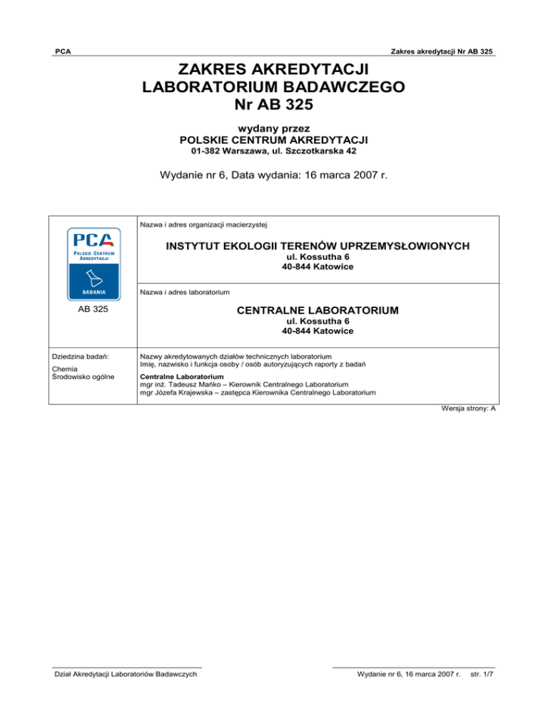 PCA Zakres akredytacji Nr AB 325 ZAKRES AKREDYTACJI LABORATORIUM BADAWCZEGO Nr AB 325 wydany przez POLSKIE CENTRUM AKREDYTACJI 01-382 Warszawa, ul. Szczotkarska 42 Wydanie nr 6, Data wydania: 16 marca 2007 r. Nazwa i adres organizacji macierzystej INSTYTUT EKOLOGII TERENÓW UPRZEMYSŁOWIONYCH ul. Kossutha 6 40-844 Katowice Nazwa i adres laboratorium AB 325 AB 325 CENTRALNE LABORATORIUM ul. Kossutha 6 40-844 Katowice Dziedzina badań: Chemia Środowisko ogólne Nazwy akredytowanych działów technicznych laboratorium Imię, nazwisko i funkcja osoby / osób autoryzujących raporty z badań Centralne Laboratorium mgr inż. Tadeusz Mańko – Kierownik Centralnego Laboratorium mgr Józefa Krajewska – zastępca Kierownika Centralnego Laboratorium Wersja strony: A Dział Akredytacji Laboratoriów Badawczych Wydanie nr 6, 16 marca 2007 r. str. 1/7 PCA Zakres akredytacji Nr AB 325 Centralne Laboratorium mgr inż. Tadeusz Mańko mgr Józefa Krajewska Badane obiekty / Grupa obiektów Woda, ścieki, Wyciąg wodny z odpadów Opady atmosferyczne, woda Woda, ścieki, Wyciąg wodny z odpadów Badane cechy i metody badawcze Oznaczanie pH metodą elektrometryczną 1 - 14 Oznaczanie przewodności elektrycznej właściwej Oznaczanie zasadowości metodą miareczkowania wobec wskaźników 0,1 mmol/l - 250 mmol/l Oznaczanie zasadowości niższej niż 0,4 mmol/l metodą miareczkowania potencjometrycznego 0,002 mmol/l - 0,4 mmol/l Oznaczanie suchej pozostałości, pozostałości po prażeniu, straty przy prażeniu oraz substancji rozpuszczonych, substancji rozpuszczonych mineralnych i substancji rozpuszczonych lotnych > 1 mg/l Oznaczanie twardości: Oznaczanie sumarycznej zawartości wapnia i magnezu metodą miareczkową z EDTA 0,05 mmol/l - 50 mmol/l Oznaczanie chemicznego zapotrzebowania tlenu (ChZT) metodą spektrometryczną 2,4 mg O2/l - 1500 mg O2/l Oznaczanie chlorków metodą miareczkowania azotanem srebra w obecności chromianu jako wskaźnika (Metoda Mohra) 5 mg/l - 400 mg/l Oznaczanie siarczanów (VI) metodą grawimetryczną z chlorkiem baru 10 mg/l - 5000 mg/l Oznaczanie ortofosforanów metodą spektrometryczną z molibdenianem amonowym 0,02 mg P-PO4/l - 64 mg P-PO4/l Oznaczanie azotu azotanowego metodą kolorymetryczną po redukcji w kolumnie kadmowej 0,05 mg/l - 100 mg/l Oznaczanie azotynów metodą absorpcyjnej spektrometrii cząsteczkowej 0,008 mg N-NO2/l - 2,5 mg N-NO2/l Normy i/lub udokumentowane procedury badawcze PN-90/C-04540/01 PN-EN 27888:1999 PN-90/C-04540/03 Procedura badawcza PB-04:2005 w oparciu o PN-90/C-04540/02 i Alkalinity, 2320 B, Titration Method, APHA, AWWA, WEF, 1992 PB-14:2006 w oparciu o PN-78/C-04541 PN-ISO 6059:1999 PB-13:2005 w oparciu o COD 5220D Closed Reflux, Colorimetric Method, APHA, AWWA, WEF, 1992 PN-ISO 9297:1994 PN-ISO 9280:2002 PN-EN ISO 6878:2006 PB-15:2006 w oparciu o PN-87/C-04576/07 PN-EN 26777:1999 Wersja strony: A Dział Akredytacji Laboratoriów Badawczych Wydanie nr 6, 16 marca 2007 r. str. 2/7 PCA Badane obiekty / Grupa obiektów Woda, ścieki Woda, ścieki, Wyciąg wodny z odpadów Zakres akredytacji Nr AB 325 Badane cechy i metody badawcze Oznaczanie azotu amonowego manualną metodą spektrometryczną 0,0014 mg N-NH4/l - 50 mg N-NH4/l Oznaczanie metali metodą absorpcyjnej spektrometrii atomowej (AAS): wapnia 0,238 mg/l - 5000 mg/l magnezu 0,079 mg/l - 1000 mg/l sodu 0,031 mg/l - 15000 mg/l potasu 0,023 mg/l - 2000 mg/l żelaza 0,083 mg/l - 2000 mg/l manganu 0,044 mg/l - 100 mg/l cynku 0,058 mg/l - 100 mg/l kadmu 0,009 mg/l - 100 mg/l ołowiu 0,070 mg/l - 100 mg/l chromu 0,094 mg/l - 100 mg/l miedzi 0,005 mg/l - 100 mg/l niklu 0,066 mg/l - 100 mg/l Oznaczanie metali metodą atomowej spektrometrii emisyjnej z plazmą wzbudzoną indukcyjnie (ICP): wapnia 0,034 mg/l - 100 mg/l magnezu 0,018 mg/l - 100 mg/l sodu 0,070 mg/l - 100 mg/l żelaza 0,112 mg/l - 100 mg/l manganu 0,124 mg/l - 100 mg/l cynku 0,0062 mg/l - 100 mg/l kadmu 0,0005 mg/l - 100 mg/l ołowiu 0,0042 mg/l - 100 mg/l chromu 0,0011 mg/l - 100 mg/l miedzi 0,0097 mg/l - 100 mg/l niklu 0,0005 mg/l - 100 mg/l kobaltu 0,0013 mg/l - 100 mg/l baru 0,024 mg/l - 100 mg/l boru 0,068 mg/l - 100 mg/l strontu 0,061 mg/l - 100 mg/l Oznaczanie rtęci metodą absorpcyjnej spektrometrii atomowej (AAS) techniką zimnych par 0,445 µg/l - 500 µg/l Oznaczanie arsenu metodą absorpcyjnej spektrometrii atomowej (AAS) techniką wytwarzania wodorków 0,469 µg/l - 500 µg/l Normy i/lub udokumentowane procedury badawcze PN-ISO 7150-1:2002 Procedura badawcza: PB-05/1:2002 w oparciu o: PN-EN 1233:2000, PN-EN ISO 7980:2002, PN-ISO 8288:2002 Procedura badawcza PB-05/2:2002 w oparciu o: PN-EN ISO 11885:2001 i EPA Method 6010 B Procedura badawcza: PB-05/3:2002 w oparciu o PN-EN 1483:2000 Procedura badawcza: PB-05/4:2002 w oparciu o PN-EN ISO 11969:1999 Wersja strony: A Dział Akredytacji Laboratoriów Badawczych Wydanie nr 6, 16 marca 2007 r. str. 3/7 PCA Badane obiekty / Grupa obiektów Woda, ścieki, Wyciąg wodny z odpadów Zakres akredytacji Nr AB 325 Badane cechy i metody badawcze Oznaczanie lotnych związków organicznych (LZO) metodą chromatografii gazowej techniką mikroekstrakcji na fazie stałej (SPME): Benzen 0,106 µg/l - 250 µg/l Toluen 0,036 µg/l - 225 µg/l Etylobenzen 0,013 µg/l - 125 µg/l m-ksylen + p-ksylen (suma) 0,040 µg/l - 200 µg/l o-ksylen 0,015 µg/l - 125 µg/l chloroform 0,228 µg/l - 250 µg/l bromodichlorometan 0,357 µg/l - 175 µg/l dibromochlorometan 0,183 µg/l - 250 µg/l bromoform1,66 µg/l - 225 µg/l 1,1-dichloroetylen 0,180 µg/l - 100 µg/l trans-1,2-dichloroetylen 7,33 µg/l - 250 µg/l 1,1-dichloroetan 6,87 µg/l - 225 µg/l cis-1,2-dichloroetylen 0,603 µg/l - 250 µg/l 1,1,1-trichloroetan 0,046 µg/l - 225 µg/l 1,2-dichloroetan 0,137 µg/l - 250 µg/l tetrachlorek węgla 0,621 µg/l - 225 µg/l trichloroetylen 0,372 µg/l - 225 µg/l 1,1,2-trichloroetan 0,289 µg/l - 200 µg/l tetrachloroetylen 0,009 µg/l - 225 µg/l chlorobenzen 0,012 µg/l - 225 µg/l 1,1,1,2-tetrachlor