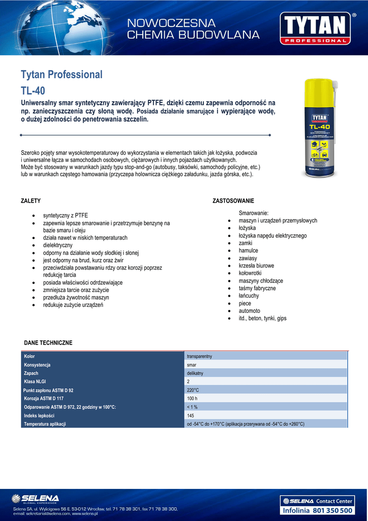 Tytan Professional TL-40 Uniwersalny smar syntetyczny zawierający PTFE, dzięki czemu zapewnia odporność na np. zanieczyszczenia czy słoną wodę. Posiada działanie smarujące i wypierające wodę, o dużej zdolności do penetrowania szczelin. Szeroko pojęty smar wysokotemperaturowy do wykorzystania w elementach takich jak łożyska, podwozia i uniwersalne łącza w samochodach osobowych, ciężarowych i innych pojazdach użytkowanych. Może być stosowany w warunkach jazdy typu stop-and-go (autobusy, taksówki, samochody policyjne, etc.) lub w warunkach częstego hamowania (przyczepa holownicza ciężkiego załadunku, jazda górska, etc.). ZALETY ZASTOSOWANIE syntetyczny z PTFE zapewnia lepsze smarowanie i przetrzymuje benzynę na bazie smaru i oleju działa nawet w niskich temperaturach dielektryczny odporny na działanie wody słodkiej i słonej jest odporny na brud, kurz oraz żwir przeciwdziała powstawaniu rdzy oraz korozji poprzez redukcję tarcia posiada właściwości odrdzewiające zmniejsza tarcie oraz zużycie przedłuża żywotność maszyn redukuje zużycie urządzeń Smarowanie: maszyn i urządzeń przemysłowych łożyska łożyska napędu elektrycznego zamki hamulce zawiasy krzesła biurowe kołowrotki maszyny chłodzące taśmy fabryczne łańcuchy piece automoto itd., beton, tynki, gips DANE TECHNICZNE Kolor transparentny Konsystencja smar Zapach delikatny Klasa NLGI 2 Punkt zapłonu ASTM D 92 220°C Korozja ASTM D 117 100 h Odparowanie ASTM D 972, 22 godziny w 100°C: <1% Indeks lepkości 145 Temperatura aplikacji od -54°C do +170°C (aplikacja przerywana od -54°C do +260°C) SPOSÓB UŻYCIA OGRANICZENIA STOSOWANIA Przygotowanie podłoża Wyczyścić powierzchnię usuwając resztki brudu, tłuszczu i pozostałości po wcześniej używanych smarach. Nie używać: w warunkach bardzo wysokiego ciśnienia w atmosferze o wysokiej stężeniu chloru w czystym tlenie Aplikacja Przed użyciem produktu należy energicznie wstrząsnąć, rozpylać równomiernie po powierzchni. Upewnić się, że powierzchnia, jest sucha i rozpylać TL-40 aż do utrzymania cienkiej warstwy na powierzchni. Następnie przetrzeć miękką szmatką. Płukanie powierzchni nie jest konieczne po użyciu. PRZECHOWYWANIE I OPAKOWANIE Przechowywać w zamkniętym opakowaniu w suchym miejscu. Temperatura przechowywania od +5°C do +25°C. Nieotwierany produkt ma ważność 60 miesięcy. Produkt już użyty można przechowywać 6 miesięcy. Dostępne kolory: transparentny Dostępna pojemność Opakowanie jednostkowe Ilość sztuk w kartonie Indeks kod EAN 200ml puszka 12 10029190 MUT-TL-40-020 5902120030194 Ostrzeżenia i zalecenia BHP Należy przestrzegać zwykłych zasad higieny pracy. Unikać kontaktu z oczami i skórą. Stosować w miejscach z dobrą wentylacją. Chronić przed dziećmi. PRZED ZASTOSOWANIEM NALEŻY ZAPOZNAĆ SIĘ Z KARTĄ BEZPIECZEOSTWA PRODUKTU LUB PRZECZYTAĆ ETYKIETĘ NA OPAKOWANIU. Data sporządzenia 16.02.2017 Powyższe dane, zalecenia i wskazówki opierają się na naszej najlepszej wiedzy, badaniach oraz doświadczeniach i zostały udzielone w dobrej wierze, zgodnie z zasadami obowiązującymi w naszej firmie i u naszych dostawców. Zaproponowane sposoby postępowania uznane są za powszechne, jednak każdy z użytkowników tego materiału powinien upewnić się na wszelkie możliwe sposoby, włącznie ze sprawdzeniem produktu końcowego w odpowiednich warunkach o przydatności dostarczanych materiałów dla osiągnięcia celów przez niego zamierzonych. Ani Spółka, ani jej upoważnieni przedstawiciele nie mogą ponosić odpowiedzialności za jakiekolwiek straty poniesione na skutek nieprawidłowego, bądź błędnego użycia jej materiałów.