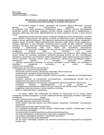 Maria Jóźwik nauczycielka biologii Publiczne Gimnazjum nr 1 w Radomiu Merytoryczne i metodyczne sposoby realizacji wybranych treści z wychowania prozdrowotnego na III etapie edukacyjnym. W nauczaniu biologii w klasie I gimnazjum wg programu Barbary Klimuszko uczniowie poznają zasady funkcjonowania organizmu człowieka. W programie dużo uwagi poświęcono problematyce higieny i ochrony zdrowia. Wprowadzenie elementów szeroko rozumianego programu promocji zdrowia związane jest z kształtowaniem u młodzieży właściwego stylu życia, odpowiedzialności za własny organizm i zdrowie, a także zdrowie innych. Zagadnienia prozdrowotne poruszane na lekcjach biologii (lub innych przedmiotów) są bardzo ważne również z innego powodu. Nie wszyscy uczniowie po zakończeniu nauki w gimnazjum podejmą naukę w liceach ogólnokształcących. Dla większości absolwentów gimnazjów wiedza, umiejętności i postawy nabyte na trzecim etapie kształcenia będą stanowiły często jedyne źródło wiadomości o własnym organizmie w życiu dorosłym. Uczniowie powinni poznać nie tylko anatomię i fizjologię człowieka, ale także zrozumieć funkcjonowanie własnego organizmu oraz znaczenie prowadzenia zdrowego i higienicznego trybu życia. Ważne jest zrozumienie zachodzących w organizmie zmian fizycznych, fizjologicznych oraz psychicznych związanych z dojrzewaniem oraz umiejętność radzenia sobie ze skutkami tych zmian. W szczególny sposób należy uświadomić uczniom szkodliwość oraz społeczne skutki nałogów oraz zwrócić uwagę na znaczenie prawidłowo udzielonej pierwszej pomocy np. przy zwichnięciach, złamaniach, oparzeniach czy krwotokach. Należy też podkreślić wpływ zanieczyszczeń środowiska na zdrowie człowieka. Uczniowie powinni nabyć przekonania o konieczności zapobiegania wadom i schorzeniom układów i narządów organizmu człowieka i o większej skuteczności profilaktyki niż leczenia powstałych chorób. Należy też wykształcić u młodzieży umiejętność korzystania ze służby zdrowia i różnych form poradnictwa. Podstawowe cele wychowania zdrowotnego to: - kształtowanie zachowań prozdrowotnych - ukazywanie uczniom wartości zdrowia jako potencjału, którym dysponują - przekazywanie i utrwalanie zasad zdrowego stylu życia - informowanie o różnych rodzajach zagrożeń zdrowia człowieka i możliwości ich minimalizowania lub eliminowania - rozwijanie zdolności do samokontroli, samoobserwacji i samopielęgnacji zdrowia oraz do wspierania innych ludzi w tych zachowaniach - kształtowanie umiejętności różnorodnego rozwiązywania własnych problemów zdrowotnych - wyrobienie postawy odpowiedzialności za swoje zdrowie wraz z umiejętnością przewidywania skutków własnych zachowań dla zdrowia swego i innych ludzi - pogłębianie znajomości budowy i funkcji organizmu ludzkiego - pomoc w organizacji nauki i wypoczynku Te bardzo ogólne cele (odnoszące się bardziej do nauczyciela niż do ucznia) można przedstawić bardziej szczegółowo w formie zoperacjonizowanej obrazującej konkretne wiadomości i umiejętności nabyte przez ucznia. W wyniku realizacji treści prozdrowotnych uczeń: - dostrzega znaczenie wypoczynku czynnego - potrafi udzielić pierwszej pomocy przy zwichnięciach, złamaniach, krwotokach, odmrożeniach, oparzeniach - potrafi dokonać pomiaru tętna i ciśnienia krwi - zna najczęściej występujące choroby układów: oddechowego, krążenia, wydalniczego i innych oraz czynniki je wywołujące - ma świadomość znaczenia prawidłowo udzielonej pierwszej pomocy - zna drogi oddziaływania zanieczyszczeń środowiska na organizm człowieka - zna sposoby zapobiegania chorobom i zakażeniom pasożytami - wie jak chronić żywność przed skażeniami - wie jak można zapobiegać zarażeniu się chorobami przenoszonymi drogą płciową (szczególnie wirusem HIV) -1- - wymienia zagrożenia zdrowia wyjaśnia dlaczego alkoholizm i narkomania to choroby społeczne wymienia negatywne skutki nikotynizmu, alkoholizmu i narkomanii omawia przyczyny i objawy uzależnień jest przekonany o konieczności przestrzegania zasad higieny określa pojęcia zdrowia i choroby wykazuje wpływ zanieczyszczeń środowiska na fizyczne i psychiczne zdrowie człowieka wykazuje zależność między dolegliwościami układu krążenia i pokarmowego a stylem życia - jest przekonany o konieczności osiągnięcia dojrzałości pełnej jako warunku założenia własnej rodziny - jest przekonany o szkodliwości używek, tytoniu i alkoholu - jest przekonany o wartości honorowego krwiodawstwa - jest przekonany o znaczeniu profilaktyki (lepiej zapobiegać niż leczyć) Realizacja treści z wychowania zdrowotnego może odbywać się w trojaki sposób: na lekcjach biologii poświęconych anatomii, fizjologii i higienie człowieka (kl. I wg. Programu B. Klimuszki), na godzinach wychowawczych oraz na lekcjach innych przedmiotów (ścieżki edukacyjne). Zagadnienia dotyczące zdrowia przewijają się przy omawianiu kolejnych układów narządów w organizmie człowieka. Przy omawianiu układu narządów ruchu realizowane są dwa tematy dotyczące schorzeń tego układu. Pierwszy to „Wady i zniekształcenia w układzie ruchu”, kolejny to „Pierwsza pomoc w urazach układu ruchu”. Uczniowie poznają wady postawy nabyte i wrodzone, potrafią wymienić przyczyny powstawania wad nabytych (z winy otoczenia, z własnej winy, w wyniku choroby), wyjaśniają wpływ krzywicy na powstawanie skrzywień kręgosłupa. Wymieniają przyczyny płaskostopia i sposoby zapobiegania mu. Metody stosowane na tej lekcji to: analiza tekstu w podręczniku, pogadanka, wzajemna obserwacja sylwetek uczniów w czasie siedzenia, stania, pisania, czytania, analiza konturu własnej stopy uczniów. Uczniowie poznają też ćwiczenia zapobiegające powstawaniu u siebie płaskostopia np. podnoszenie codziennie przez 10 minut palcami nóg chusteczki do nosa oraz ćwiczenia wzmacniające 