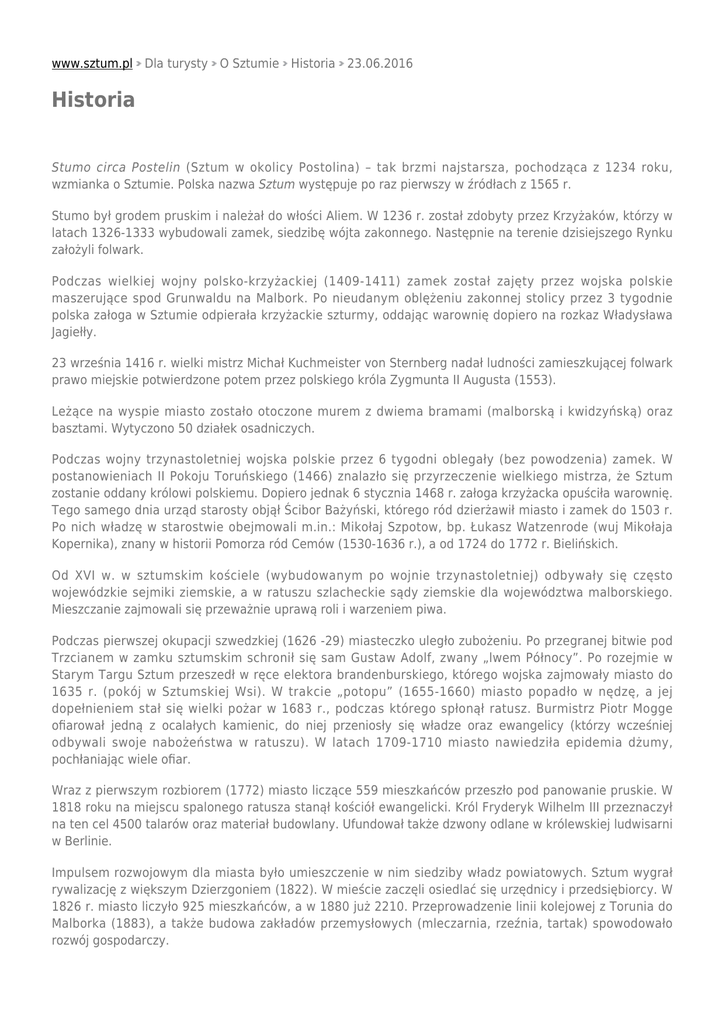 www.sztum.pl Dla turysty O Sztumie Historia 23.06.2016 Historia Stumo circa Postelin (Sztum w okolicy Postolina) – tak brzmi najstarsza, pochodząca z 1234 roku, wzmianka o Sztumie. Polska nazwa Sztum występuje po raz pierwszy w źródłach z 1565 r. Stumo był grodem pruskim i należał do włości Aliem. W 1236 r. został zdobyty przez Krzyżaków, którzy w latach 1326-1333 wybudowali zamek, siedzibę wójta zakonnego. Następnie na terenie dzisiejszego Rynku założyli folwark. Podczas wielkiej wojny polsko-krzyżackiej (1409-1411) zamek został zajęty przez wojska polskie maszerujące spod Grunwaldu na Malbork. Po nieudanym oblężeniu zakonnej stolicy przez 3 tygodnie polska załoga w Sztumie odpierała krzyżackie szturmy, oddając warownię dopiero na rozkaz Władysława Jagiełły. 23 września 1416 r. wielki mistrz Michał Kuchmeister von Sternberg nadał ludności zamieszkującej folwark prawo miejskie potwierdzone potem przez polskiego króla Zygmunta II Augusta (1553). Leżące na wyspie miasto zostało otoczone murem z dwiema bramami (malborską i kwidzyńską) oraz basztami. Wytyczono 50 działek osadniczych. Podczas wojny trzynastoletniej wojska polskie przez 6 tygodni oblegały (bez powodzenia) zamek. W postanowieniach II Pokoju Toruńskiego (1466) znalazło się przyrzeczenie wielkiego mistrza, że Sztum zostanie oddany królowi polskiemu. Dopiero jednak 6 stycznia 1468 r. załoga krzyżacka opuściła warownię. Tego samego dnia urząd starosty objął Ścibor Bażyński, którego ród dzierżawił miasto i zamek do 1503 r. Po nich władzę w starostwie obejmowali m.in.: Mikołaj Szpotow, bp. Łukasz Watzenrode (wuj Mikołaja Kopernika), znany w historii Pomorza ród Cemów (1530-1636 r.), a od 1724 do 1772 r. Bielińskich. Od XVI w. w sztumskim kościele (wybudowanym po wojnie trzynastoletniej) odbywały się często wojewódzkie sejmiki ziemskie, a w ratuszu szlacheckie sądy ziemskie dla województwa malborskiego. Mieszczanie zajmowali się przeważnie uprawą roli i warzeniem piwa. Podczas pierwszej okupacji szwedzkiej (1626 -29) miasteczko uległo zubożeniu. Po przegranej bitwie pod Trzcianem w zamku sztumskim schronił się sam Gustaw Adolf, zwany „lwem Północy”. Po rozejmie w Starym Targu Sztum przeszedł w ręce elektora brandenburskiego, którego wojska zajmowały miasto do 1635 r. (pokój w Sztumskiej Wsi). W trakcie „potopu” (1655-1660) miasto popadło w nędzę, a jej dopełnieniem stał się wielki pożar w 1683 r., podczas którego spłonął ratusz. Burmistrz Piotr Mogge ofiarował jedną z ocalałych kamienic, do niej przeniosły się władze oraz ewangelicy (którzy wcześniej odbywali swoje nabożeństwa w ratuszu). W latach 1709-1710 miasto nawiedziła epidemia dżumy, pochłaniając wiele ofiar. Wraz z pierwszym rozbiorem (1772) miasto liczące 559 mieszkańców przeszło pod panowanie pruskie. W 1818 roku na miejscu spalonego ratusza stanął kościół ewangelicki. Król Fryderyk Wilhelm III przeznaczył na ten cel 4500 talarów oraz materiał budowlany. Ufundował także dzwony odlane w królewskiej ludwisarni w Berlinie. Impulsem rozwojowym dla miasta było umieszczenie w nim siedziby władz powiatowych. Sztum wygrał rywalizację z większym Dzierzgoniem (1822). W mieście zaczęli osiedlać się urzędnicy i przedsiębiorcy. W 1826 r. miasto liczyło 925 mieszkańców, a w 1880 już 2210. Przeprowadzenie linii kolejowej z Torunia do Malborka (1883), a także budowa zakładów przemysłowych (mleczarnia, rzeźnia, tartak) spowodowało rozwój gospodarczy. Kolejnymi inwestycjami były: budowa szpitala (1884 ), rozbudowa kościoła parafialnego św. Anny (1900-1901 r.), założenie polskiego Banku Ludowego (1910), rozpoczęcie budowy więzienia (1910-1915 ), kompleksu koszarowego (1914-1916). Po upadku cesarstwa niemieckiego w 1918 r. Sztum stał się centralnym punktem walki o sprawę polską na Dolnym Powiślu. Plebiscyt 11 VI 1920 r. przesądził o pozostaniu miasta w granicach niemieckich (za Niemcami opowiedziało się 2097 mieszkańców miasta, za Polską – 751). Po przegranej wielu zaangażowanych w sprawę Polską zdecydowało na przeprowadzkę do Polski. W latach 1920-1939 na Ziemi Sztumskiej aktywnie działały organizacje skupiające Polaków: Związek Polaków w Prusach Wschodnich, od 1922 r. Związek Polaków w Niemczech, Polsko-Katolickie Towarzystwo Szkolne, Towarzystwo Młodzieży, Towarzystwo Kobiet św. Kingi, Towarzystwo Ziemianek i Towarzystwo Śpiewu. Tuż przed wybuchem II wojny światowej szczególnie nasiliły się szykany władz niemieckich wobec działaczy ruchu polskiego. Już w maju 1939 roku wywłaszczono z majątku ziemskiego Kazimierza Donimirskiego z Małych Ramz, co zapoczątkowało proces kolejnych konfiskat. Wkrótce zaczęły się aresztowania, wysyłanie do obozów koncentracyjnych, egzekucje. Nocą z 21 na 22 stycznia 1945 r. nastąpiła przymusowa ewakuacja mieszkańców Sztumu przed zbliżającym się frontem, 24 stycznia opuściły miasto władze niemieckie. Budynki otaczające Rynek zostały spalone przez wkraczające do miasta wojska Armii Czerwonej. Od kwietnia 1945 roku zaczyna się tworzyć administracja polska. Pierwszym starostą powiatu sztumskiego został Romuald Marmurowicz, kupiec z Czerska, a burmistrzem Sztumu - Franciszek Wojciechowski, przedwojenny działacz ruchu polskiego, także w Sztumie. Pierwszymi powojennymi inwestycjami były: otwarcie Zakładu Energetycznego i przywrócenie linii kolejowej Malbork – Sztum (1946 r.) Początkowo miasto i powiat wchodziło w skład Okręgu Mazurskiego, a następnie województwa gdańskiego. Po reformie 1975 roku powiat sztumski przestał istnieć, gminę i miasto włączono do województwa elbląskiego. Po kolejnej w 1999 r. Sztum wszedł w skład powiatu malborskiego i województwa pomorskiego z siedzibą w Gdańsku. Po protestach mieszkańców i staraniach Komitetu Obrony Powiatu Sztumskiego, od 1 stycznia 2002 roku miasto na powr