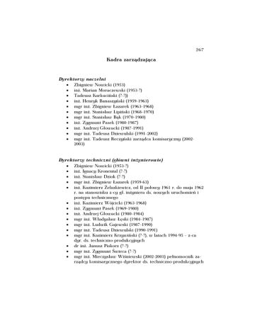 267 Kadra zarządzająca Dyrektorzy naczelni Zbigniew Nowicki (1953) inż. Marian Moraczewski (1953-?) Tadeusz Karkuciński (?-?)) inż. Henryk Banaszyński (1959–1963) mgr inż. Zbigniew Łazarek (1963–1968) mgr inż. Stanisław Lipiński (1968–1970) mgr inż. Stanisław Bąk (1970–1980) inż. Zygmunt Pasek (1980-1987) inż. Andrzej Głowacki (1987-1991) mgr inż. Tadeusz Dziewulski (1991–2002) mgr inż. Tadeusz Reczyński zarządca komisaryczny (20022003) Dyrektorzy techniczni (główni inżynierowie) Zbigniew Nowicki (1953-?) inż. Ignacy Kronental (?-?) inż. Stanisław Dziok (?-?) mgr inż. Zbigniew Łazarek (1959-63) inż. Kazimierz Żelazkiewicz, od II połowy 1961 r. do maja 1962 r. na stanowisku z-cy gł. inżyniera ds. nowych uruchomień i postępu technicznego inż. Kazimierz Wójcicki (1963-1968) inż. Zygmunt Pasek (1969–1980) inż. Andrzej Głowacki (1980–1984) mgr inż. Władysław Łęski (1984–1987) mgr inż. Ludwik Gajewski (1987–1990) mgr inż. Tadeusz Dziewulski (1990-1991) mgr inż. Kazimierz Krzywiński (?-?), w latach 1994-95 – z-ca dyr. ds. techniczno-produkcyjnych dr inż. Janusz Piskorz (?-?) mgr inż. Zygmunt Świeca (?-?) mgr inż. Mieczysław Wiśniewski (2002-2003) pełnomocnik zarządcy komisarycznego dyrektor ds. techniczno-produkcyjnych 268 Dyrektorzy handlowi Zygmunt Skrężyna (?-?) mgr inż. Piotr Matejuk (197?-?) mgr inż. Janusz Szajniuk (197?-?) mgr inż. Tadeusz Reczyński (?-?) mgr inż. Kazimierz Krzywiński (199?–2002) Dyrektorzy ekonomiczni mgr Edward Bilski (1962–?) mgr Marian Uraz (1969–1973) mgr Halina Raczyńska (?-?) mgr Przemysław Brzeziński (1975–198?) mgr Maria Proć (?-?) Dyrektorzy ds. produkcji (szefowie produkcji) ….. inż. Henryk Dąbrowski szef produkcji (196?-?) Jan Boczek – szef produkcji (196?-?) inż. Kazimierz Reczyński (….1971…. inż. Andrzej Głowacki (?–1978) mgr inż. Mieczysław Wiśniewski (1978-1991 i 1992-2001) Dyrektorzy ds. inwestycji (kierownicy Działu Inwestycji) … Witold Majewski kierownik Działu Inwestycji (1961–?) mgr inż. Stefan Kołodziejczyk (?-?) inż. Kazimierz Reczyński (1978–?) inż. Janusz Adamski (?-?) mgr inż. Zdzisław Briegert (….1997…. z-ca dyr. ds. inwestycji i przekształceń własnościowych Dyrektorzy ds. administracji Tadeusz Karkuciński (?-?) Wacław Osuch kierownik Działu Administracji (?-?) 269 mgr Marian Uraz (1969) z-ca dyrektora ds. administracyjnohandlowych mgr Ryszard Wlekły (1989–1991 z-ca dyr. ds. zaopatrz. i gosp. mat., 1992–2001 z-ca dyr. ds. administracji)) Główni księgowi Franciszek Gola Aleksander Przysucha Romualda Kołakowska Krystyna Kafarska mgr Agnieszka Białek Główni konstruktorzy inż. Tadeusz Bornsztajn (?-1962) inż. Bronisław Maciejewski (1962–1967) mgr inż. Jerzy Bezpałko (1967–1974) mgr inż. Jerzy Rossian – w ramach OBRUI (197?-?) mgr inż. Jan Bujakiewicz mgr inż. Tadeusz Dziewulski (1982-1990) mgr inż. Marek Siekierski (?-?) mgr inż. Jerzy Bezpałko kierownik Działu KonstrukcyjnoTechnologicznego (1993–1996) mgr inż. Zbigniew Kober kierownik Działu Konstrukcyjnego (1996–2003) Główni technolodzy inż. Stefan Mazurek (195?-?) inż. Jerzy Dryszel (195?-?) inż. Kazimierz Wójcicki (1959–1963) inż. Jerzy Szczepański (1963–197?) mgr inż. Władysław Łęski (197?– 197?) mgr inż. Ludwik Gajewski (197?-?) mgr inż. Piotr Szczypkowski (197?-?) mgr inż. Zygmunt Świeca (197?-?) mgr inż. Jerzy Bezpałko (1997–2001) mgr inż. Zygmunt Świeca (2001–2003) 270 Główni elektronicy mgr inż. Franciszek Szawłowski (196?-?) mgr inż. Kazimierz Tuzimski (197?-?) Kierownicy wydziałów produkcyjnych Wydział Obróbki Mechanicznej …. inż. Wacław Bałdys (195?-?) inż. Jan Środa (?-?) Włodzimierz Majewski (?–1971) mgr inż. Mieczysław Wiśniewski (1971-1974) inż. Władysław Jasiński (1974-?) mgr inż. Zbigniew Kober (?-?) Wydział Produkcji Części Zegarka mgr inż. Jan Polański (?-?) Wydział Obróbki Blacharskiej Feliks Staniak (?-?) Jan Kryk (1992–200?) mgr inż. Jerzy Heropolitański (200?-?) Wydział Obróbki Powierzchniowej i Chemicznej inż. Konstanty Choroszucha (?-?) mgr inż. Mieczysław Opioła (1960–196?) Robert Czarnecki (196?-?) Janusz Krzyżanowski (?-?) Henryk Zdunek (?-?) mgr inż. Tadeusz Kryński (?-?) inż. Andrzej Maciąg (1992–2003) Wydział Przetwórstwa Tworzyw Sztucznych Antoni Bialikiewicz (?-?) Wydział Obwodów Drukowanych mgr inż. Ryszard Reszka (?-?) 271 Wydział Montażu … mgr inż. Mieczysław Wandzel (1960 ?–1965 ?) Stanisław Przysiwek (1965 ?–1969 ?) inż. Andrzej Głowacki (197? inż. Janusz Adamski mgr inż. Tadeusz Iwanicki mgr Leszek Jankowski mgr inż. Tadeusz Kryński mgr inż. Marek Siekierski (p.o.) Joanna Gmyrek mgr inż. Waldemar Gontarz Dział Kontroli Jakości inż. Czesław Zamiar inż. Henryk Dąbrowski mgr inż. Piotr Szczypkowski mgr inż. Władysław Ziółek mgr inż. Henryk Szczepański mgr inż. Jerzy Kurpiewski mgr Zenon Reszka Zakład Doświadczalny i OBRUI „Mera –Błonie” inż. Wacław Bałdys dyrektor naczelny mgr inż. Stefan Stopiński dyrektor techniczny mgr inż. Bolesław Mizeracki dyrektor techniczny mgr inż. Tadeusz Zemła dyrektor techniczny ds. rozwoju w OBRUI „Mera-Błonie” mgr inż. Franciszek Szawłowski dyrektor OBRUI „MeraBłonie” inż. Zbigniew Czarkowski kierownik wydziału mgr inż. Franciszek Szafrański kier. Zakładu Doświadczalnego mgr inż. Edward Dołba Kierownicy wydziałów pomocniczych Dział Gospodarki Narzędziowej inż. Jerzy Aleksandrowicz Tadeusz Marcak 272 mgr mgr mgr mgr inż. inż. inż. inż. Antoni Wodzyński (197?-1978) Jerzy Osuch (1979–1984) Adam Berliński (1984-?) Józef Rokicki (198?-?) Dział Głównego Mechanika Witold Majewski inż. Włodzimierz Łukasiewicz inż. Stefan Ambroziewicz mgr inż. Jerzy Mularczyk (w ramach połączenia Działów Głównego Energetyka i Głównego Mechanika) inż. Ryszard Kościołowski mgr inż. Zdzisław