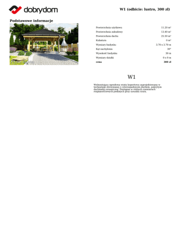 W1 (odbicie: lustro, 300 zł) Podstawowe informacje Powierzchnia użytkowa 11.20 m² Powierzchnia zabudowy 13.40 m² Powierzchnia dachu 25.50 m² Kubatura 0 m³ Wymiary budynku 3.70 x 3.70 m Kąt nachylenia 30° Wysokość budynku 30 m Wymiary działki 0x0m cena 300 zł W1 Wolnostojąca ogrodowa wiata kopertowa zaprojektowana w technologii drewnianej z czterospadowym dachem, pokrytym dachówką ceramiczną. Dostępna w różnych rozmiarach rozpiętościowych podanych przy rysunku rzutu. W1 (odbicie: lustro, 300 zł) Rzuty