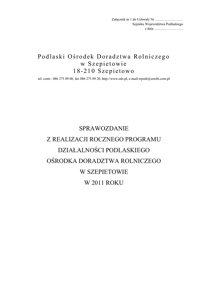 Załącznik nr 1 do Uchwały Nr …………………… Sejmiku Województwa Podlaskiego z dnia ……………………. Podlaski Ośrodek Doradztwa Rolniczego w Szepietowie 18-210 Szepietowo tel. centr.: 086 275 89 00, fax 086 275 89 20, http://www.odr.pl, e-mail:[email protected] SPRAWOZDANIE Z REALIZACJI ROCZNEGO PROGRAMU DZIAŁALNOŚCI PODLASKIEGO OŚRODKA DORADZTWA ROLNICZEGO W SZEPIETOWIE W 2011 ROKU I. Wstęp Podlaski Ośrodek Doradztwa Rolniczego w Szepietowie w 2011 roku funkcjonował w uwarunkowaniach prawnych i organizacyjnych określonych ustawą z dnia 22 października 2004 roku o jednostkach doradztwa rolniczego (Dz. U. 2004 nr 251 poz. 2507 z późn. zm.) oraz statutem nadanym Podlaskiemu Ośrodkowi Doradztwa Rolniczego w Szepietowie Uchwałą Nr XLVI/532/10 z dnia 5 listopada 2010 roku przez Sejmik Województwa Podlaskiego. Podstawowe zadania doradztwa rolniczego zdefiniowane zostały w art. 2 ust. 2a i 2b ustawy o jednostkach doradztwa rolniczego (Dz. U. Nr 251 poz. 2507 z późn. zm.) następująco: „Ośrodki wojewódzkie są samorządowymi wojewódzkimi osobami prawnymi. Zadaniem Centrum Doradztwa i ośrodków wojewódzkich jest prowadzenie doradztwa rolniczego obejmującego działania w zakresie rolnictwa, rozwoju wsi, rynków rolnych oraz wiejskiego gospodarstwa domowego, mające na celu poprawę poziomu dochodów rolniczych oraz podnoszenie konkurencyjności rynkowej gospodarstw rolnych, wspieranie zrównoważonego rozwoju obszarów wiejskich, a także podnoszenie poziomu kwalifikacji zawodowych rolników i innych mieszkańców obszarów wiejskich”. Zgodnie z art. 2 ust. 2a i 2b ustawy o jednostkach doradztwa rolniczego, Podlaski Ośrodek Doradztwa Rolniczego w Szepietowie jest samorządową wojewódzką osobą prawną (od dnia 1 sierpnia 2009 r.). Zadania Podlaskiego Ośrodka Doradztwa Rolniczego na 2011 rok zostały określone w „Rocznym programie działalności PODR na 2011 rok”. Program ten został zaopiniowany przez Radę Społeczną Doradztwa Rolniczego Uchwałą Nr XXXI-62-9/2010 z dnia 8 października 2010 roku i zatwierdzony w dniu 5 listopada 2010 roku przez Sejmik Województwa Podlaskiego Uchwałą Nr XLVI/531/10. Uwzględniając obowiązujący stan prawny oraz przyrodnicze, organizacyjne i ekonomiczne uwarunkowania produkcji rolniczej województwa podlaskiego, a także potrzeby doradcze podlaskich rolników działalność Podlaskiego Ośrodka Doradztwa Rolniczego koncentrowała się w 2011 r. na realizacji następujących celów strategicznych: 1. Poprawa konkurencyjności gospodarstw rolnych. 2. Dostosowywanie gospodarstw rolnych do obowiązujących standardów w zakresie technologii produkcji rolniczej, ochrony środowiska i dobrostanu zwierząt. 3. Wsparcie działań związanych z wielofunkcyjnym rozwojem obszarów wiejskich. 4. Doskonalenie zawodowe rolników i mieszkańców wsi oraz upowszechnianie innowacji. 2 Powyższe cele strategiczne realizowane były w 2011 roku przez doradców zatrudnionych w 14 powiatowych zespołach doradztwa rolniczego, przy merytorycznym wsparciu poszczególnych działów branżowych Podlaskiego Ośrodka Doradztwa Rolniczego. Realizacja odbywała się głównie poprzez: – prowadzenie doradztwa indywidualnego i grupowego, – organizowanie różnorodnych form szkoleniowych, – prowadzenie działalności informacyjnej i wydawniczej, – organizowanie wystaw, targów, pokazów, konkursów itp. Aby mieć możliwość sprawnego monitorowania realizowanych zadań w 2010 roku wprowadzono system sprawozdawczości elektronicznej. Przy realizacji zadań określonych Rocznym programem działalności Podlaskiego Ośrodka Doradztwa Rolniczego na 2011 rok, szczególną uwagę zwracano na jakość. Narzędziem umożliwiającym podnoszenie poziomu oferowanych usług jest System Zarządzania Jakością, który gwarantuje stały postęp i rozwój. System Zarządzania Jakością, tworzy ramy do ciągłego doskonalenia, w celu zwiększenia zadowolenia Klienta. W 2011 roku Podlaski Ośrodek Doradztwa Rolniczego w Szepietowie kontynuował prace nad doskonaleniem systemu zarządzania jakością, zgodnego z wymaganiami normy PN-EN ISO 9001:2009. System ten jest integralną częścią systemu zarządzania Ośrodka. System Zarządzania Jakością wprowadzony w Podlaskim Ośrodku Doradztwa Rolniczego w Szepietowie, ma na celu zapewnienie zgodności usług z wymaganiami i oczekiwaniami Klientów w rozumieniu normy PN-EN ISO 9001:2009. Zakres systemu zarządzania jakością w Ośrodku obejmuje świadczenie usług edukacyjnych i doradczych rolnikom i mieszkańcom obszarów wiejskich. W Ośrodku zostały zidentyfikowane procesy główne oraz procesy pomocnicze. Zidentyfikowanie i zarządzanie procesami jako systemem, pozwala na zwiększenie skuteczności w codziennej pracy oraz ułatwia osiąganie przyjętych celów. Nadzór nad systemem jest prowadzony poprzez bieżące audity wewnętrzne, których w 2011 roku przeprowadzono 25. Sprawne funkcjonowanie systemu zostało potwierdzone podczas auditu zewnętrznego recertyfikacyjnego przeprowadzonego przez jednostkę certyfikującą IMQ w dniach 30.11 – 2.12.2011 roku. Ponadto rozszerzono zakres certyfikatu o organizację imprez targowo-wystawienniczych. 3 II. Realizacja zadań Cel 1. Poprawa konkurencyjności gospodarstw rolnych. W 2011 roku Podlaski Ośrodek Doradztwa Rolniczego w Szepietowie podjął szereg działań przyczyniających się do poprawy konkurencyjności podlaskich rolników. Doradcy starali się korzystnie wpłynąć na sytuację finansową gospodarstw rolnych między innymi poprzez upowszechnianie nowoczesnych i efektywnych ekonomicznie technologii produkcji rolniczej. Doradztwo technologiczne ukierunkowane było głównie na poprawę jakości oraz zagadnienia bezpośrednio związane z bezpiecznymi dla ludzi i środowiska metodami wytwarzania produktów roślinnych. Upowszechnianie systemów produkcji i standardów jakościowych realizowano poprzez świadczenie rolnikom por