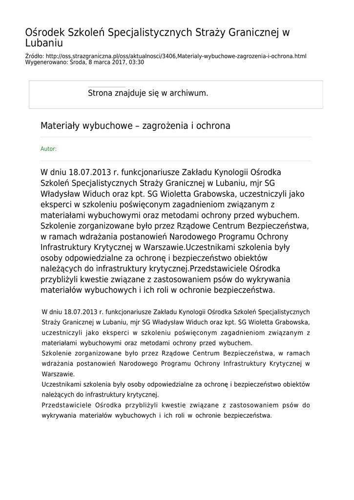 Ośrodek Szkoleń Specjalistycznych Straży Granicznej w Lubaniu Źródło: http://oss.strazgraniczna.pl/oss/aktualnosci/3406,Materialy-wybuchowe-zagrozenia-i-ochrona.html Wygenerowano: Środa, 8 marca 2017, 03:30 Strona znajduje się w archiwum. Materiały wybuchowe – zagrożenia i ochrona Autor: W dniu 18.07.2013 r. funkcjonariusze Zakładu Kynologii Ośrodka Szkoleń Specjalistycznych Straży Granicznej w Lubaniu, mjr SG Władysław Widuch oraz kpt. SG Wioletta Grabowska, uczestniczyli jako eksperci w szkoleniu poświęconym zagadnieniom związanym z materiałami wybuchowymi oraz metodami ochrony przed wybuchem. Szkolenie zorganizowane było przez Rządowe Centrum Bezpieczeństwa, w ramach wdrażania postanowień Narodowego Programu Ochrony Infrastruktury Krytycznej w Warszawie.Uczestnikami szkolenia były osoby odpowiedzialne za ochronę i bezpieczeństwo obiektów należących do infrastruktury krytycznej.Przedstawiciele Ośrodka przybliżyli kwestie związane z zastosowaniem psów do wykrywania materiałów wybuchowych i ich roli w ochronie bezpieczeństwa. W dniu 18.07.2013 r. funkcjonariusze Zakładu Kynologii Ośrodka Szkoleń Specjalistycznych Straży Granicznej w Lubaniu, mjr SG Władysław Widuch oraz kpt. SG Wioletta Grabowska, uczestniczyli jako eksperci w szkoleniu poświęconym zagadnieniom związanym z materiałami wybuchowymi oraz metodami ochrony przed wybuchem. Szkolenie zorganizowane było przez Rządowe Centrum Bezpieczeństwa, w ramach wdrażania postanowień Narodowego Programu Ochrony Infrastruktury Krytycznej w Warszawie. Uczestnikami szkolenia były osoby odpowiedzialne za ochronę i bezpieczeństwo obiektów należących do infrastruktury krytycznej. Przedstawiciele Ośrodka przybliżyli kwestie związane z zastosowaniem psów do wykrywania materiałów wybuchowych i ich roli w ochronie bezpieczeństwa.