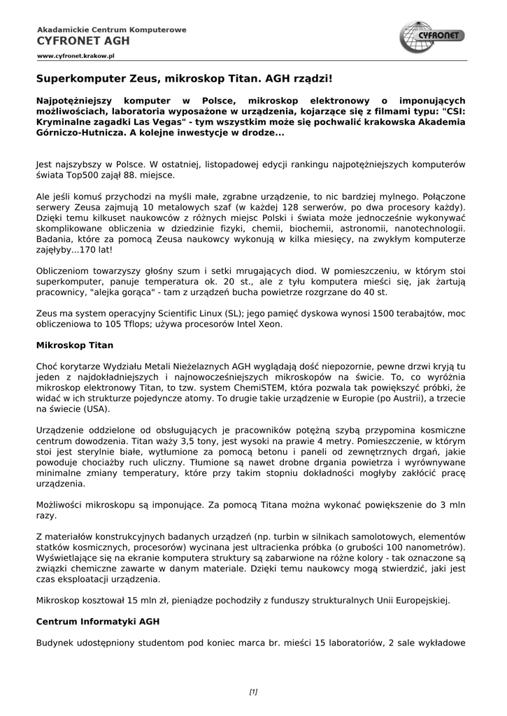 Superkomputer Zeus, mikroskop Titan. AGH rządzi! Najpotężniejszy komputer w Polsce, mikroskop elektronowy o imponujących możliwościach, laboratoria wyposażone w urządzenia, kojarzące się z filmami typu: "CSI: Kryminalne zagadki Las Vegas" - tym wszystkim może się pochwalić krakowska Akademia Górniczo-Hutnicza. A kolejne inwestycje w drodze... Jest najszybszy w Polsce. W ostatniej, listopadowej edycji rankingu najpotężniejszych komputerów świata Top500 zajął 88. miejsce. Ale jeśli komuś przychodzi na myśli małe, zgrabne urządzenie, to nic bardziej mylnego. Połączone serwery Zeusa zajmują 10 metalowych szaf (w każdej 128 serwerów, po dwa procesory każdy). Dzięki temu kilkuset naukowców z różnych miejsc Polski i świata może jednocześnie wykonywać skomplikowane obliczenia w dziedzinie fizyki, chemii, biochemii, astronomii, nanotechnologii. Badania, które za pomocą Zeusa naukowcy wykonują w kilka miesięcy, na zwykłym komputerze zajęłyby...170 lat! Obliczeniom towarzyszy głośny szum i setki mrugających diod. W pomieszczeniu, w którym stoi superkomputer, panuje temperatura ok. 20 st., ale z tyłu komputera mieści się, jak żartują pracownicy, "alejka gorąca" - tam z urządzeń bucha powietrze rozgrzane do 40 st. Zeus ma system operacyjny Scientific Linux (SL); jego pamięć dyskowa wynosi 1500 terabajtów, moc obliczeniowa to 105 Tflops; używa procesorów Intel Xeon. Mikroskop Titan Choć korytarze Wydziału Metali Nieżelaznych AGH wyglądają dość niepozornie, pewne drzwi kryją tu jeden z najdokładniejszych i najnowocześniejszych mikroskopów na świcie. To, co wyróżnia mikroskop elektronowy Titan, to tzw. system ChemiSTEM, która pozwala tak powiększyć próbki, że widać w ich strukturze pojedyncze atomy. To drugie takie urządzenie w Europie (po Austrii), a trzecie na świecie (USA). Urządzenie oddzielone od obsługujących je pracowników potężną szybą przypomina kosmiczne centrum dowodzenia. Titan waży 3,5 tony, jest wysoki na prawie 4 metry. Pomieszczenie, w którym stoi jest sterylnie białe, wytłumione za pomocą betonu i paneli od zewnętrznych drgań, jakie powoduje chociażby ruch uliczny. Tłumione są nawet drobne drgania powietrza i wyrównywane minimalne zmiany temperatury, które przy takim stopniu dokładności mogłyby zakłócić pracę urządzenia. Możliwości mikroskopu są imponujące. Za pomocą Titana można wykonać powiększenie do 3 mln razy. Z materiałów konstrukcyjnych badanych urządzeń (np. turbin w silnikach samolotowych, elementów statków kosmicznych, procesorów) wycinana jest ultracienka próbka (o grubości 100 nanometrów). Wyświetlające się na ekranie komputera struktury są zabarwione na różne kolory - tak oznaczone są związki chemiczne zawarte w danym materiale. Dzięki temu naukowcy mogą stwierdzić, jaki jest czas eksploatacji urządzenia. Mikroskop kosztował 15 mln zł, pieniądze pochodziły z funduszy strukturalnych Unii Europejskiej. Centrum Informatyki AGH Budynek udostępniony studentom pod koniec marca br. mieści 15 laboratoriów, 2 sale wykładowe [1] (dla 250 i 150 osób) i kilkanaście pomieszczeń dydaktycznych. Na razie to jeden z najnowocześniejszych ośrodków do kształcenia młodych informatyków na świecie, choć wciąż powstają kolejne z coraz nowszymi systemami. W czasie ćwiczeń studenci mają dostęp do małej serwerowni - to odwzorowanie sieci wykorzystywanej przez banki i duże korporacje. Dzięki temu po ukończeniu studiów mają już doświadczenie praktyczne. Prawdziwe cuda kryje laboratorium wirtualnej rzeczywistości i wizualizacji 3D. Obrazy odtwarzane są na dwóch ekranach i na przypominającym szklany stół ekranie dotykowym rodem z serialu "CSI: Kryminalne zagadki Las Vegas". Do takich zabaw potrzebny jest jednak komputer o niemałej mocy. Serwer do wizualizacji zastępuje... 3 tys. komputerów osobistych. Budowa Centrum Informatyki trwała niecałe dwa lata. Inwestycja, która kosztowała niemal 65 mln zł, została sfinansowana ze środków UE w ramach Małopolskiego Regionalnego Programu Operacyjnego. Inżynieria materiałowa i ceramika Ostatnimi inwestycjami Akademii Górniczo-Hutniczej jest Wydział Inżynierii Materiałowej i Ceramiki oraz Centrum Nanotechnologii. Pierwszy z obiektów ma zostać oficjalnie otwarty i udostępniony studentom z końcem maja. W obu budynkach trwają prace wykończeniowe, montowana jest aparatura. Barbara Suchy, Dorota Gut Gazeta Wyborcza, Kraków 15 kwietnia 2012 [2] Powered by TCPDF (www.tcpdf.org)