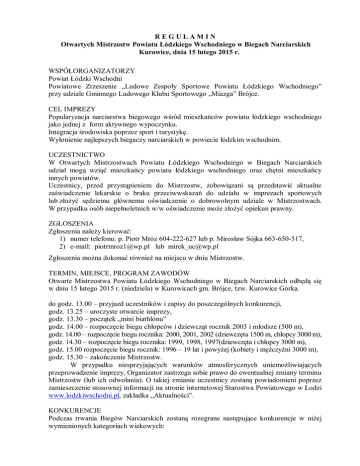 REGULAMIN Otwartych Mistrzostw Powiatu Łódzkiego Wschodniego w Biegach Narciarskich Kurowice, dnia 15 lutego 2015 r. WSPÓŁORGANIZATORZY Powiat Łódzki Wschodni Powiatowe Zrzeszenie „Ludowe Zespoły Sportowe Powiatu Łódzkiego Wschodniego” przy udziale Gminnego Ludowego Klubu Sportowego „Miazga” Brójce. CEL IMPREZY Popularyzacja narciarstwa biegowego wśród mieszkańców powiatu łódzkiego wschodniego jako jednej z form aktywnego wypoczynku. Integracja środowiska poprzez sport i turystykę. Wyłonienie najlepszych biegaczy narciarskich w powiecie łódzkim wschodnim. UCZESTNICTWO W Otwartych Mistrzostwach Powiatu Łódzkiego Wschodniego w Biegach Narciarskich udział mogą wziąć mieszkańcy powiatu łódzkiego wschodniego oraz chętni mieszkańcy innych powiatów. Uczestnicy, przed przystąpieniem do Mistrzostw, zobowiązani są przedstawić aktualne zaświadczenie lekarskie o braku przeciwwskazań do udziału w imprezach sportowych lub złożyć sędziemu głównemu oświadczenie o dobrowolnym udziale w Mistrzostwach. W przypadku osób niepełnoletnich w/w oświadczenie może złożyć opiekun prawny. ZGŁOSZENIA Zgłoszenia należy kierować: 1) numer telefonu: p. Piotr Mróz 604-222-627 lub p. Mirosław Sójka 663-650-517, 2) e-mail: [email protected] lub [email protected] Zgłoszenia można dokonać również na miejscu w dniu Mistrzostw. TERMIN, MIEJSCE, PROGRAM ZAWODÓW Otwarte Mistrzostwa Powiatu Łódzkiego Wschodniego w Biegach Narciarskich odbędą się w dniu 15 lutego 2015 r. (niedziela) w Kurowicach gm. Brójce, tzw. Kurowice Górka. do godz. 13.00 – przyjazd uczestników i zapisy do poszczególnych konkurencji, godz. 13.25 – uroczyste otwarcie imprezy, godz. 13.30 – początek „mini biathlonu” godz. 14.00 – rozpoczęcie biegu chłopców i dziewcząt rocznik 2003 i młodsze (500 m), godz. 14.00 – rozpoczęcie biegu rocznika: 2000, 2001, 2002 (dziewczęta 1500 m, chłopcy 3000 m), godz. 14.30 – rozpoczęcie biegu rocznika: 1999, 1998, 1997(dziewczęta i chłopcy 3000 m), godz. 15.00 rozpoczęcie biegu rocznik: 1996 – 19 lat i powyżej (kobiety i mężczyźni 3000 m), godz. 15.30 – zakończenie Mistrzostw. W przypadku niesprzyjających warunków atmosferycznych uniemożliwiających przeprowadzenie imprezy, Organizator zastrzega sobie prawo do ewentualnej zmiany terminu Mistrzostw (lub ich odwołania). O takiej zmianie uczestnicy zostaną powiadomieni poprzez zamieszczenie stosownej informacji na stronie internetowej Starostwa Powiatowego w Łodzi www.lodzkiwschodni.pl, zakładka „Aktualności”. KONKURENCJE Podczas trwania Biegów Narciarskich zostaną rozegrane następujące konkurencje w niżej wymienionych kategoriach wiekowych: 1. „mini biathlon” dziewcząt (rocznik: 2003 i młodsze – do 12 lat) 2. „mini biathlon” chłopców (rocznik: 2003 i młodsi – do 12 lat) 3. „mini biathlon” dziewcząt (rocznik: 2002 i starsze – powyżej 13 lat) 4. „mini biathlon” chłopców (rocznik: 2002 i starsi – powyżej 13 lat) 5. bieg narciarski dziewcząt (rocznik: 2003 i młodsze – do 12 lat) 6. bieg narciarski chłopców (rocznik: 2003 i młodsi – do 12 lat) 7. bieg narciarski dziewcząt (rocznik: 2000, 2001, 2002 – 13, 14, 15 lat) 8. bieg narciarski chłopców (rocznik: 2000, 2001, 2002 – 13, 14, 15 lat) 9. bieg narciarski kobiet (rocznik: 1999, 1998, 1997 – 16, 17, 18 lat) 10. bieg narciarski mężczyzn (rocznik: 1999, 1998, 1997 – 16, 17, 18 lat) 11. bieg narciarski Open kobiet (rocznik: 1996 – 19 lat i powyżej) 12. bieg narciarski Open mężczyzn (rocznik: 1996 – 19 lat i powyżej) SPOSÓB PRZEPROWADZENIA KONKURENCJI BIEGÓW NARCIARSKICH Sposób przeprowadzenia poszczególnych konkurencji w Mistrzostwach zostanie ustalony przez współorganizatora – Powiatowe Zrzeszenie „Ludowe Zespoły Sportowe Powiatu Łódzkiego Wschodniego” po zakończeniu przyjmowania zgłoszeń. Sposób przeprowadzenia „mini biathlonu”: uczestnik biegnie ok. 20 - 30 m do stanowiska z 3 piłkami palantowymi, gdzie oddaje 3 rzuty do koła. Za każdy niecelny rzut piłką uczestnik odbywa rundę karną 30 m, a następnie 60 m bieg do mety. Styl dowolny. ZASADY FINANSOWANIA ORAZ ŚWIADCZENIA WSPÓŁORGANIZATORÓW 1) Koszty organizacyjne Otwartych Mistrzostwach Powiatu Łódzkiego Wschodniego w Biegach Narciarskich, w tym: przygotowanie tras biegowych, zakup medali dla uczestników, którzy w poszczególnych konkurencjach zajmą I, II i III miejsce, pokrycie kosztów związanych z wynagrodzeniem dla sędziów i opieki przedmedycznej, napoje i ciepły posiłek dla uczestników Mistrzostw – zapewniają współorganizatorzy. 2) Koszty ubezpieczenia NNW na czas udziału w Mistrzostwach uczestnicy pokrywają we własnym zakresie, a w przypadku dzieci i młodzieży niepełnoletniej pokrywają opiekunowie. 3) Uczestnicy muszą posiadać własny sprzęt narciarski. TYLKO na „mini-biathlon” możliwość wypożyczenia nart biegowych, butów i kijów. NAGRODY Medale za zajęcie I, II i III miejsca w poszczególnych kategoriach wiekowych. POSTANOWIENIA KOŃCOWE Za przyjazd, odjazd i pobyt na Mistrzostwach uczestnicy odpowiadają indywidualnie, a w przypadku dzieci i młodzieży niepełnoletniej odpowiadają opiekunowie. Współorganizatorzy nie ponoszą odpowiedzialności za szkody, kontuzje i nieszczęśliwe wypadki zaistniałe przed, w czasie i po Mistrzostwach. Współorganizatorzy nie ponoszą odpowiedzialności za rzeczy zagubione lub pozostawione przez uczestników podczas trwania Mistrzostw. Wszystkie sprawy sporne oraz nieujęte w niniejszym regulaminie rozstrzyga współorganizator – Powiatowe Zrzeszenie „Ludowe Zespoły Sportowe Powiatu Łódzkiego Wschodniego” i sędzia główny Biegów Narciarskich. Interpretacja niniejszego regulaminu należy do współorganizatorów.