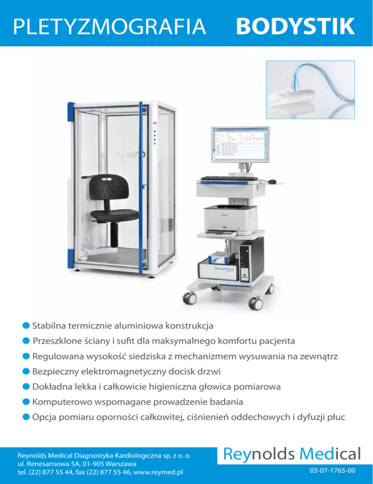 PLETYZMOGRAFIA BODYSTIK ● S tabilna termicznie aluminiowa konstrukcja ● Przeszklone ściany i sufit dla maksymalnego komfortu pacjenta ● Regulowana wysokość siedziska z mechanizmem wysuwania na zewnątrz ● Bezpieczny elektromagnetyczny docisk drzwi ● Dokładna lekka i całkowicie higieniczna głowica pomiarowa ● Komputerowo wspomagane prowadzenie badania ●O pcja pomiaru oporności całkowitej, ciśnienień oddechowych i dyfuzji płuc Reynolds Medical Diagnostyka Kardiologiczna sp. z o. o. ul. Renesansowa 5A, 01-905 Warszawa tel. (22) 877 55 44, fax (22) 877 55 46, www.reymed.pl Reynolds Medical 03-07-1765-00 PLETYZMOGRAFIA BODYSTIK Bodystik jest nowoczesnym systemem do badań specyfikacja techniczna pletyzmograficznych całego ciała. Zestaw, produkcji pomiar przepływu czujnik ergoflow niemieckiej firmy Geratherm Respiratory, umożliwia metoda pomiaru różnica ciśn. na zmiennej kryzie zakres pomiaru przepływu +/- 16 L/s zakres pomiaru wentylacji 0 - 300 L/min opór przepływu <0,12 kPa/L/s oporności całkowitej (Raw) i metodą okluzyjną (Rocc), efektywna przestrzeń martwa <20 mL maksymalnych ciśnień oddechowych (MIP/MEP) rozdzielczość przepływu < 1 mL/s częstość próbkowania 125 Hz dokładność +/- 3% lub 20 mL/s zakres pomiaru objętości 0 - 20 L dokładność +/- 3% lub 50 mL pomiar ciśnień półprzewodnik rozwiązanie technologiczne, zapewniające wyjątkową zakres pomiaru +/- 25 kPa dokładność i liniowość, przy zachowaniu minimalnych dokładność 1% rozdzielczość 15 bit wykonywanie standardowych badań spirometrycznych, ocenę pojemności i objętości płuc (TGV, TLC, RV), i jest rozbudowywalny o dalsze moduły diagnostyki oddechowej, np. ocenę dyfuzji gazów w płucach. Czujnik pomiarowy Ergoflow stanowi unikalne oporów przepływu w całym zakresie pomiarowym. Konstrukcja zapewnia pełną zgodność ze standardami ATS i ERS, a przy tym jest rozwiązaniem pozbawionym elementów ruchomych oraz elektroniki pomiarowej. Czujnik wykorzystuje uchylną kryzę o specjalnie dobranej pomiar objętości zakres pomiaru 0 - 20 L dokładność +/- 3% lub 50 mL wymiary (dł x szer x wys), waga 75cm x 85cm x 170cm, 140 kg klasa wykonania obudowy IPX0 (IEC 529) klasyfikacja aparatu IIa (93/42/EWG), BF (EN 60601-1) geometrii i sprężystości, dzięki czemu liniowość i precyzja temparatura i wilgotność pracy +15 - +35 st. C, 10-90% bez kond. łączy się z małymi oporami przepływu, w całym zakresie zasilanie kabiny 24 V, maks. 4,2 A pomiarowym. Możliwe jest łatwe wielokrotne dezynfekowanie i czyszczenie czujnika bez rozbierania na elementy. Wyjątkowo mała objętość martwa układu pomiarowego (<20 mL) oraz mała masa czujnika, umożliwiają wykorzystanie zestawu do badań u dzieci Opcje zestawu do badań pletyzmograficznych Bodystik: zintegrowany pulsoksymetr, zintegrowany pomiar warunków otoczenia, prowokacja oskrzelowa, wypłukiwanie N2, dyfuzja płuc metodą pojedynczego oddechu (CH4), oporność całkowita i okluzyjna, siła mięśni oddechowych przez pomiar ciśnień MIP/MEP, opcje sieciowe oraz integracja w standardzie HL7. ale również przy wysokiej wentylacji w badaniach sportowców. Prezentacja wyników badania. Reynolds Medical Diagnostyka Kardiologiczna sp. z o. o. ul. Renesansowa 5A, 01-905 Warszawa tel. (22) 877 55 44, fax (22) 877 55 46, www.reymed.pl Opcja pomiaru siły mięśni oddechowych Reynolds Medical 03-07-1765-00
