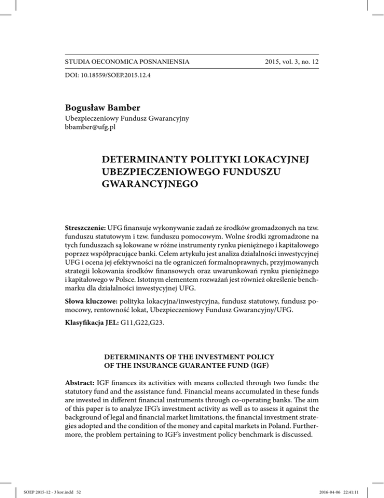 STUDIA OECONOMICA POSNANIENSIA 2015, vol. 3, no. 12 DOI: 10.18559/SOEP.2015.12.4 Bogusław Bamber Ubezpieczeniowy Fundusz Gwarancyjny [email protected] DETERMINANTY POLITYKI LOKACYJNEJ UBEZPIECZENIOWEGO FUNDUSZU GWARANCYJNEGO Streszczenie: UFG finansuje wykonywanie zadań ze środków gromadzonych na tzw. funduszu statutowym i tzw. funduszu pomocowym. Wolne środki zgromadzone na tych funduszach są lokowane w różne instrumenty rynku pieniężnego i kapitałowego poprzez współpracujące banki. Celem artykułu jest analiza działalności inwestycyjnej UFG i ocena jej efektywności na tle ograniczeń formalnoprawnych, przyjmowanych strategii lokowania środków finansowych oraz uwarunkowań rynku pieniężnego i kapitałowego w Polsce. Istotnym elementem rozważań jest również określenie benchmarku dla działalności inwestycyjnej UFG. Słowa kluczowe: polityka lokacyjna/inwestycyjna, fundusz statutowy, fundusz pomocowy, rentowność lokat, Ubezpieczeniowy Fundusz Gwarancyjny/UFG. Klasyfikacja JEL: G11,G22,G23. DETERMINANTS OF THE INVESTMENT POLICY OF THE INSURANCE GUARANTEE FUND (IGF) Abstract: IGF finances its activities with means collected through two funds: the statutory fund and the assistance fund. Financial means accumulated in these funds are invested in different financial instruments through co-operating banks. The aim of this paper is to analyze IFG’s investment activity as well as to assess it against the background of legal and financial market limitations, the financial investment strategies adopted and the condition of the money and capital markets in Poland. Furthermore, the problem pertaining to IGF’s investment policy benchmark is discussed. SOEP 2015-12 - 3 kor.indd 52 2016-04-06 22:41:11 Determinanty polityki lokacyjnej Ubezpieczeniowego Funduszu Gwarancyjnego 53 Keywords: investment policy, statutory fund, assistance fund, return on investment, Insurance Guarantee Fund/IGF. Wstęp Celem artykułu jest analiza determinant kształtujących realizację polityki lokacyjnej (inwestycyjnej) Ubezpieczeniowego Funduszu Gwarancyjnego (UFG) w sensie uwarunkowań formalnoprawnych oraz ekonomicznych tej polityki w latach 2003–2013 oraz ocena rentowności działalności lokacyjnej. Pierwsza grupa determinant wynika z rozwiązań prawnych odnoszących się do roli i zadań UFG jako podmiotu rynku ubezpieczeniowego wzmacniającego stabilność tego rynku oraz z priorytetów (celów), zasad i procedur polityki lokacyjnej, zasad rachunkowości i formalnych kryteriów oceny tej działalności. Natomiast drugą grupę determinant stanowią uwarunkowania działalności UFG w otoczeniu makroekonomicznym (stopy procentowe, inflacja), rynkowym (dostępne instrumenty finansowe, dynamika rynków finansowych) oraz instytucjonalnym (banki współpracujące). Na podstawie przeprowadzonej analizy uwarunkowań działalności UFG określono przestrzeń dla ewentualnych decyzji w zakresie rentowności polityki lokacyjnej 1. Uwarunkowania formalnoprawne kształtujące politykę lokacyjną UFG 1.1. Uwarunkowania dotyczące zadań finansowanych z funduszu statutowego i funduszu pomocowego oraz kształtowanie się wielkości tych funduszów Polityka lokacyjna UFG jest uwarunkowana czynnikami o charakterze formalnoprawnym, które wynikają z rozwiązań prawnych dotyczących roli i zadań UFG jako podmiotu rynku ubezpieczeniowego [Ustawa z dnia 22 maja 2003 r. o działalności, art. 96–119; Statut UFG, art. 43–49; Ustawa z dnia 22 maja 2003 o ubezpieczeniach, art. 153–154]. Działalność UFG polega przede wszystkim na tzw. kompensacji z działalności podstawowej, tj. na zaspokajaniu uzasadnionych roszczeń osób poszkodowanych, ubezpieczonych lub uprawionych w określonych sytuacjach losowych, np. szkoda spowodowana przez sprawcę nieubezpieczonego pojazdu lub nieubezpieczonego sprawcę w związku SOEP 2015-12 - 3 kor.indd 53 2016-04-06 22:41:19 54 Bogusław Bamber mln zł z posiadaniem gospodarstwa rolnego, czy też szkoda spowodowana przez niezidentyfikowanego sprawcę w zakresie OC posiadaczy pojazdów mechanicznych. Z kolei w zakresie realizacji roszczeń z upadłości (tzw. kompensacja z upadłości) kompensacją są objęte ubezpieczenia OC posiadaczy pojazdów mechanicznych i OC rolników oraz pozostałych ubezpieczeń obowiązkowych i umów ubezpieczenia na życie. Rolą UFG jest również wzmacnianie stabilności sektora ubezpieczeniowego poprzez minimalizowanie ryzyka niewypłacalności zakładów ubezpieczeń prowadzących działalność ubezpieczeniową z tytułu OC komunikacyjnego i OC rolników poprzez udzielanie zakładom ubezpieczeń zagrożonym upadłością zwrotnej pomocy finansowej. Dla finansowania tak określonych zadań w ramach UFG tworzone są dwa fundusze: fundusz statutowy i fundusz pomocowy, których wielkość w latach 2003–2014 pokazuje rysunek 1. W ciągu ostatnich pięciu lat wysokość funduszu statutowego kształtowała się w przedziale ca 41–71 mln zł, przy czym w latach 2010–2012 przedziale ca 41–47 mln zł, z uwagi na zwiększone koszty tworzenia ośrodka informacji działającego w strukturach UFG. 185,5 200 150 119,6 97,6 119,6 100 87,9 50 0 128,5 0,0 2003 9,7 2004 143,0 158,5 158,6 107,3 109,4 21,2 2005 33,6 2006 146,6 141,8 152,1 152,6 110,4 114,3 101,0 105,3 82,0 93,7 64,9 71,2 64,6 46,8 42,2 40,8 110,9 47,6 2007 2008 2009 2010 2011 2012 2013 Lata stan lokat (fundusz pomocowy i statutowy łącznie) fundusz pomocowy Rysunek 1. Wielkość środków funduszu statutowego i pomocowego UFG w latach 2003–2013 (na koniec każdego roku) Źródło: Na podstawie materiałów wewnętrznych UFG Fundusz statutowy jest tworzony w celu zapewnienia środków na finansowanie podstawowych zadań UFG. Powstaje z rozliczenia wyniku finansowego UFG – nadwyżka bilansowa osiągnięta w danym roku obrotowym powiększa fundusz statutowy, natomiast straty finansowe zmniejszają ten fundusz. W istocie są to środki finansowe skumulowane z lat poprzednic