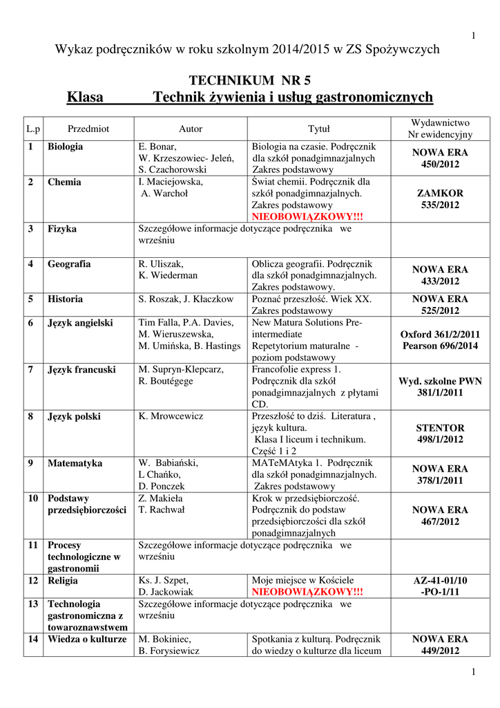 1 Wykaz podręczników w roku szkolnym 2014/2015 w ZS Spożywczych TECHNIKUM NR 5 Klasa L.p Przedmiot 1 Biologia 2 Chemia 3 Fizyka 4 Geografia 5 Historia 6 Język angielski 7 8 9 Język francuski Język polski Matematyka 10 Podstawy przedsiębiorczości 11 Procesy technologiczne w gastronomii 12 Religia 13 Technologia gastronomiczna z towaroznawstwem 14 Wiedza o kulturze Technik żywienia i usług gastronomicznych Autor Tytuł E. Bonar, W. Krzeszowiec- Jeleń, S. Czachorowski I. Maciejowska, A. Warchoł Biologia na czasie. Podręcznik dla szkół ponadgimnazjalnych Zakres podstawowy Świat chemii. Podręcznik dla szkół ponadgimnazjalnych. Zakres podstawowy NIEOBOWIĄZKOWY!!! Szczegółowe informacje dotyczące podręcznika we wrześniu R. Uliszak, K. Wiederman Oblicza geografii. Podręcznik dla szkół ponadgimnazjalnych. Zakres podstawowy. S. Roszak, J. Kłaczkow Poznać przeszłość. Wiek XX. Zakres podstawowy New Matura Solutions PreTim Falla, P.A. Davies, intermediate M. Wieruszewska, M. Umińska, B. Hastings Repetytorium maturalne poziom podstawowy M. Supryn-Klepcarz, Francofolie express 1. R. Boutégege Podręcznik dla szkół ponadgimnazjalnych z płytami CD. K. Mrowcewicz Przeszłość to dziś. Literatura , język kultura. Klasa I liceum i technikum. Część 1 i 2 W. Babiański, MATeMAtyka 1. Podręcznik L Chańko, dla szkół ponadgimnazjalnych. D. Ponczek Zakres podstawowy Z. Makieła Krok w przedsiębiorczość. T. Rachwał Podręcznik do podstaw przedsiębiorczości dla szkół ponadgimnazjalnych Szczegółowe informacje dotyczące podręcznika we wrześniu Wydawnictwo Nr ewidencyjny NOWA ERA 450/2012 ZAMKOR 535/2012 NOWA ERA 433/2012 NOWA ERA 525/2012 Oxford 361/2/2011 Pearson 696/2014 Wyd. szkolne PWN 381/1/2011 STENTOR 498/1/2012 NOWA ERA 378/1/2011 NOWA ERA 467/2012 Ks. J. Szpet, Moje miejsce w Kościele D. Jackowiak NIEOBOWIĄZKOWY!!! Szczegółowe informacje dotyczące podręcznika we wrześniu AZ-41-01/10 -PO-1/11 M. Bokiniec, B. Forysiewicz NOWA ERA 449/2012 Spotkania z kulturą. Podręcznik do wiedzy o kulturze dla liceum 1 2 15 Wiedza o społeczeństwie 16 Wyposażenie i zasady bezpieczeństwa w gastronomii 17 Informatyka 18 Etyka( zamiast religii) A.Janicki A. Kasperek, M. Kondratowicz E. Gurbiel, E. Kołczyk, H. Krupicka P. Kołodziński, J. Kapiszewski i technikum W centrum uwagi. Zakres podstawowy Gastronomia. Tom 1. Wyposażenie i zasady bezpieczeństwa w gastronomii Informatyka to podstawa. Zakres podstawowy NIEOBOWIĄZKOWY!!! Etyka. Podręcznik dla szkół ponadgimnazjalnych NOWA ERA 505/2012 REA 53/2013 WSiP 544/2012 OPERON 408/2011 Wszystkie w/w podręczniki znajdują się w wykazie podręczników MEN Wykaz podręczników znajduje się na stronie szkoły : www.zss.debacom.pl 2