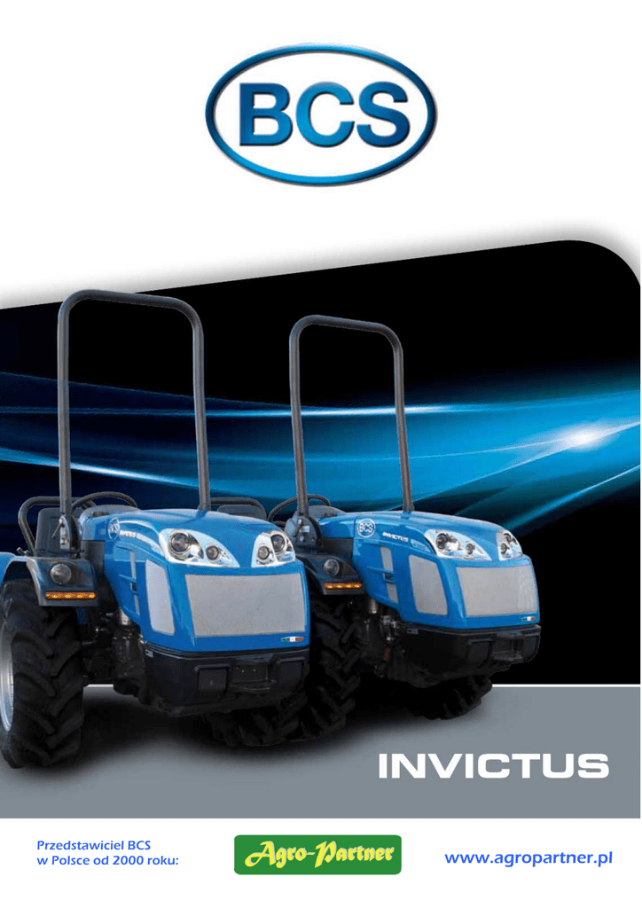 Przedstawiciel BCS w Polsce od 2000 roku: www.agropartner.pl Z ak u p n o we go ci ą gn ik a to p o w aż n a i nw e st yc j a : wyb ó r t eg o wł a ści w eg o n i e j es t w cal e p r o st y m z ad an i em . Zaw sz e z al ec am y p o r ówn a ć wi el e m od el i , z w ra caj ą c b a cz n ą u wag ę n a i ch p a r am et r y t e ch n i cz n e, w y m i ar y cz y el e m en t y wyp o s aż en i a. … i o st at e cz n i e, w yb ra ć ró wn i eż sp ra wd z on eg o p r od u c en t a. BCS jest Międzynarodową Spółką, jedną z najbardziej znanych na rynku w łosk im, w sektorze Maszyn dla rolnictwa oraz Maszyn do Pielęgnacji Zieleni. Założona w roku 1943, od roku 1994 posiada ISO 9001. Wyróżnia się wysoką jakością produktów oraz dużym potencjałem w każdej fazie powstawania produktu: projektowanie, produkcja oraz dystrybucja. Przywiązujemy bardzo dużą wagę do Obsługi po-sprzedażowej: przedstawiciele oraz pracownicy działu części zamiennych, wspierani przez techników oraz handlowców, są do dyspozycji każdego, kto chce uzyskać pomoc szybką Przedstawiciele BCS, będący integralną częścią sieci sprzedaży, są specjalistami potrafiącymi doradzić i dobrać najodpowiedniejszy produkt do potrzeb klienta. Dlaczego wybrać właśnie BCS … Od momentu zakupu ciągnika BC S uznajemy 2 lata gwarancji, również na silnik, wliczone w cenę. Ponieważ, zadowolenie i bezpieczeństwo naszych Klientów to jest to, na czym najbardziej nam zależy. Oferujemy Błękitne finansowanie, zarezerwowane dla nabywców p r o d u k t u m a r k i BC S , d o p a s o w a n e do indywidualnej sytuacji każdego naszego klienta. BŁĘKITNE finansowanie …i dlaczego wybrać właśnie ciągnik INVICTUS Ciągniki z serii INVICTUS są najlepszą odpowiedzią na potrzeby niewielkich gospodarstw rolnych, ogrodniczych, sadowniczych oraz wszystkich którzy potrzebują ciągnika o zwartej budowie, dużej zwrotności i dużej mocy w stosunku do masy własnej. Wszechstronne, nowoczesne, wydajne, bezpieczne i niezawodne. Ciągniki INVICTUS, o wszystkich kołach jednakowej średnicy, dostępne są w wersji Skrętnej w przegubie centralnym oraz ze Skrętnymi kołami osi przedniej. ZALETY: SI L N IK I M A RK I K UB OT A najnowszej generacji, chłodzone cieczą, specjalnie przystosowane do pracy w ciągnikach kompaktowych o kołac h równej średnicy N IE W IE LK A D Ł U G O ŚĆ 2,5 metra z prześwitem nad podło żem 25,8 cm N IE W IE LK A S ZE RO KO Ś Ć najmniejsza to mniej niż 1,0 m N IE W IE LK A M AS A W Ł A S N A poniżej 1000 kg H YD R A UL I K A wydajna, mogąca zasilić do 6 gniazd roboczej hydrauliki zewnętrznej DR Ą Ż KI ST E RO W N IC Z E usytuowane w sposób bardzo ergonomiczny pod kołem kierownicy, ułatw iając zaję cie pozycji za kierownicą i są zawsze pod ręką. PR A KT Y C Z N Y I KO M FO RT O W Y z łatwością obs ługiwany przez hobbistę i pół profesjonalistę. ST Y L IST Y K A nowoczesna i przyjemna dla oka. MAKSIMUM ZAUFANIA OSZCZĘDNOŚĆ CICHA PRACA MAŁE WIBRACJI Silnik: Silnik: mocne serce Dla ser ii ciągników INVICTUS zos tały wybrane silniki marki KUBOTA. Marka ta jest rozpoznawalna i ceniona na rynkach całego świata, jako lider w produkcji silników zarówno pod względem ilości jak i jakości produktów. Dwie jednostki napędowe ostatniej generacji poruszają ciągnik INVICTUS: 3 cylindrowy; 26 konny i 4 cylindrowy 35,6 konny, oba wolno ssące z wtryskiem pośrednim. Zarówno uzyskiwana moc jak i moment obrotowy, sytuują te silniki, wśród najlepszych w swojej kategorii. Poziom emisji spalin jest zgodny z obowiązującymi surowymi normami, dla danego zakresu uzyskiwanych mocy. INVICTUS Typ silnika Moc (kw/KM) Liczba cylindrów Pojemność skokowa Dopływ powierza Czynnik chłodzący K300 D1105 E3B 19,1/26 3 1123 wolnossący ciecz K400 V1505 E3B 26,2/35,6 4 1498 wolnossący ciecz Duże możliwości współpracy Instalacja hydrauliczna Instalacja hydrauliczna o dużych możliwościach z pompą wydajności 33 l/min i ciśnieniu roboczym 125 bar. Pozwala to, poza wyposażeniem w 6 gniazd zewnętrznych, na swobodne wykonywanie manewrów nawet przy jednoczesnym podnoszeniu narzędzia roboczego. Tylny podnośnik i TUZ Tylny podnośnik z siłownikami zewnętrznymi i TUZ kat. 1, wyposażonym w cięgła ograniczające ruch TUZ na boki. Udźwig TUZ na kulach ramion dolnych, to 1050 kg. Jest on wystarczający do współpracy z szeroką gamą narzędzi roboczych. Ramiona TUZ posiadają regulację wysokości. DOSKONAŁE OSIĄGI NIEZAWODNOŚĆ KOMFORT BEZPIECZEŃSTWO Przeniesienie napędu Przeniesienie napędu Układ przeniesienia napędu został wykonany by służył długie lata. W tym czasie zapewnia niezawodność oraz doskonałe osiągi, nie zmniejszając komfortu czy bezpieczeństwa. Zmniejsza również do minimum ilość konieczność do wykonywania przeglądów. WYKRES PRĘDKOŚCI W km/h PRZY OPONACH 210/95R16 CIĄGNIKÓW W WERSJI AR I RS Pon iższy wykre s pokazuje doskonałe u zu pe łn ian ie się pr ze łoże ń, be z n ad prędkości w żadnym z zakresów. Biegi wsteczne Biegi w przód Skrzynia biegów Skrzynia biegów wspomagana z 8 przełożeniami do przodu i 4 do tyłu bez nadbiegów. Prędkość maksymalna to 30 km/h, niezbędna przy pokonywaniu większych dystansów po drogach. Wałek Przekazania Mocy Tylny Wałek Przekazania Mocy jest sterowany mechanicznie o prędkości obrotowej 540 obr/min, posiada tryb pracy zsynchronizowany z prędkością jazdy. Włączanie w sposób stopniowy zapewnia bardziej dokładną i komfortową pracę, zwiększając jednocześnie jej wydajność. Jako wyposażenie poza standardowe, istnieje możliwość zamontowania niezależnego WPM ze sterowaniem elektrohydraulicznym. Czyni to ciągnik INVICTUS jest bardziej wszechstronnym zwłaszcza przy współpracy z maszynami o dużym z dużym zapotrzebowaniem mocy przy rozruchu. Korpus jednoczęściowy Z zabudowanym układem przeniesienia napędu, jednoczęściowy kor