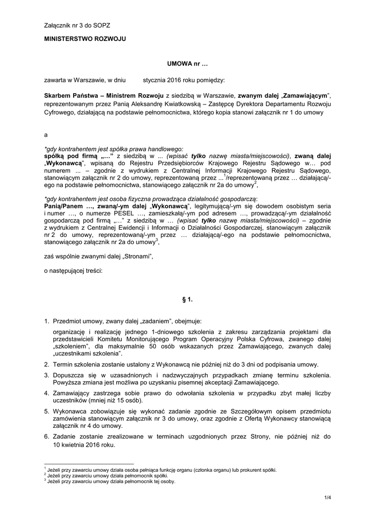 Załącznik nr 3 do SOPZ MINISTERSTWO ROZWOJU UMOWA nr … zawarta w Warszawie, w dniu stycznia 2016 roku pomiędzy: Skarbem Państwa – Ministrem Rozwoju z siedzibą w Warszawie, zwanym dalej „Zamawiającym”, reprezentowanym przez Panią Aleksandrę Kwiatkowską – Zastępcę Dyrektora Departamentu Rozwoju Cyfrowego, działającą na podstawie pełnomocnictwa, którego kopia stanowi załącznik nr 1 do umowy a *gdy kontrahentem jest spółka prawa handlowego: spółką pod firmą „…” z siedzibą w ... (wpisać tylko nazwę miasta/miejscowości), zwaną dalej „Wykonawcą”, wpisaną do Rejestru Przedsiębiorców Krajowego Rejestru Sądowego w… pod numerem ... – zgodnie z wydrukiem z Centralnej Informacji Krajowego Rejestru Sądowego, 1 stanowiącym załącznik nr 2 do umowy, reprezentowaną przez ... /reprezentowaną przez … działającą/2 ego na podstawie pełnomocnictwa, stanowiącego załącznik nr 2a do umowy , *gdy kontrahentem jest osoba fizyczna prowadząca działalność gospodarczą: Panią/Panem …, zwaną/-ym dalej „Wykonawcą”, legitymującą/-ym się dowodem osobistym seria i numer …, o numerze PESEL …, zamieszkałą/-ym pod adresem …, prowadzącą/-ym działalność gospodarczą pod firmą „…” z siedzibą w … (wpisać tylko nazwę miasta/miejscowości) – zgodnie z wydrukiem z Centralnej Ewidencji i Informacji o Działalności Gospodarczej, stanowiącym załącznik nr 2 do umowy, reprezentowaną/-ym przez … działającą/-ego na podstawie pełnomocnictwa, 3 stanowiącego załącznik nr 2a do umowy , zaś wspólnie zwanymi dalej „Stronami”, o następującej treści: § 1. 1. Przedmiot umowy, zwany dalej „zadaniem”, obejmuje: organizację i realizację jednego 1-dniowego szkolenia z zakresu zarządzania projektami dla przedstawicieli Komitetu Monitorującego Program Operacyjny Polska Cyfrowa, zwanego dalej „szkoleniem”, dla maksymalnie 50 osób wskazanych przez Zamawiającego, zwanych dalej „uczestnikami szkolenia”. 2. Termin szkolenia zostanie ustalony z Wykonawcą nie później niż do 3 dni od podpisania umowy. 3. Dopuszcza się w uzasadnionych i nadzwyczajnych przypadkach zmianę terminu szkolenia. Powyższa zmiana jest możliwa po uzyskaniu pisemnej akceptacji Zamawiającego. 4. Zamawiający zastrzega sobie prawo do odwołania szkolenia w przypadku zbyt małej liczby uczestników (mniej niż 15 osób). 5. Wykonawca zobowiązuje się wykonać zadanie zgodnie ze Szczegółowym opisem przedmiotu zamówienia stanowiącym załącznik nr 3 do umowy, oraz zgodnie z Ofertą Wykonawcy stanowiącą załącznik nr 4 do umowy. 6. Zadanie zostanie zrealizowane w terminach uzgodnionych przez Strony, nie później niż do 10 kwietnia 2016 roku. 1 Jeżeli przy zawarciu umowy działa osoba pełniąca funkcję organu (członka organu) lub prokurent spółki. Jeżeli przy zawarciu umowy działa pełnomocnik spółki. 3 Jeżeli przy zawarciu umowy działa pełnomocnik tej osoby. 2 1/4 Załącznik nr 3 do SOPZ § 2. 1. Strony uzgadniają, że za wykonanie zadania Wykonawca otrzyma wynagrodzenie w kwocie nie większej niż … (słownie: … 00/100) złotych netto powiększone o wartość podatku od towarów i usług według stawki …%, co daję kwotę …. zł brutto, zwane dalej „wynagrodzeniem”. 2. Z zastrzeżeniem ust. 3, ostateczna kwota wynagrodzenia będzie zależeć od rzeczywistej liczby uczestników szkolenia i zostanie obliczona według cennika zawartego w Ofercie Wykonawcy, zwanego dalej „cennikiem”, jako iloczyn rzeczywistej liczby uczestników szkolenia i jednostkowego kosztu uczestnika, który wynosi odpowiednio: ….. (słownie: ……… 00/100) złotych brutto. 3. Strony uzgadniają, że Zamawiający może zmniejszyć wskazaną w § 1 ust. 1 liczbę uczestników szkolenia, informując o tym Wykonawcę najpóźniej na 2 dni robocze przed rozpoczęciem szkolenia. Zgłoszenie zmniejszenia liczby uczestników szkolenia dokonane po terminie określonym w zdaniu poprzednim nie zostanie uwzględnione przy ustalaniu rzeczywistej liczby uczestników szkolenia. 4. Zapłata wynagrodzenia nastąpi przelewem na rachunek bankowy o numerze …, w terminie 14 dni od dnia doręczenia Zamawiającemu prawidłowo wystawionej faktury VAT. Podstawą wystawienia faktury VAT jest protokół sporządzony przez Zamawiającego zgodnie z § 5. Fakturę VAT należy doręczyć Zamawiającemu pod adres: Departament Rozwoju Cyfrowego Ministerstwo Rozwoju, pl. Trzech Krzyży 3/5, 00-507 Warszawa, NIP: 526-289-51-99. Zamawiający wyraża zgodę na przesłanie faktury w formie elektronicznej. Faktura zostanie wysłana z adresu mailowego Wykonawcy: ………………… na adres mailowy Zamawiającego: [email protected]. 5. Dniem zapłaty wynagrodzenia jest dzień wydania dyspozycji przelewu z rachunku bankowego Zamawiającego. 6. Za każdy dzień opóźnienia w zapłacie wynagrodzenia Wykonawca może żądać od Zamawiającego odsetek ustawowych. 7. Zamawiający nie wyraża zgody na przelew (cesję) wierzytelności Wykonawcy z tytułu realizacji niniejszej umowy na osoby trzecie. 8. Zadanie jest finansowane w 100% ze środków publicznych, w tym współfinansowane ze środków Unii Europejskiej w ramach Programu Operacyjnego Polska Cyfrowa 2014-2020. § 3. W ramach wynagrodzenia Wykonawca zobowiązuje się: 1. Przeprowadzić szkolenie 2. opracować merytorycznie, przygotować i wydrukować materiały szkoleniowe oraz wydać je wszystkim uczestnikom szkolenia. Materiały szkoleniowe oraz wszystkie pozostałe materiały muszą uwzględniać logotypy stosowane przy oznakowaniu projektów współfinansowanych ze Unii Europejskiej w ramach POPC 2014-2020, 3. poinformować uczestników szkolenia, że zadanie jest współfinansowane ze środków Unii Europejskiej w ramach POPC 2014-2020, 4. wystawić i wręczyć zaświadczenia o ukończeniu szkolenia wszystkim uczestnikom z odpowiednim oznakowaniem oraz informacją o współfinansowaniu szkolenia z